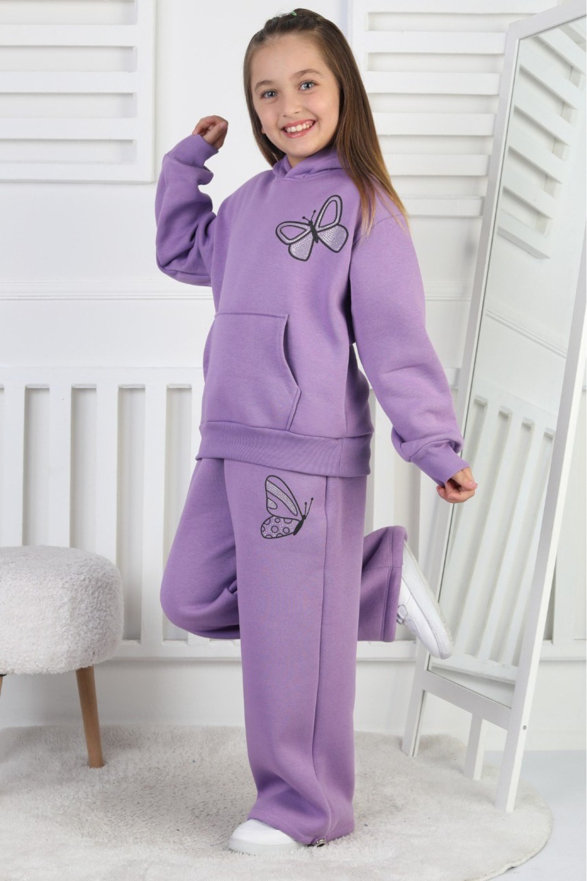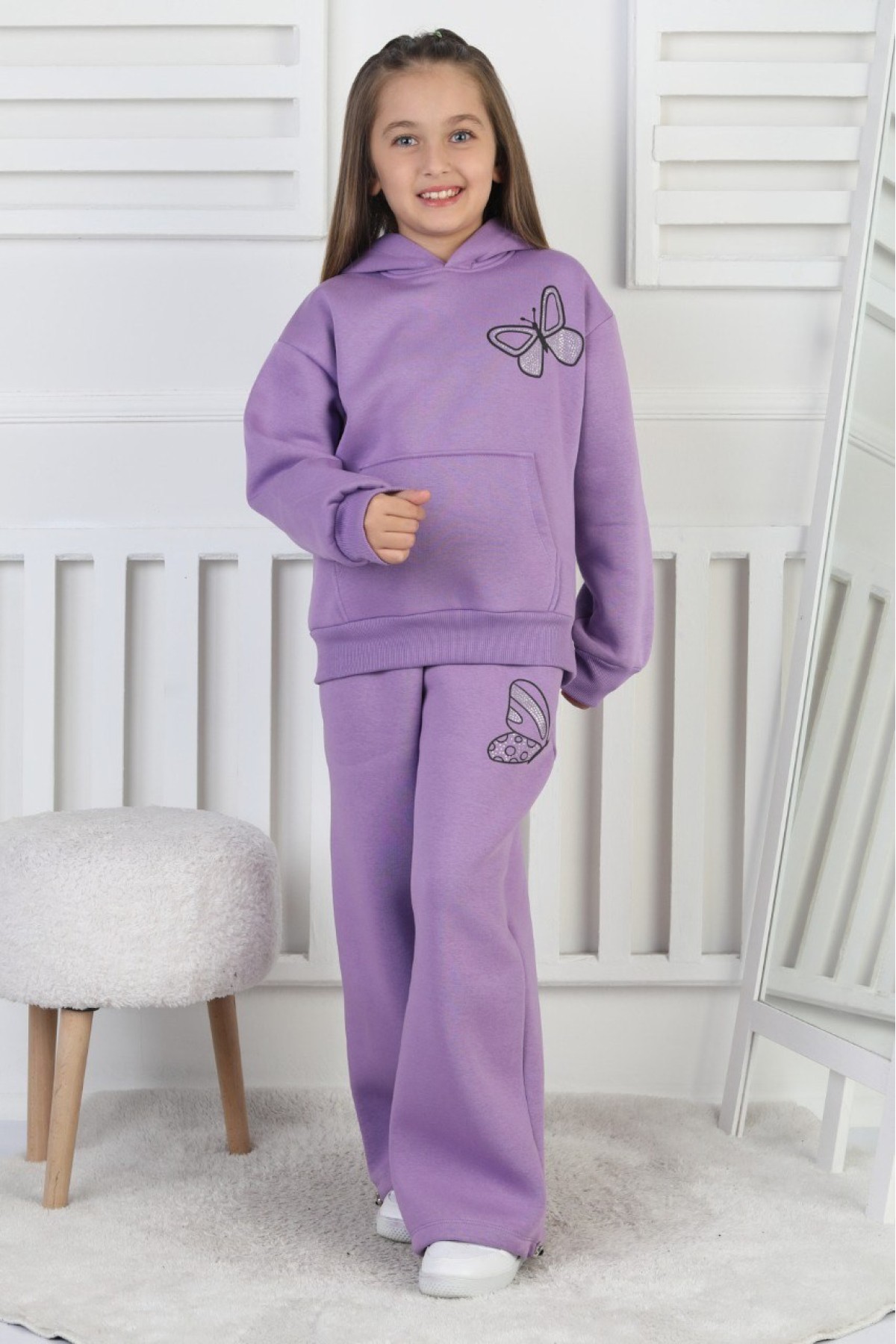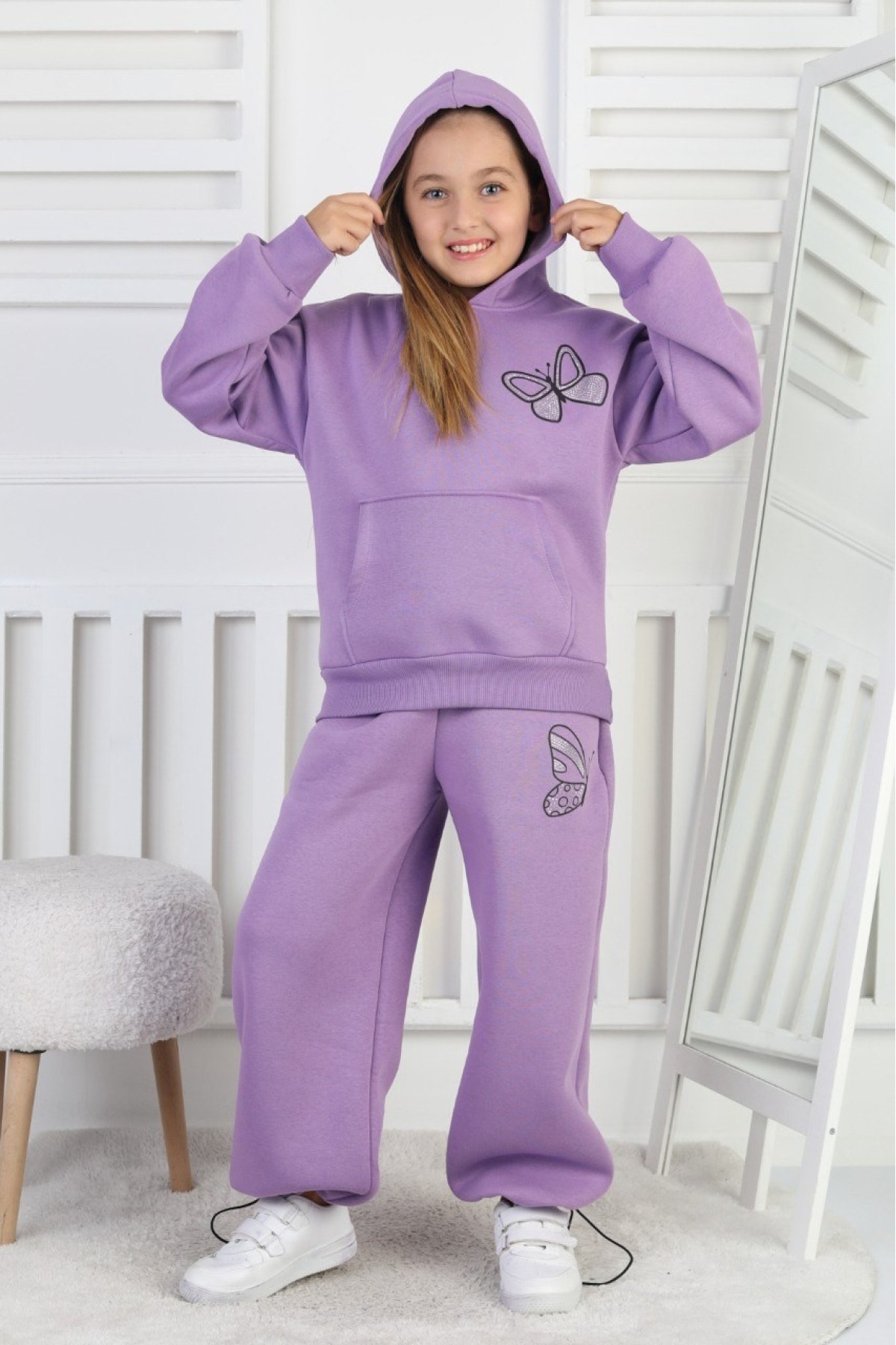Üç İplik Şardonlu Baskılı Kapüşonlu Kız Çocuk Takım