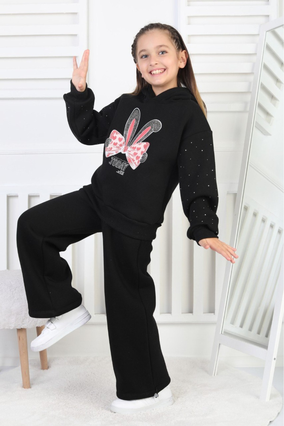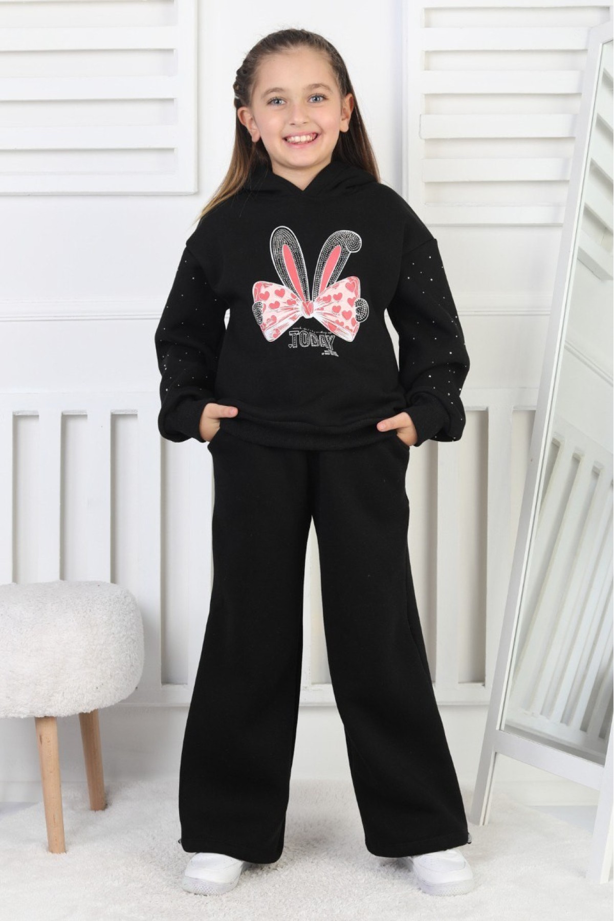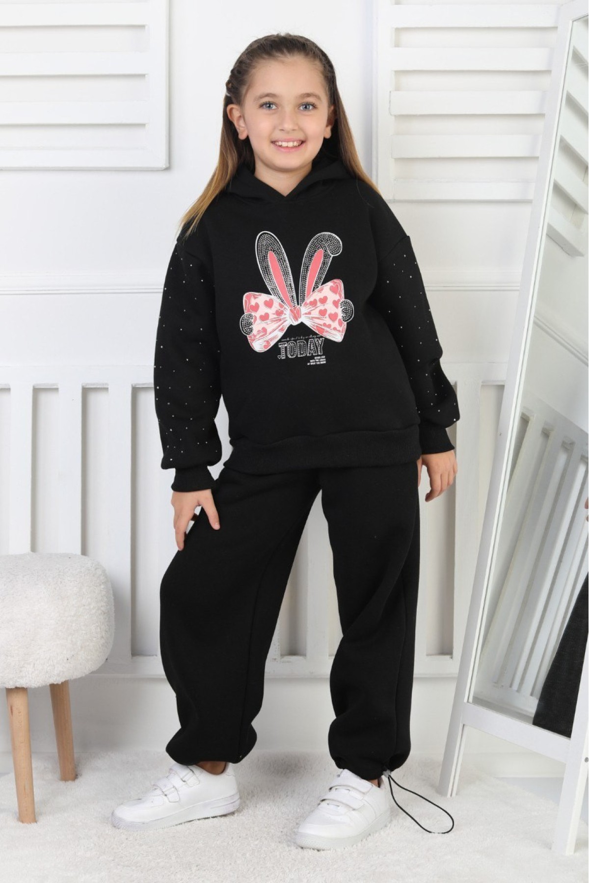 Üç İplik Şardonlu Baskılı Kapüşonlu Kız Çocuk Takım