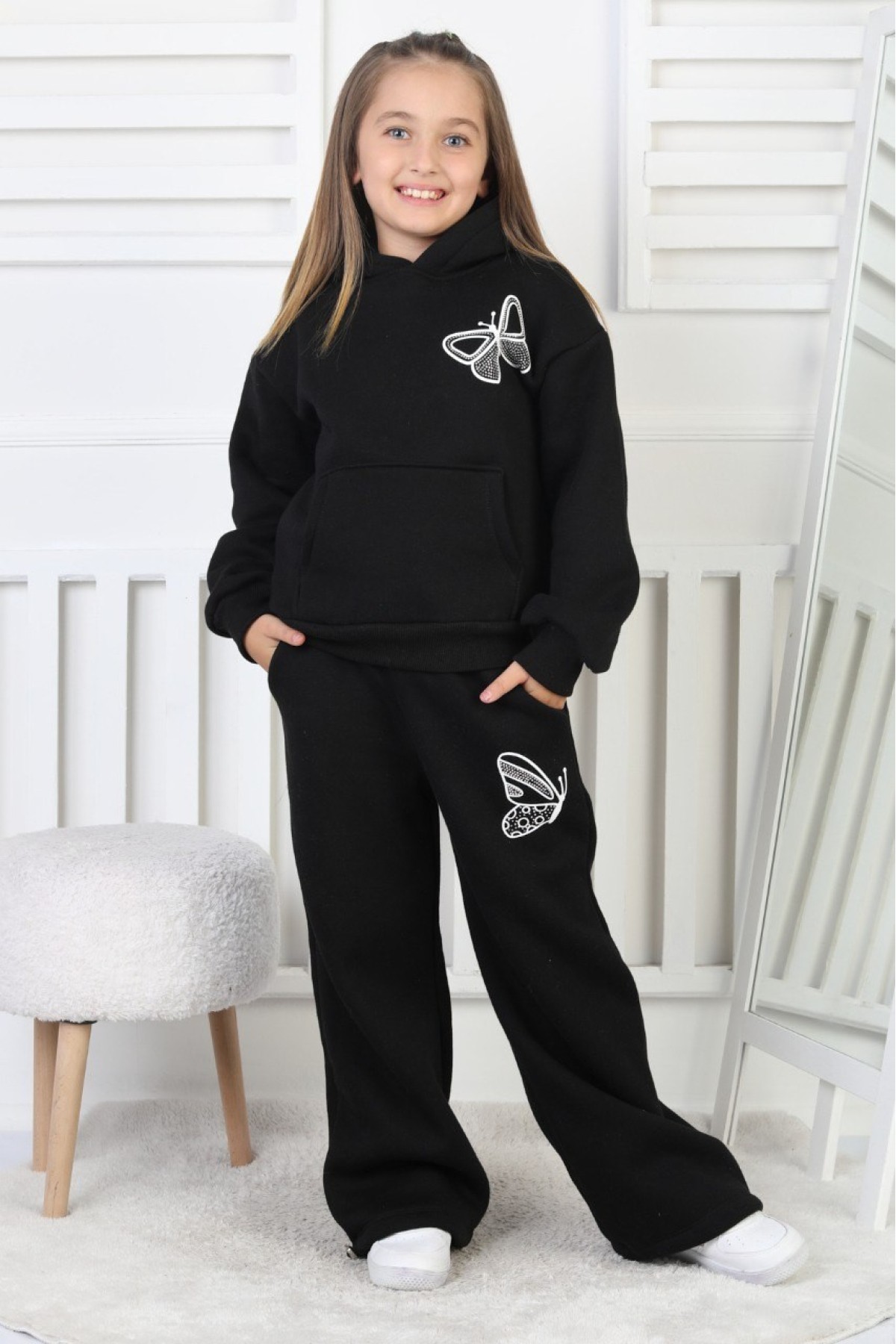 Üç İplik Şardonlu Baskılı Kapüşonlu Kız Çocuk Takım