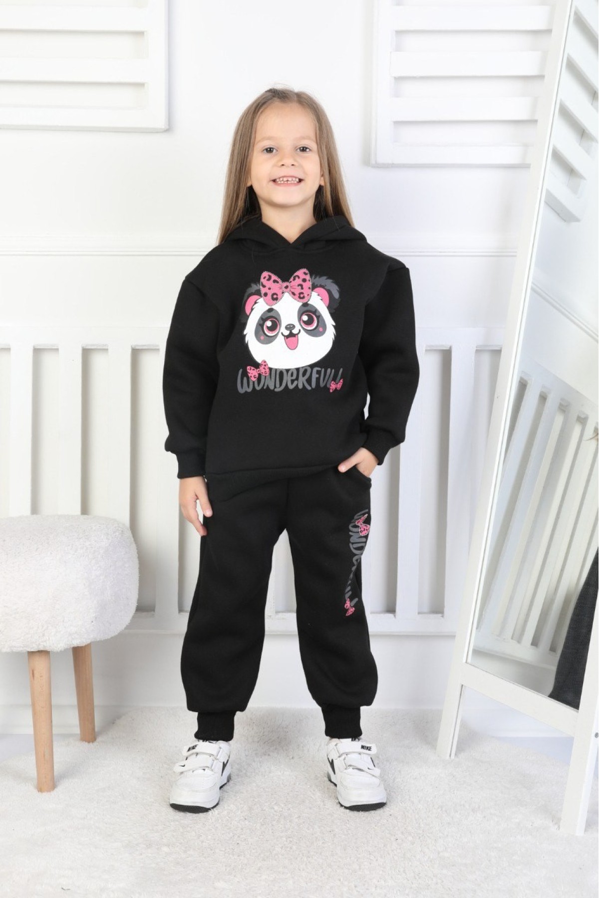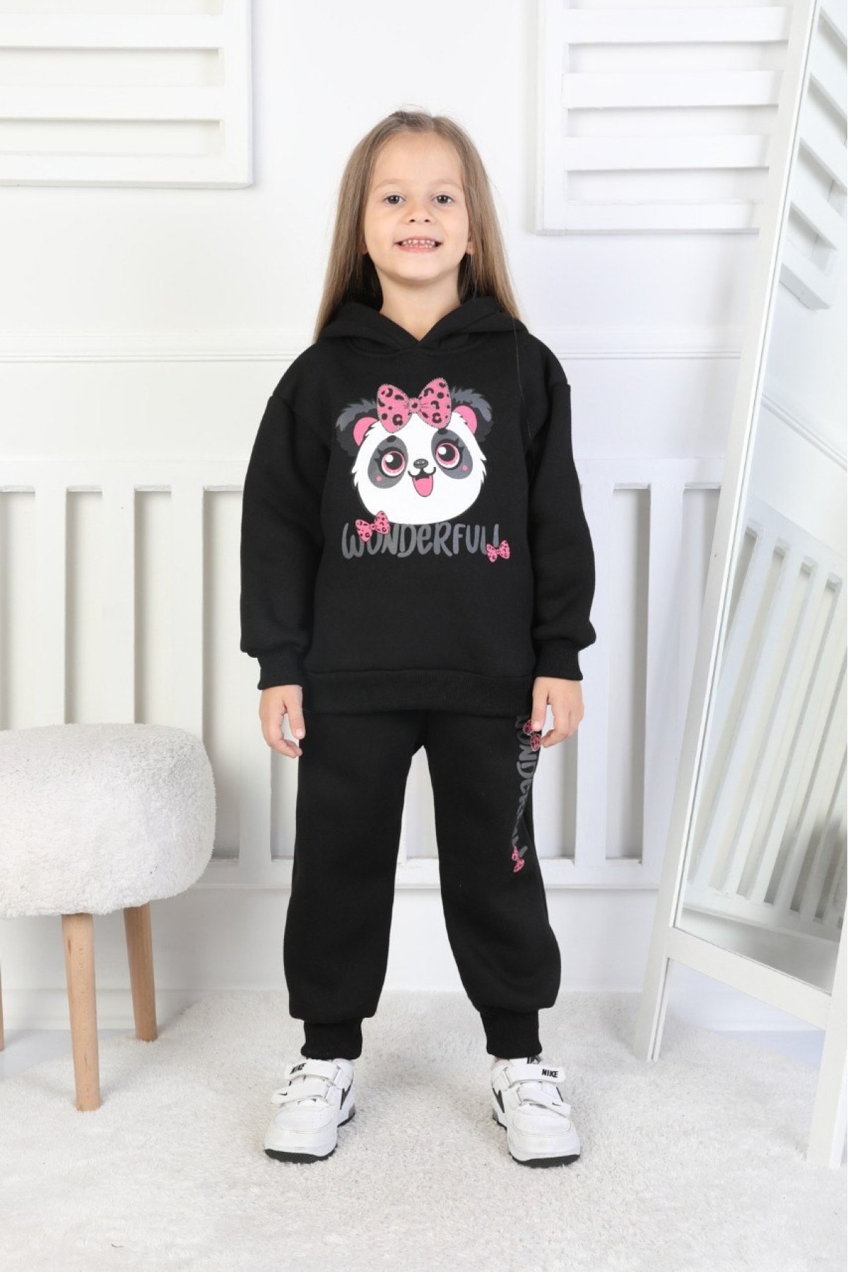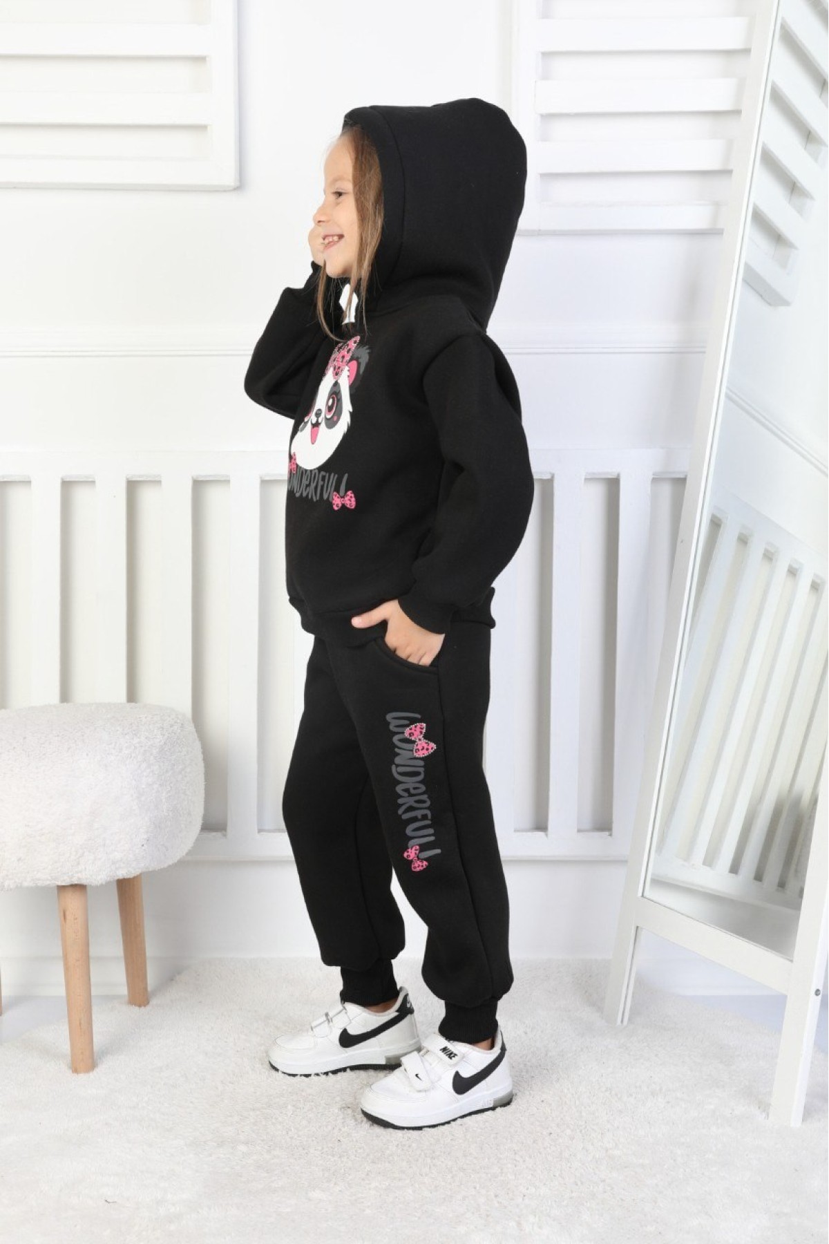 Üç İplik Şardonlu Baskılı Kapüşonlu Kız Çocuk Takım
