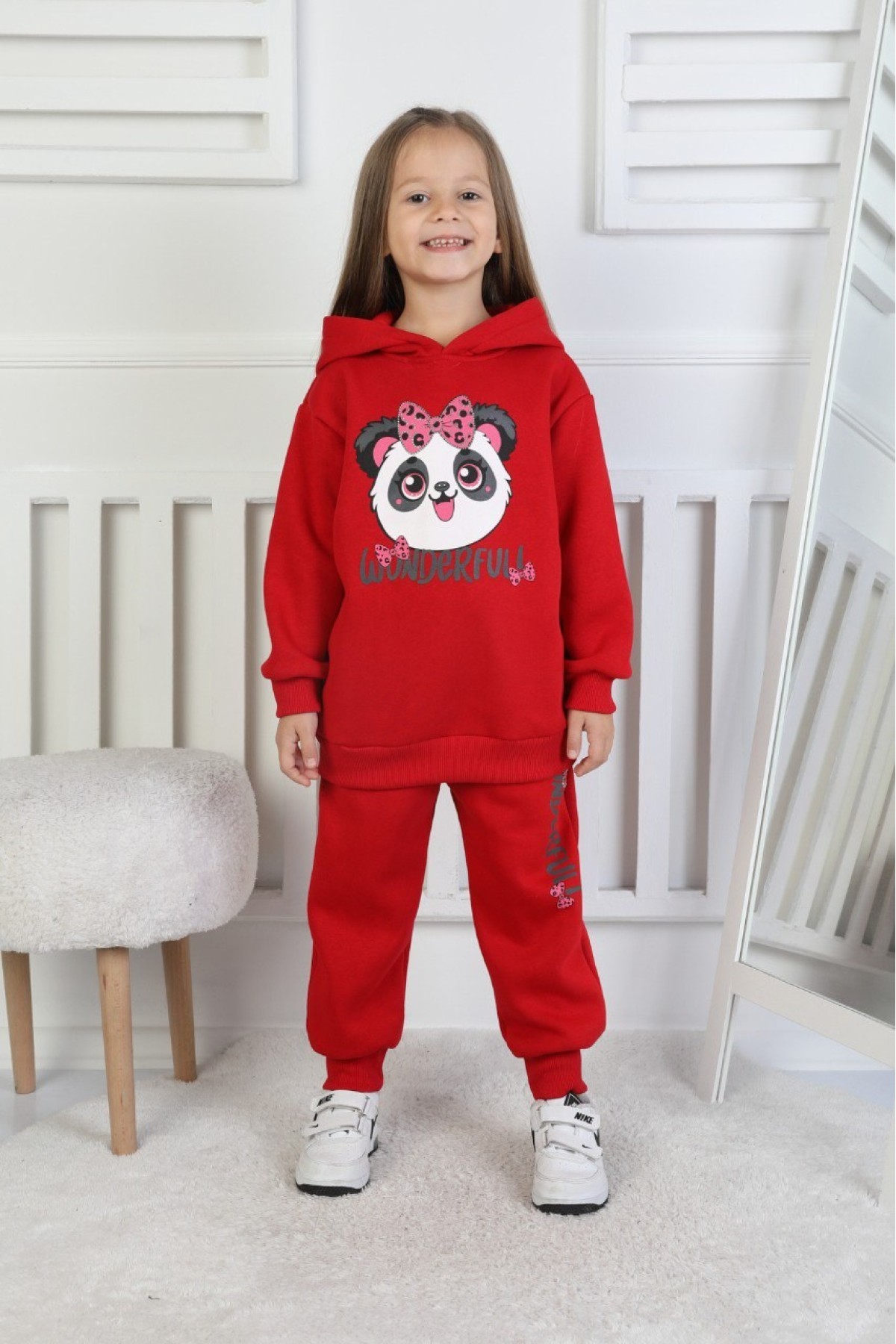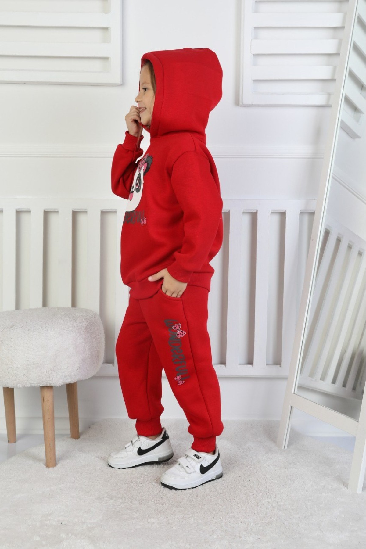 Üç İplik Şardonlu Baskılı Kapüşonlu Kız Çocuk Takım