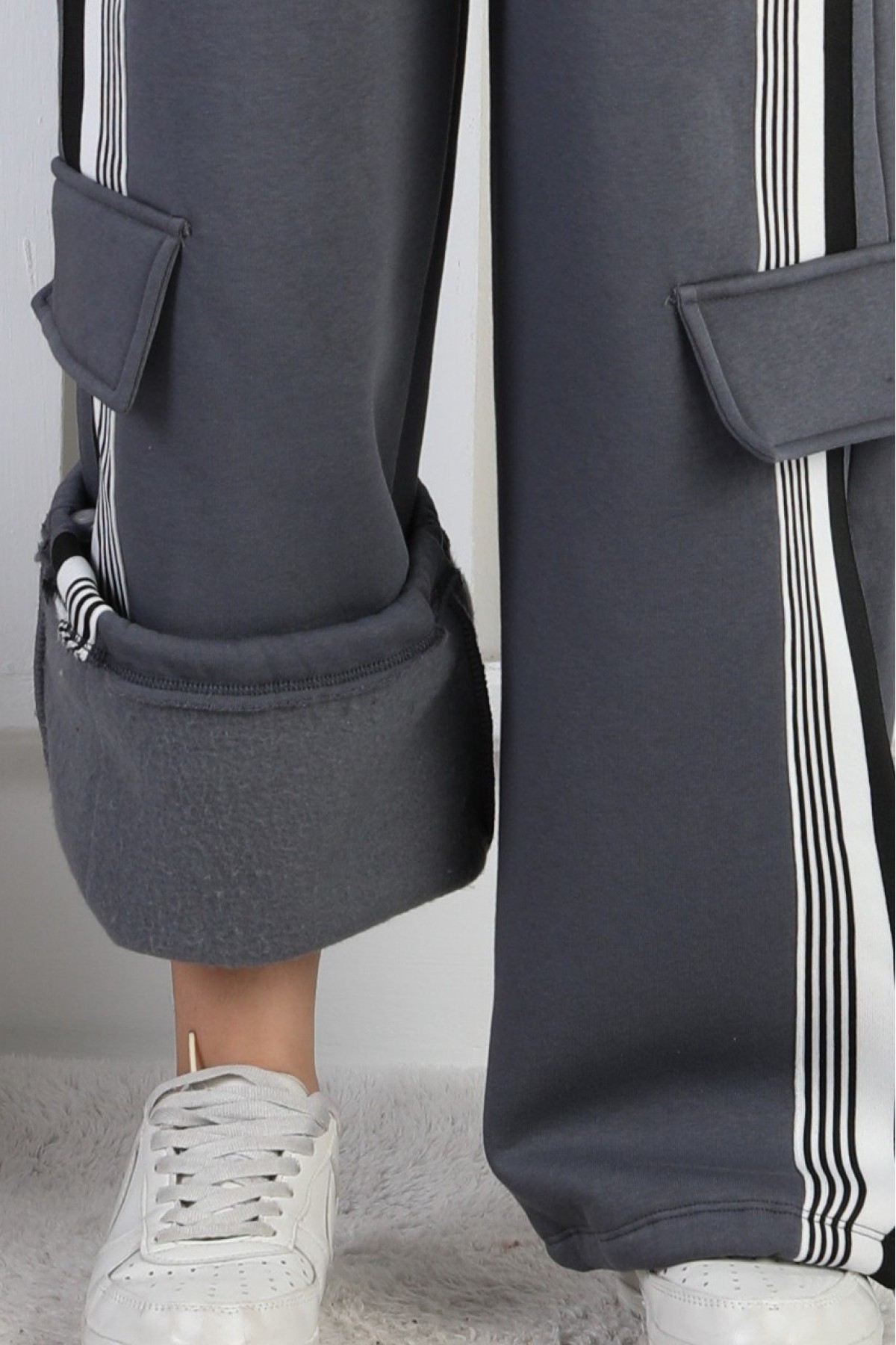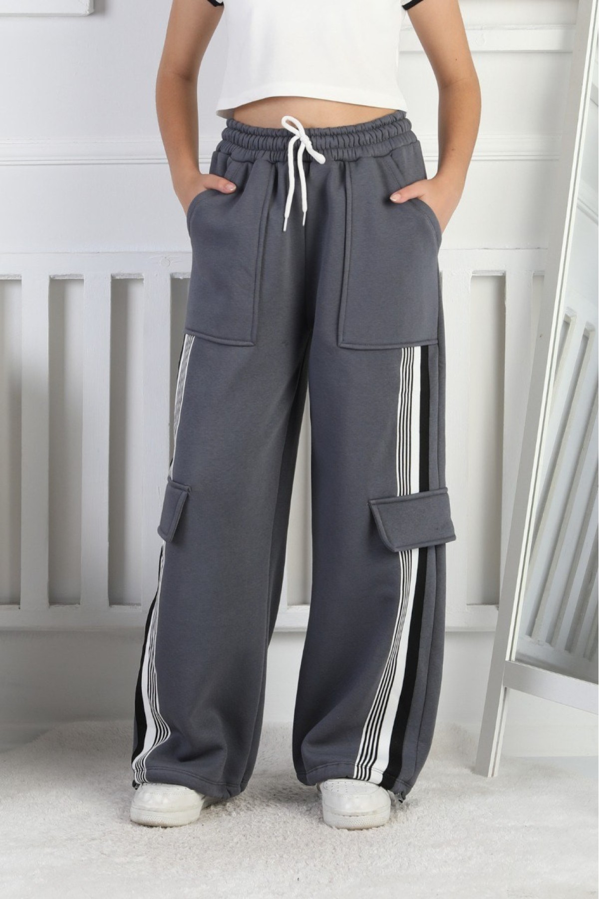 Üç İplik Şardonlu Kargo Çep Detaylı Bol Paça Kız Çocuk Eşofman Altı