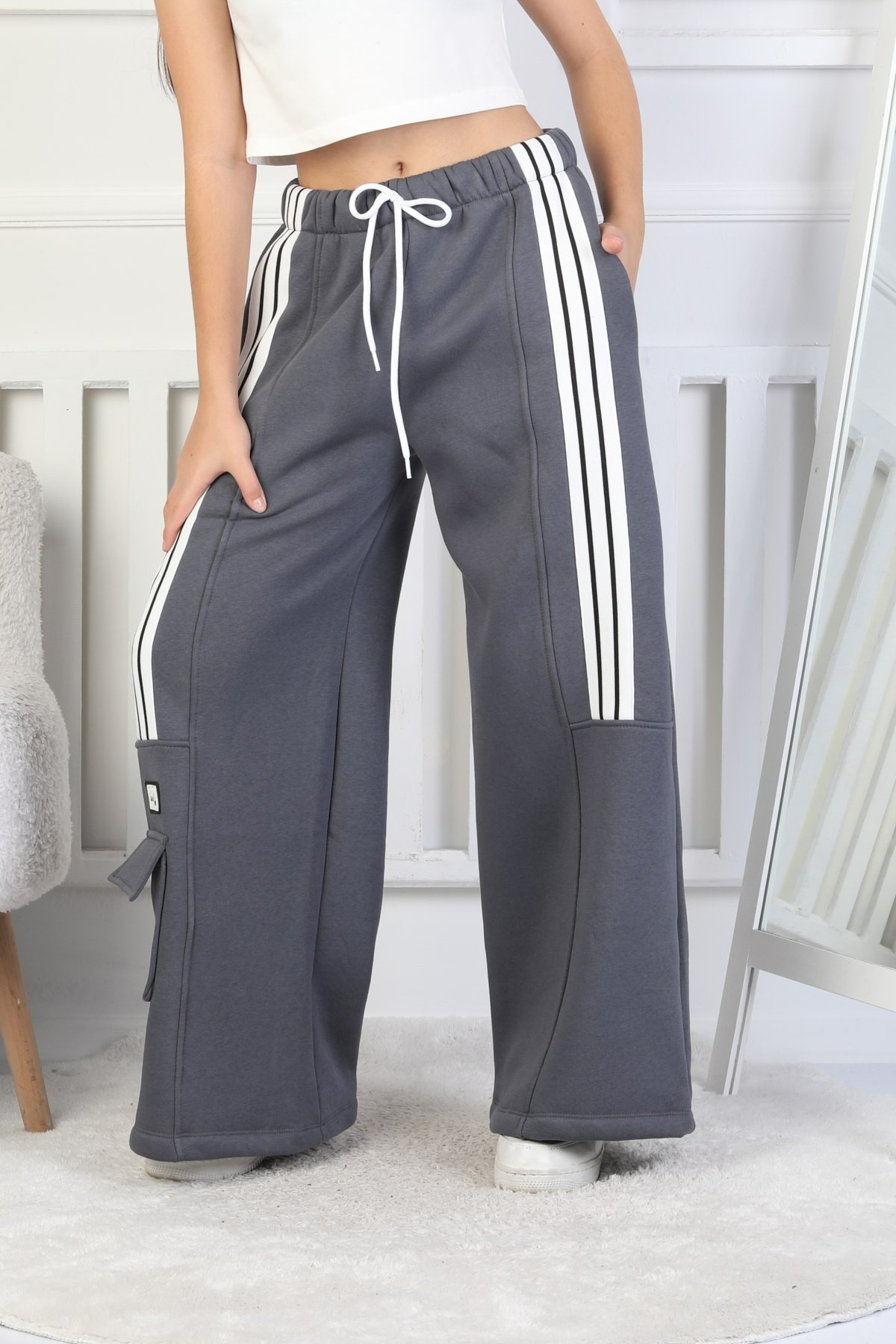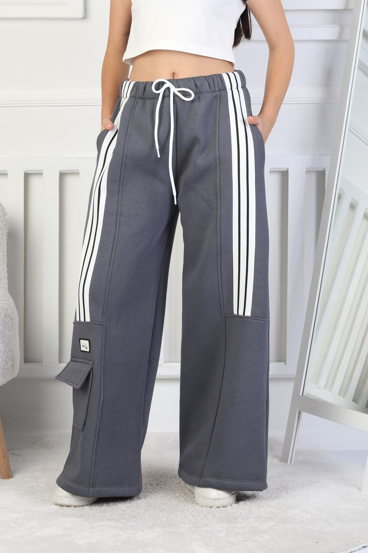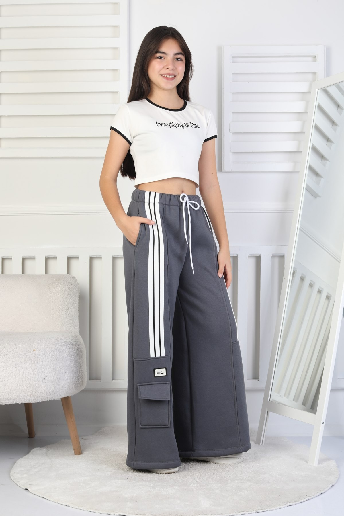 Üç İplik Şardonlu Çep Detaylı Bol Paça Kız Çocuk Eşofman Altı