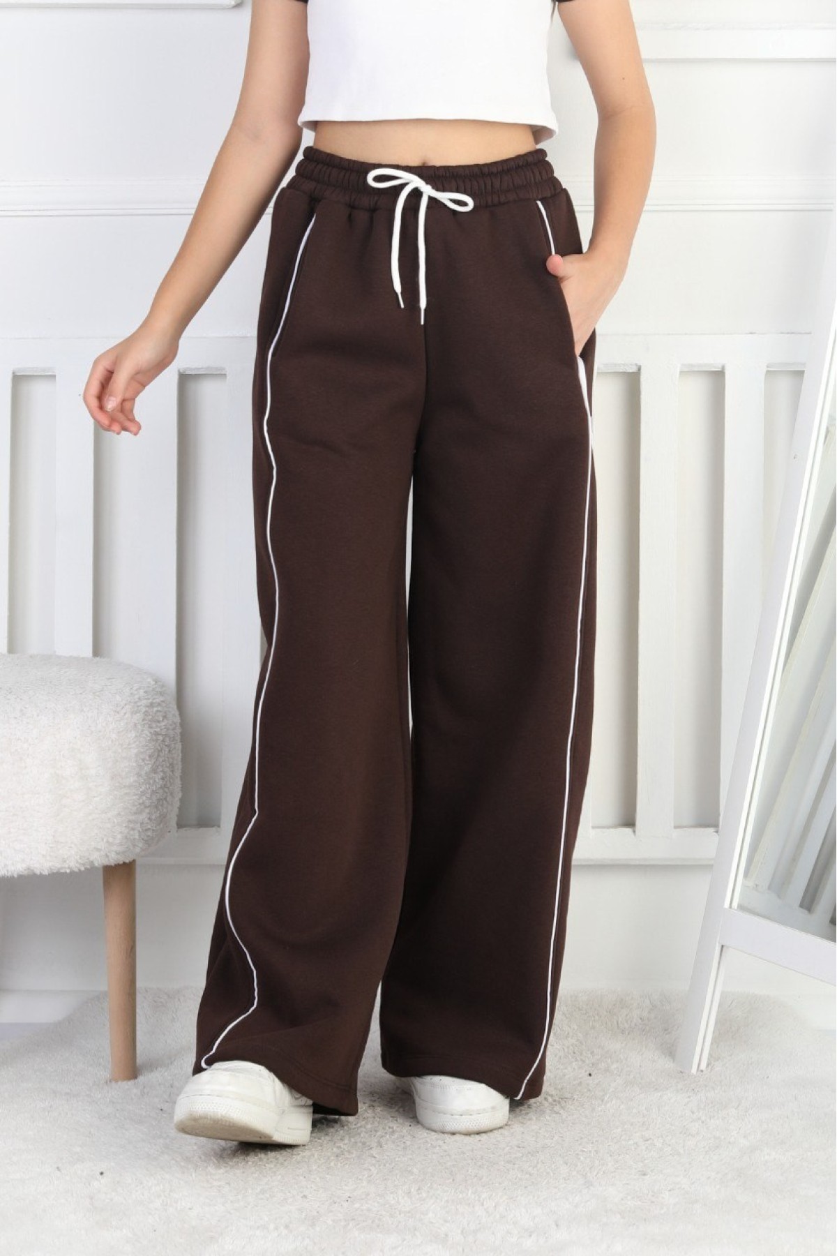 Üç İplik Şardonlu Bol Paça Tek Çizgi Kız Çocuk Eşofman Altı