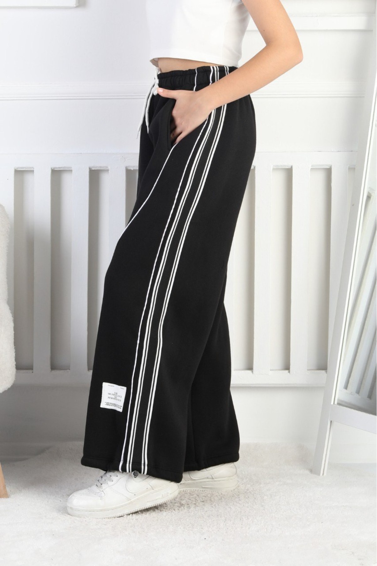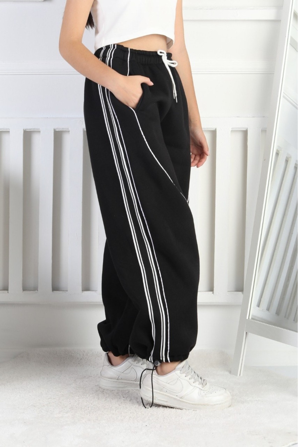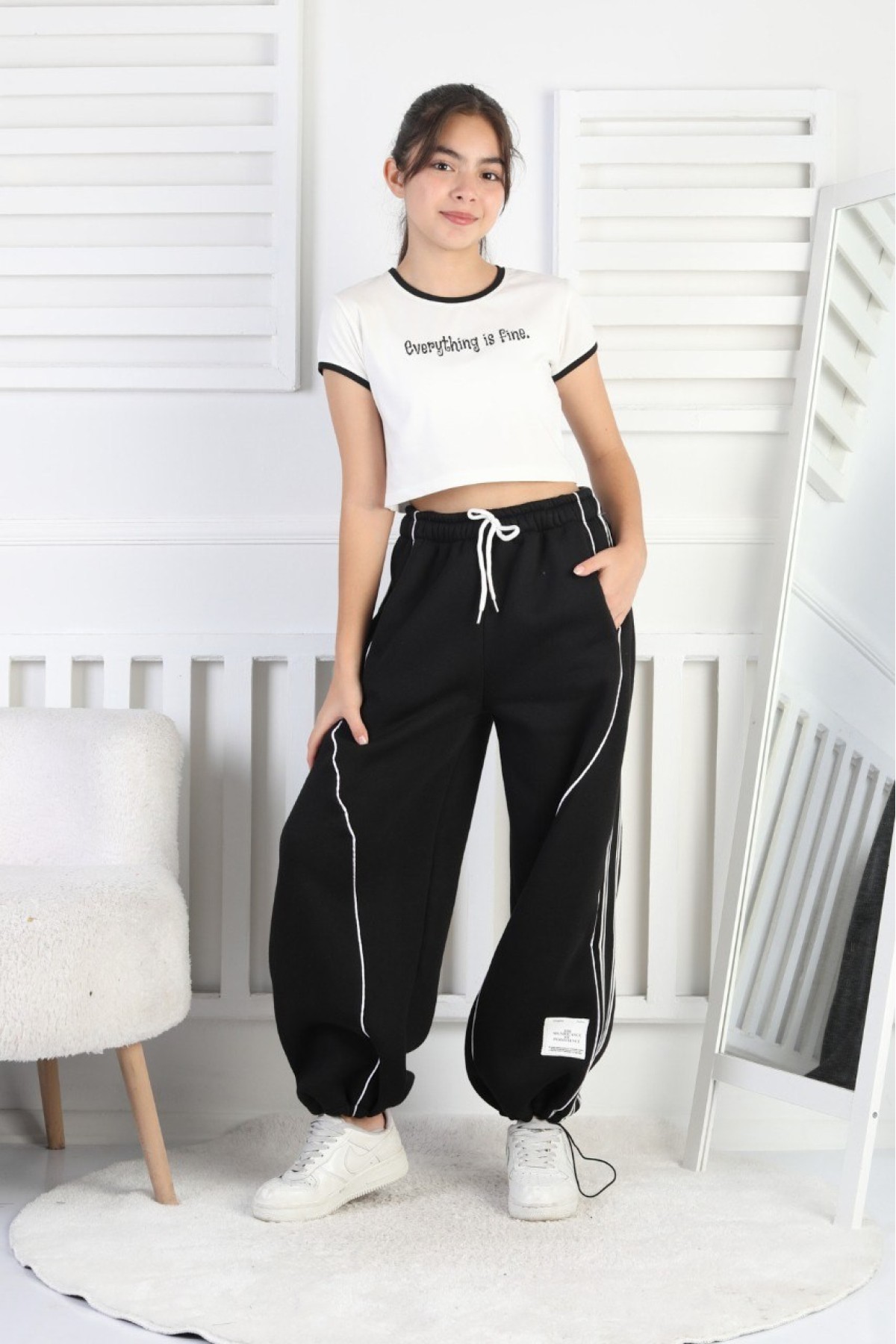 Üç İplik Şardonlu Çapraz Çizgili Bol Paça Kız Çocuk Eşofman Altı