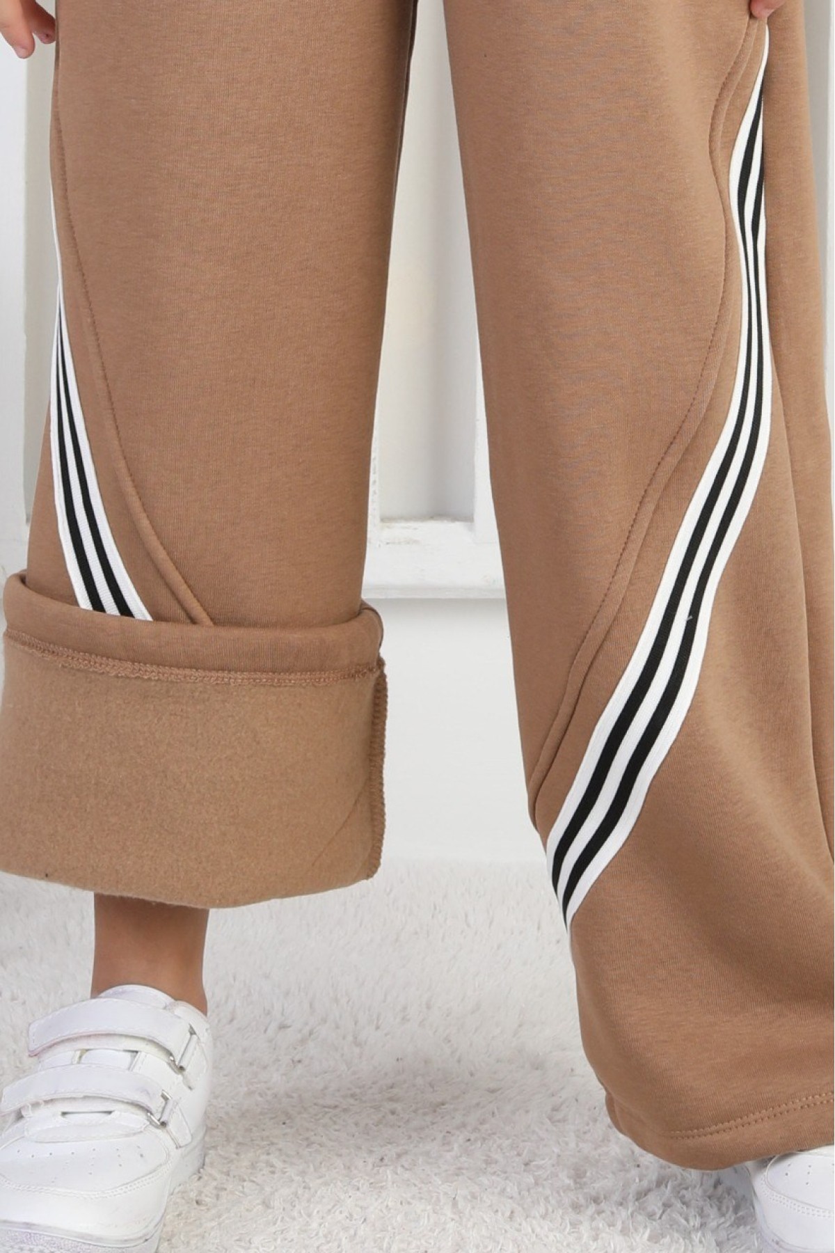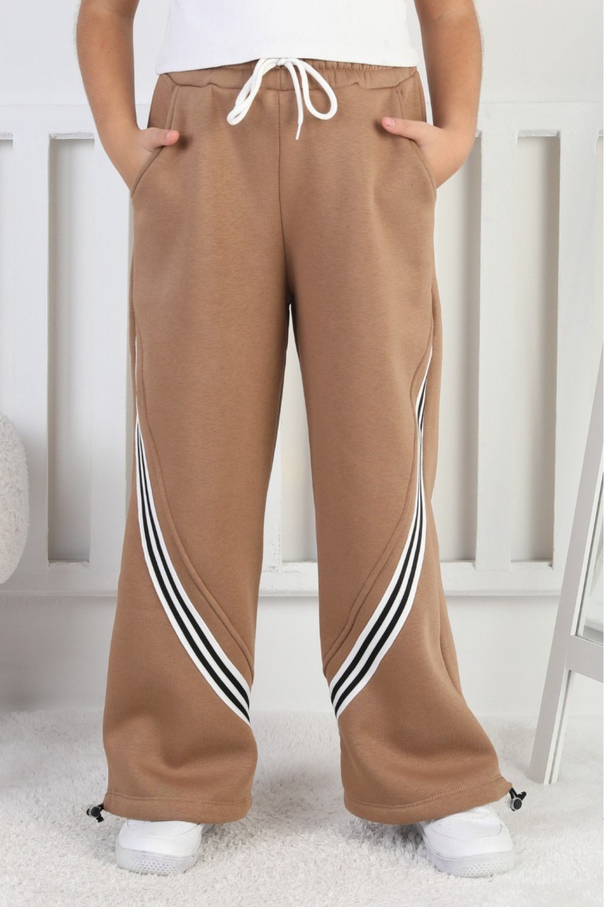 Üç İplik Şardonlu Öne Çizgili Bol Paça Kız Çocuk Eşofman Altı