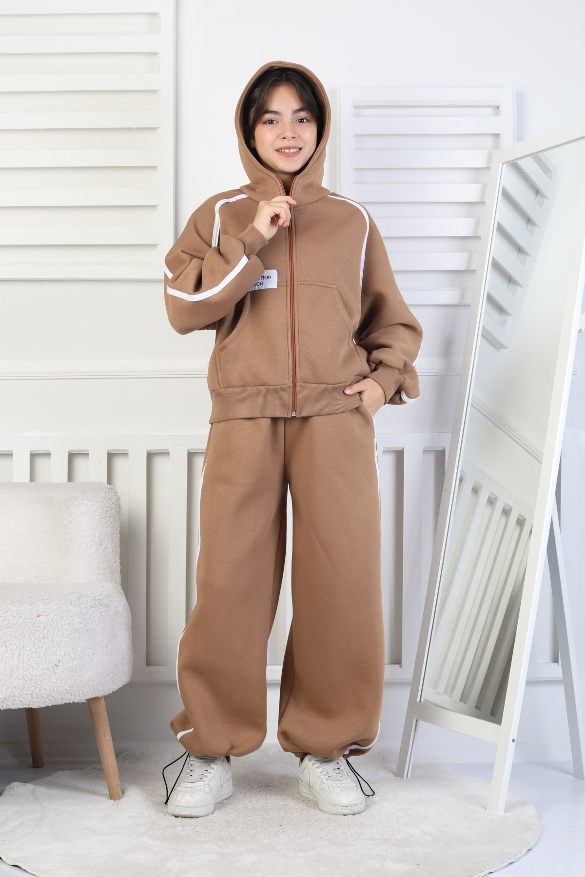 Üç İplik Şardonlu Fermuarlı Kapüşonlu Kız Çocuk Takım