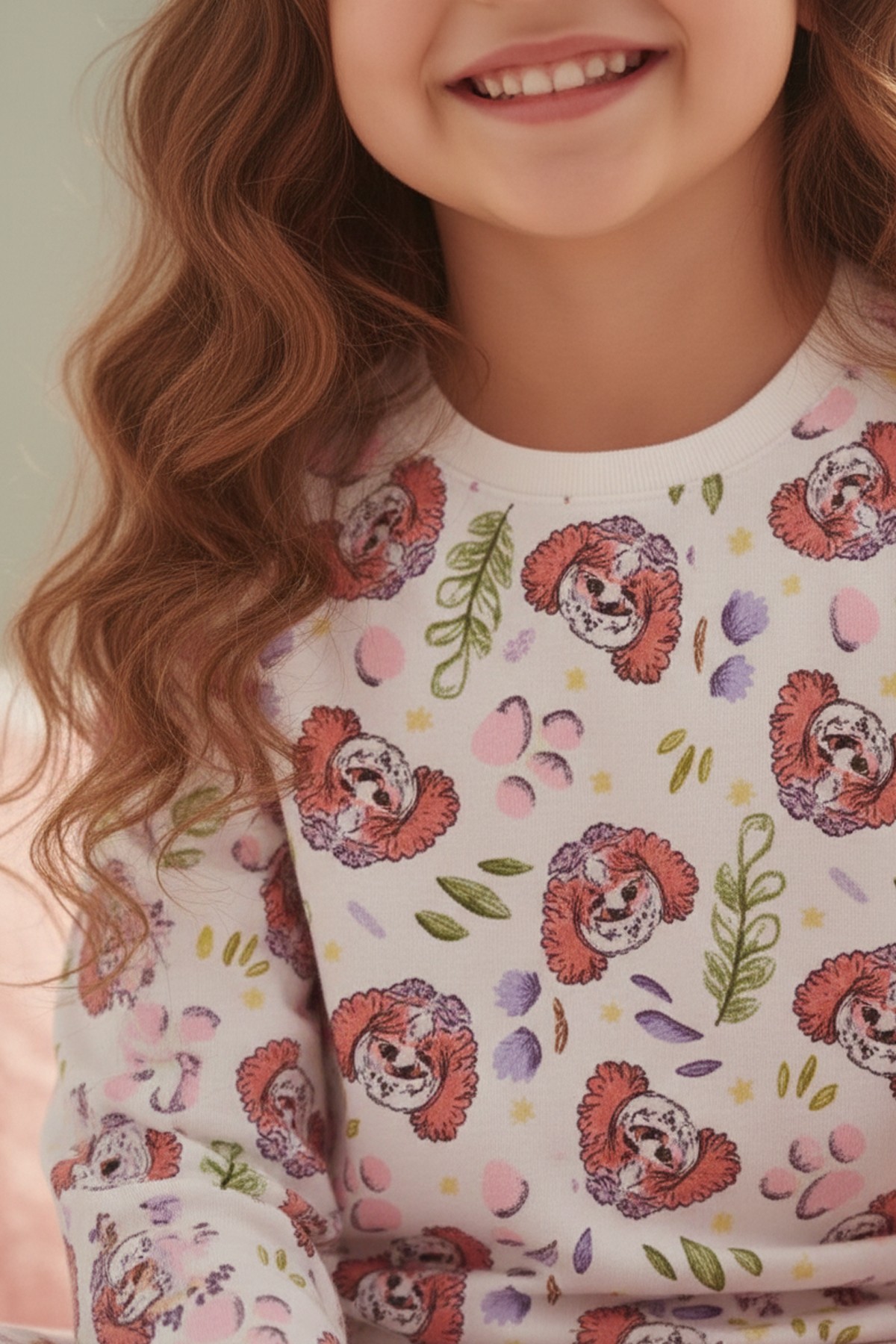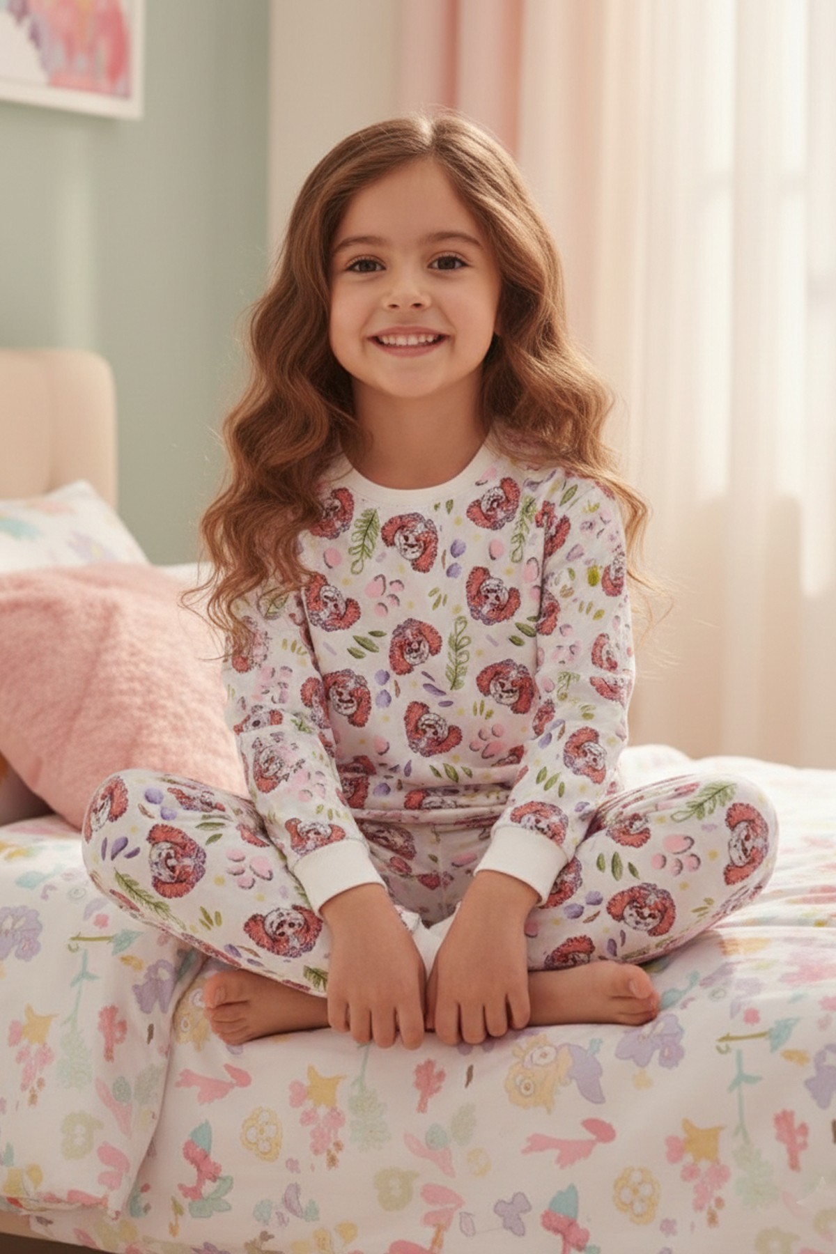 Kız Çocuk Köpek Desenli %100 Pamuk Reaktif Boyalı Süprem Kumaş Uzun Kollu Pijama Takımı