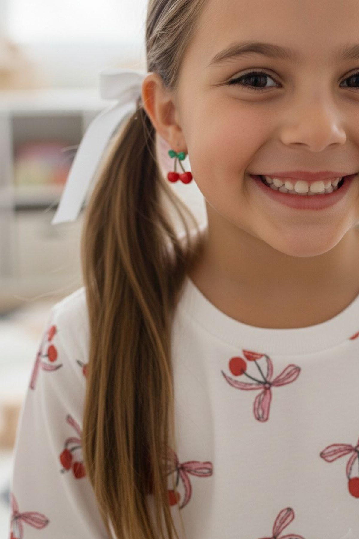 Kız Çocuk Kiraz Desenli %100 Pamuk Reaktif Boyalı Süprem Kumaş Uzun Kollu Pijama Takımı