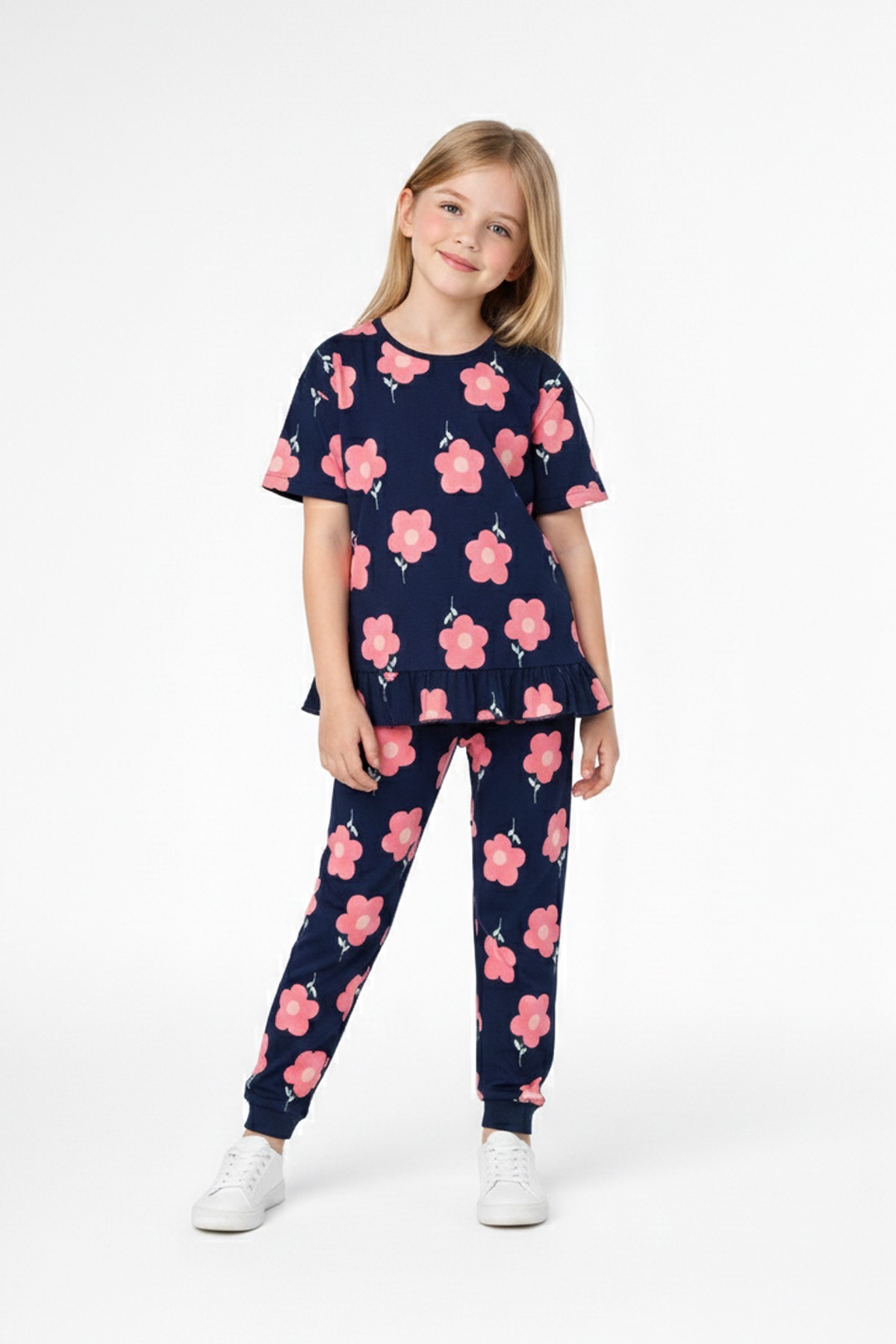 Kız Çocuk Çiçek Desenli %100 Pamuk Reaktif Boyalı Süprem Kumaş Kısa Kollu Pijama Takımı