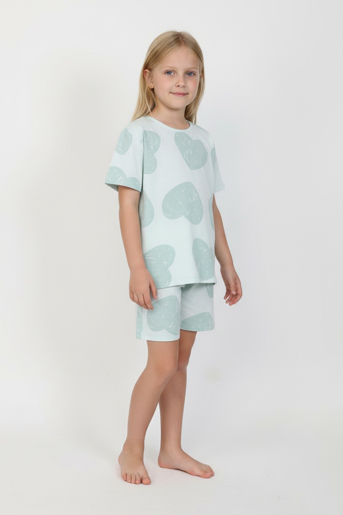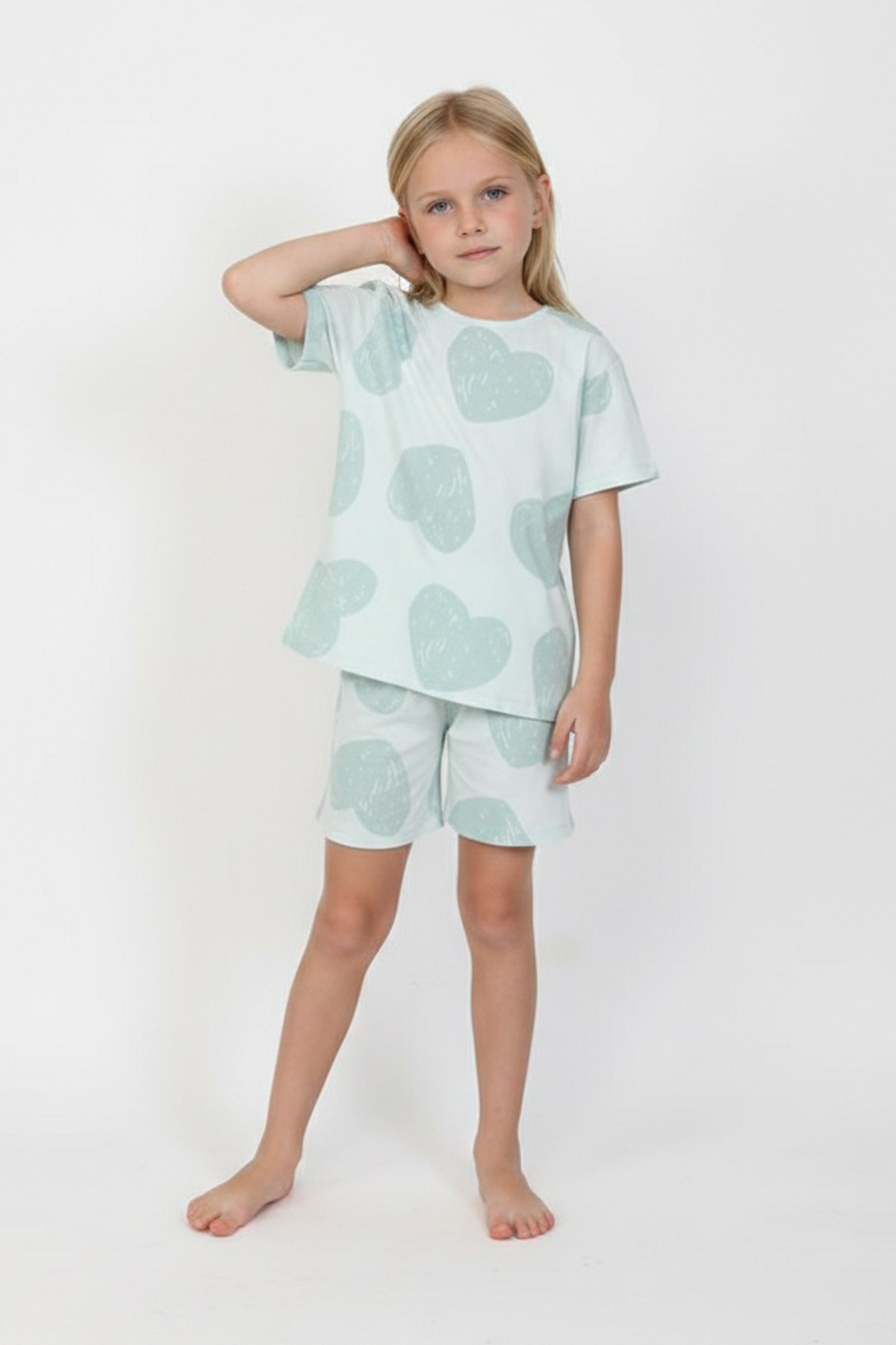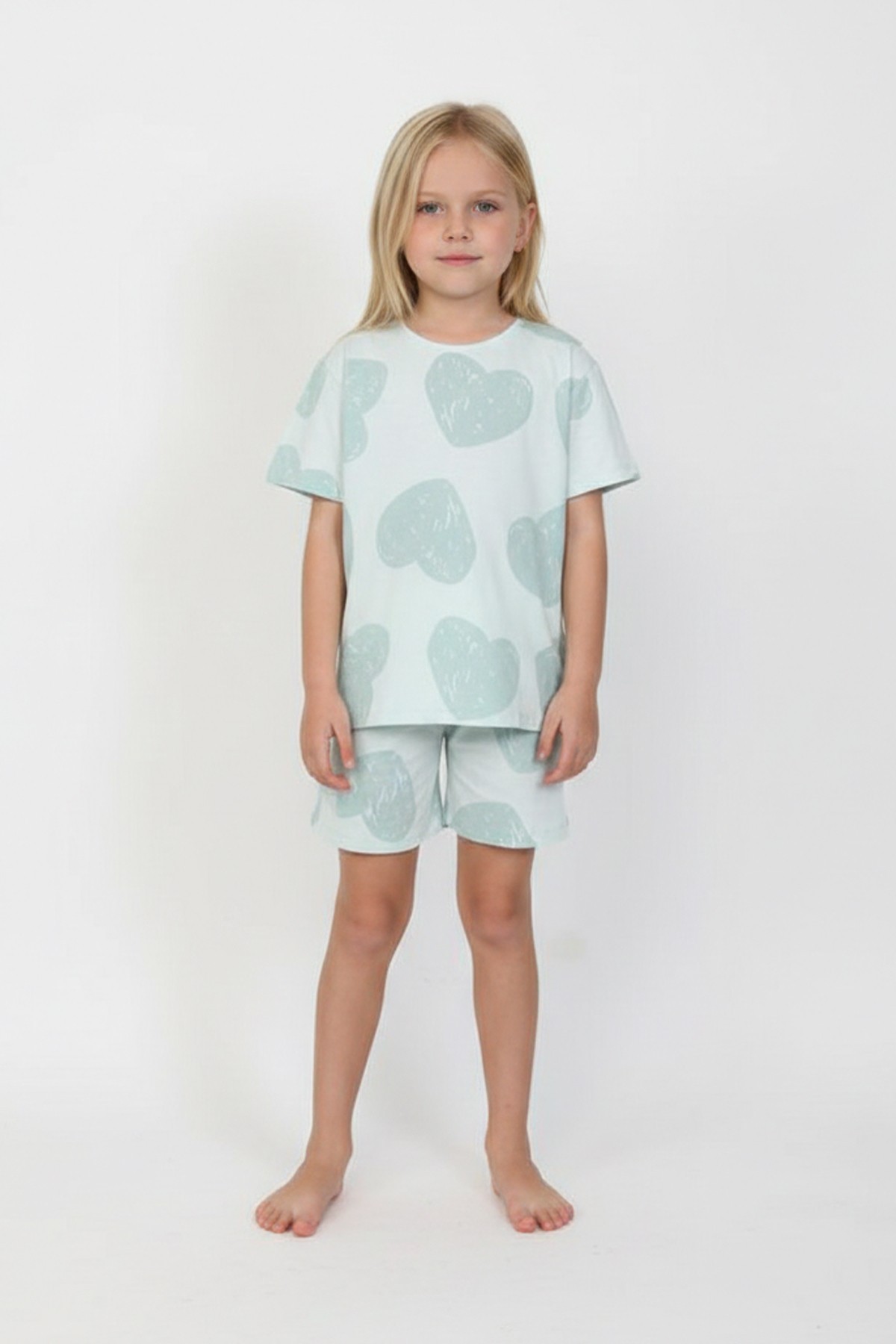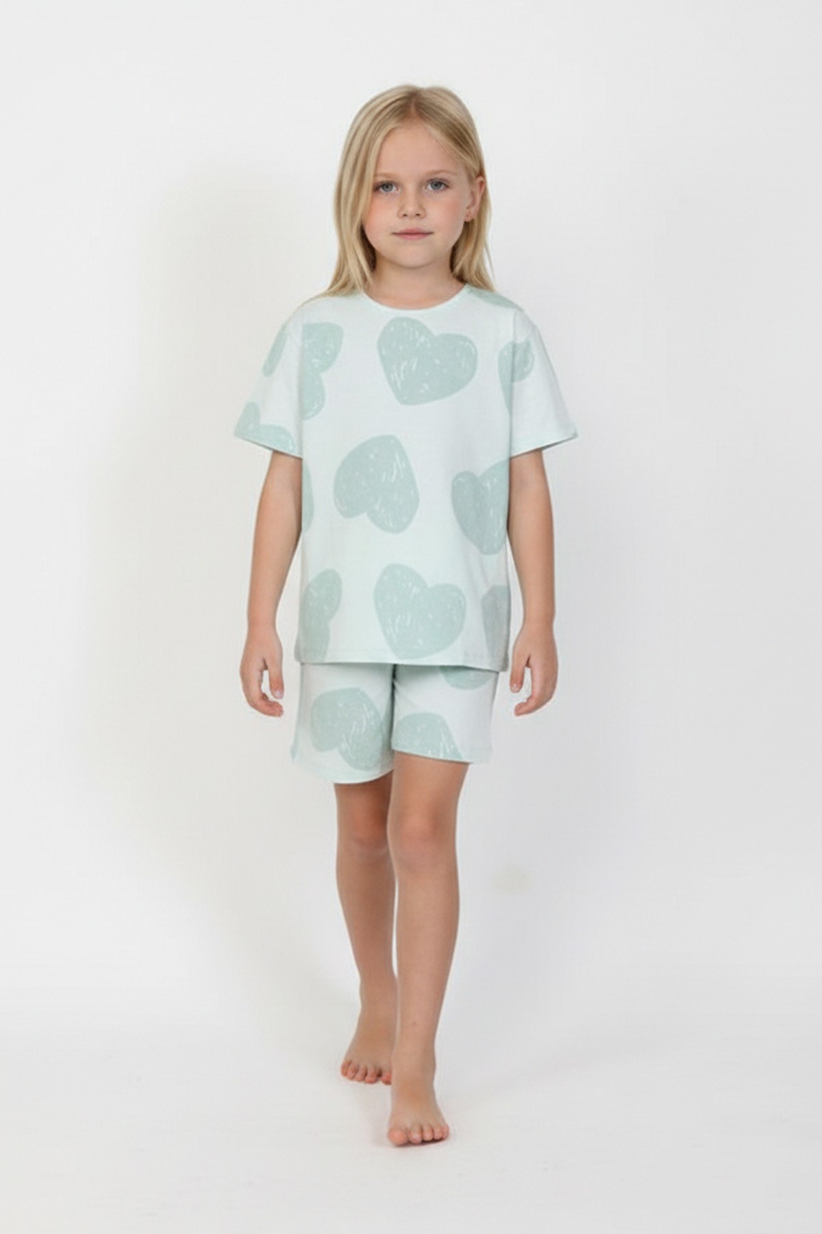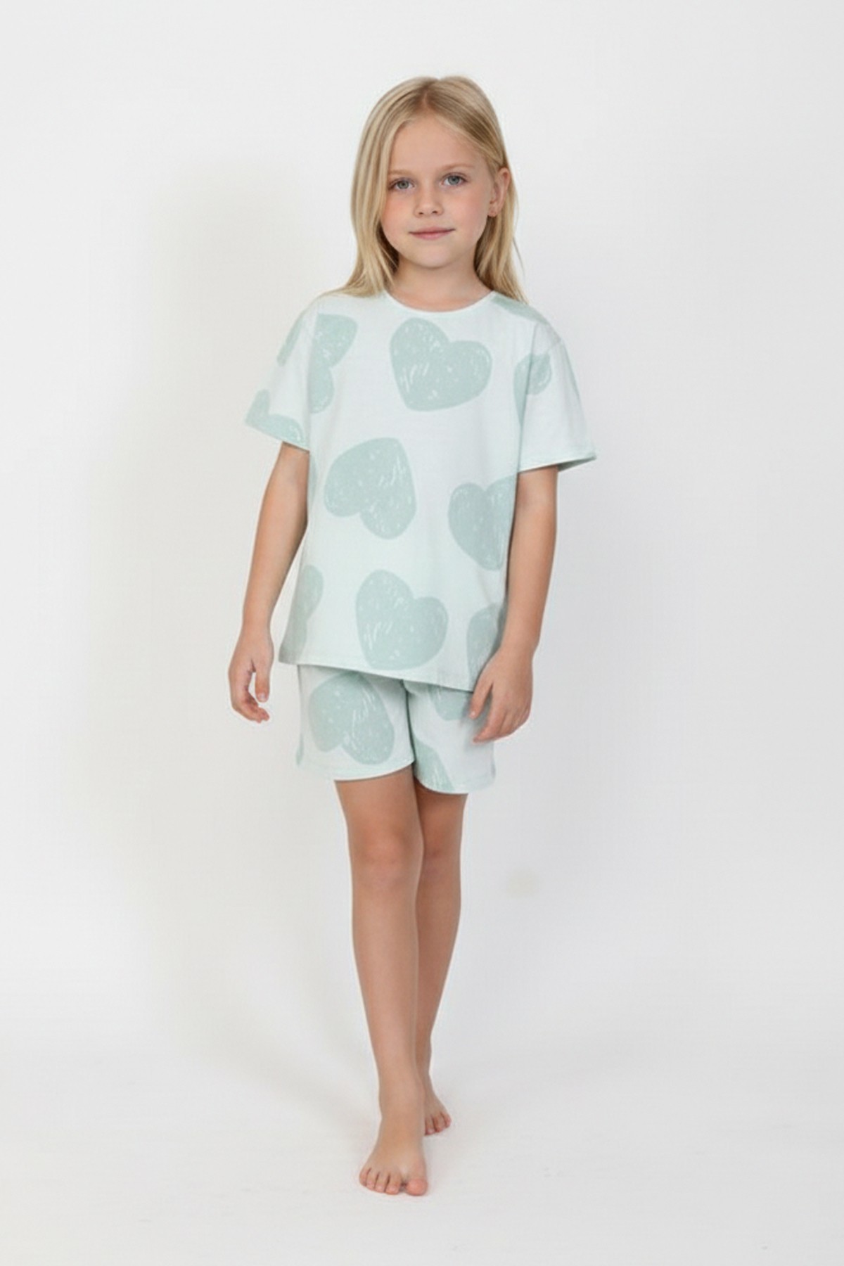 Kız Çocuk Yeşili Büyük Kalp Desenli %100 Pamuk Süprem Kumaş Kısa Kollu Pijama Takımı