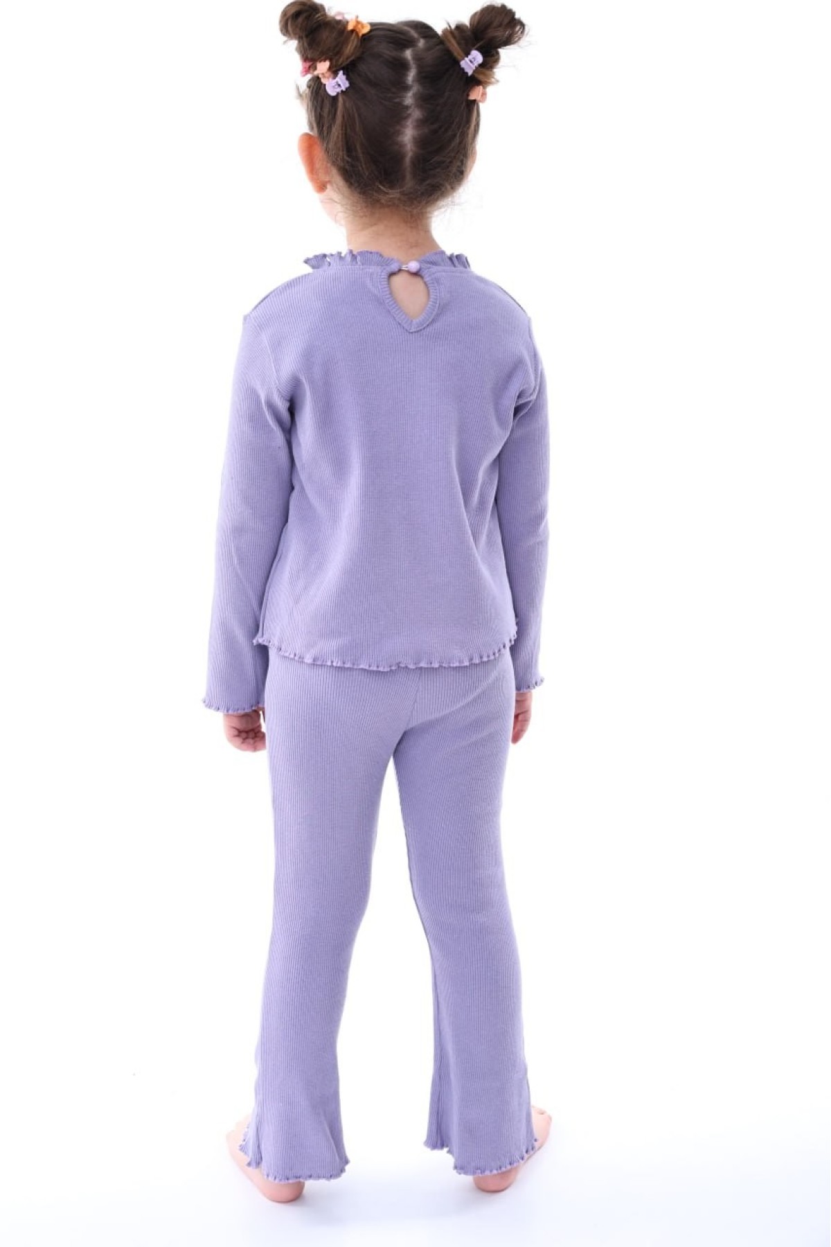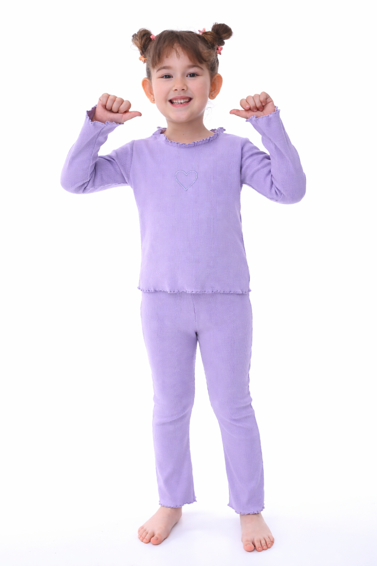 Kız Çocuk Fitilli Kumaş Kalp Nakışlı Uzun Kollu Takım