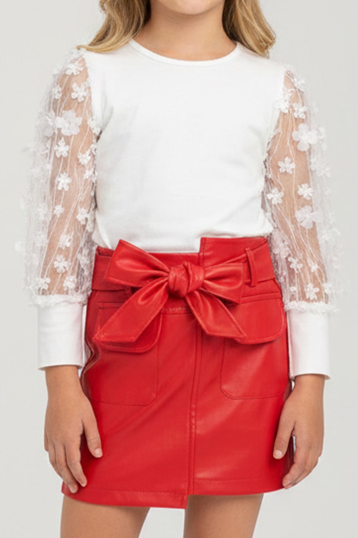 Kız Çocuk Danteli Kollu Bluz Ve Fiyonk Detaylı Deri Mini Etek Takımı