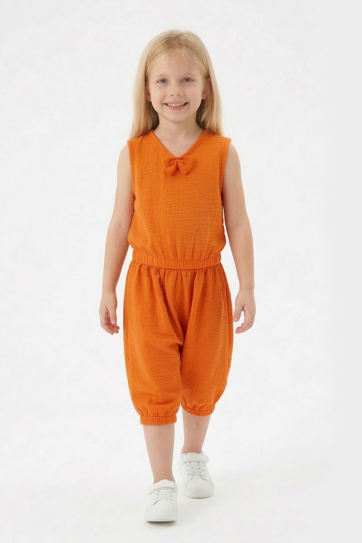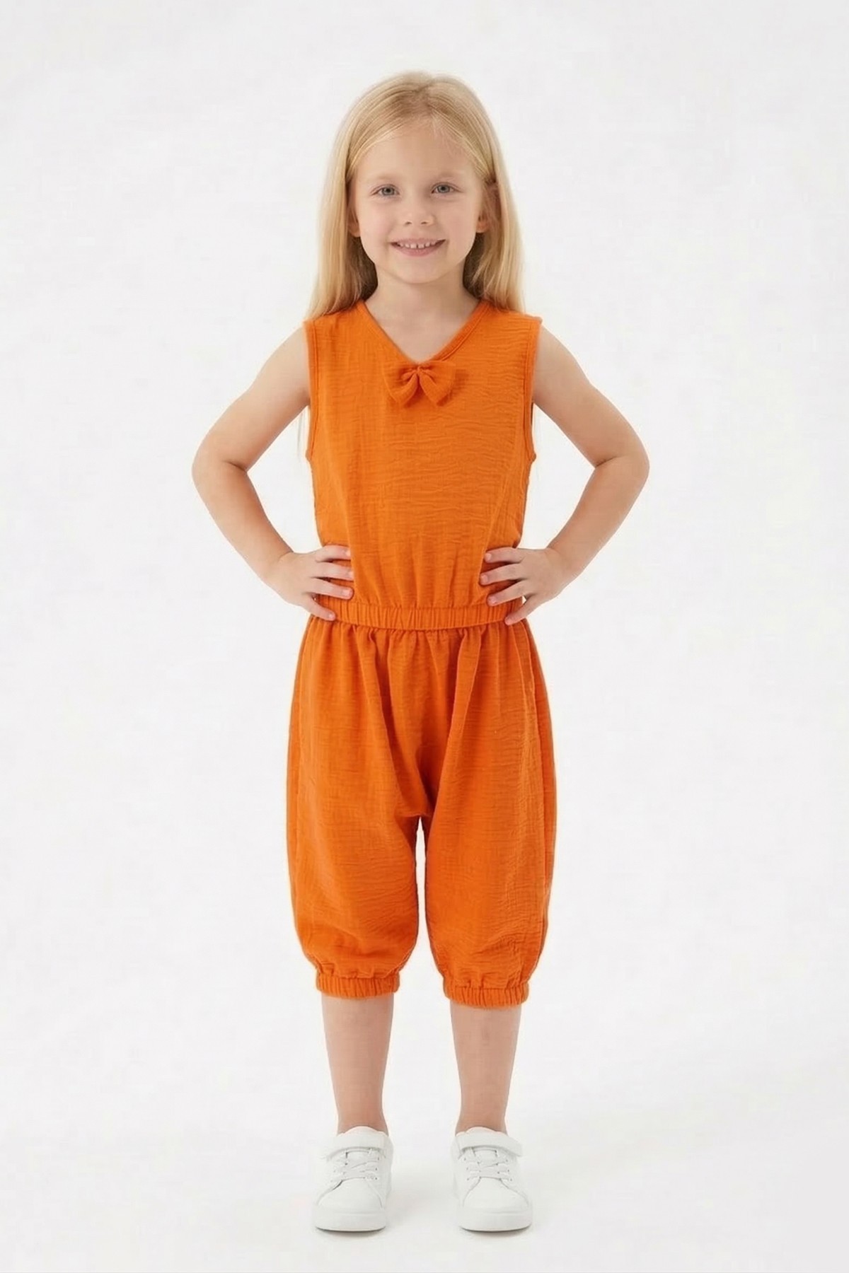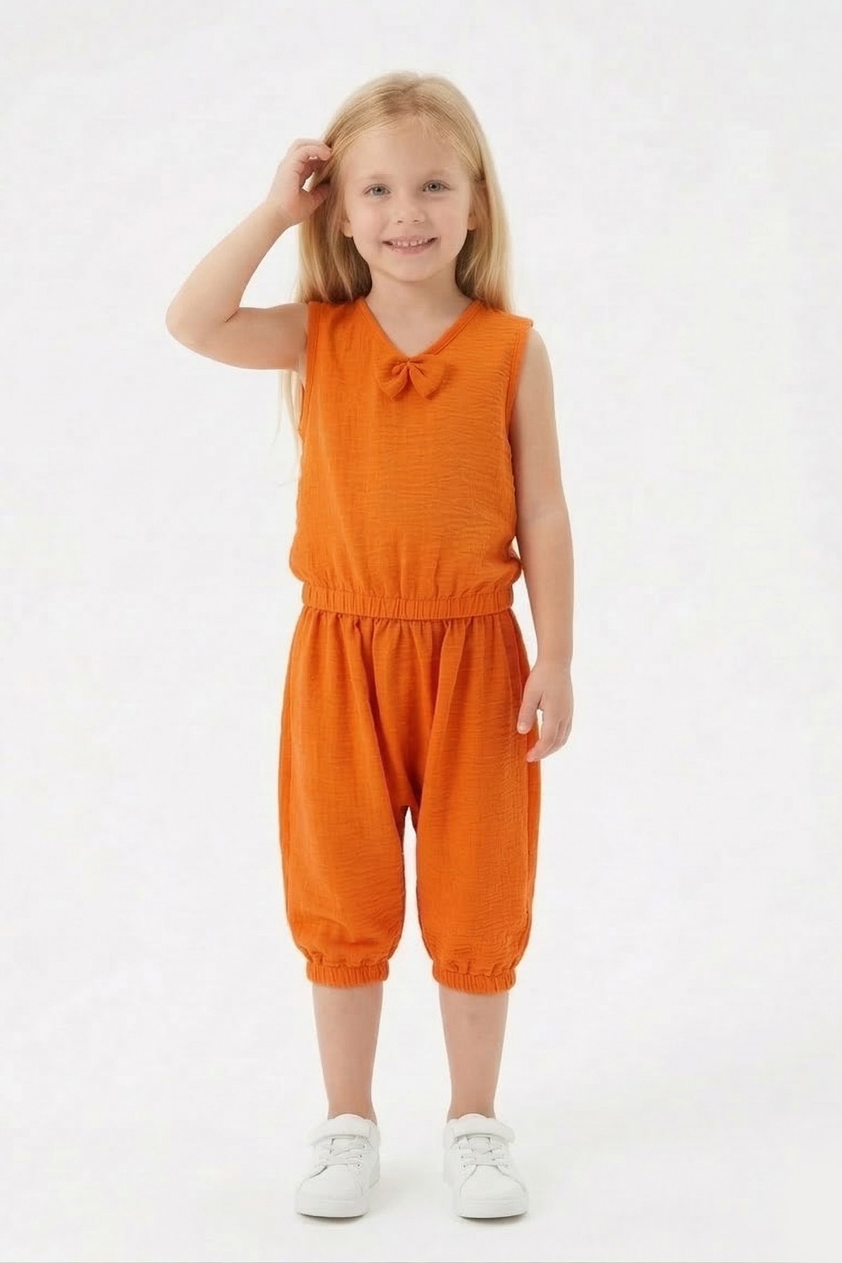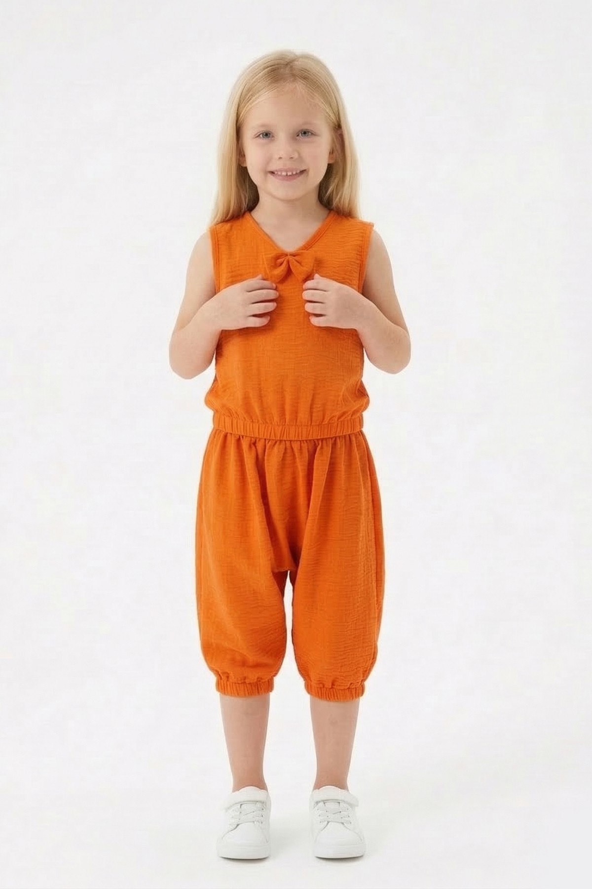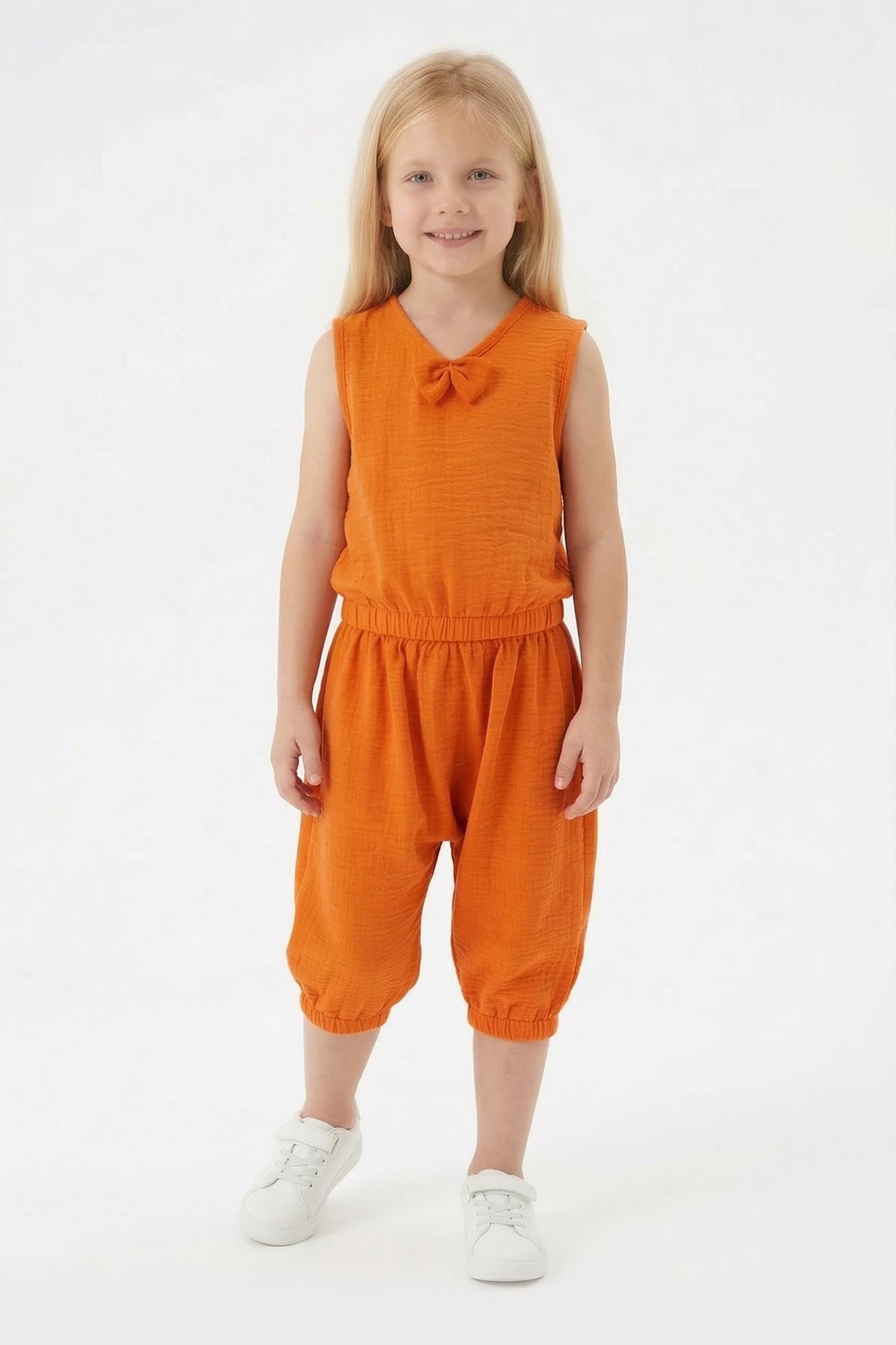 Kız Çocuk Kolsuz V Yaka Fiyonk Detaylı Şalvar Kesim Rahat Yazlık Takım