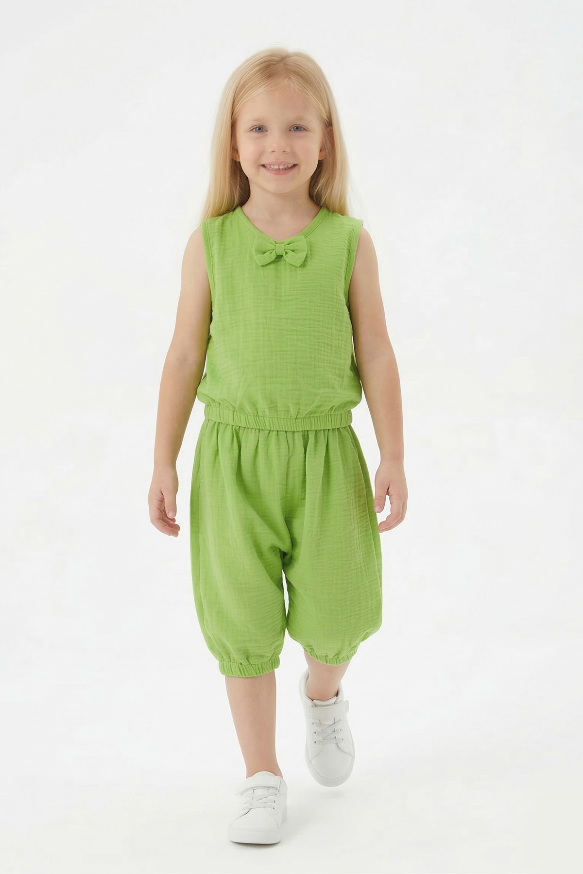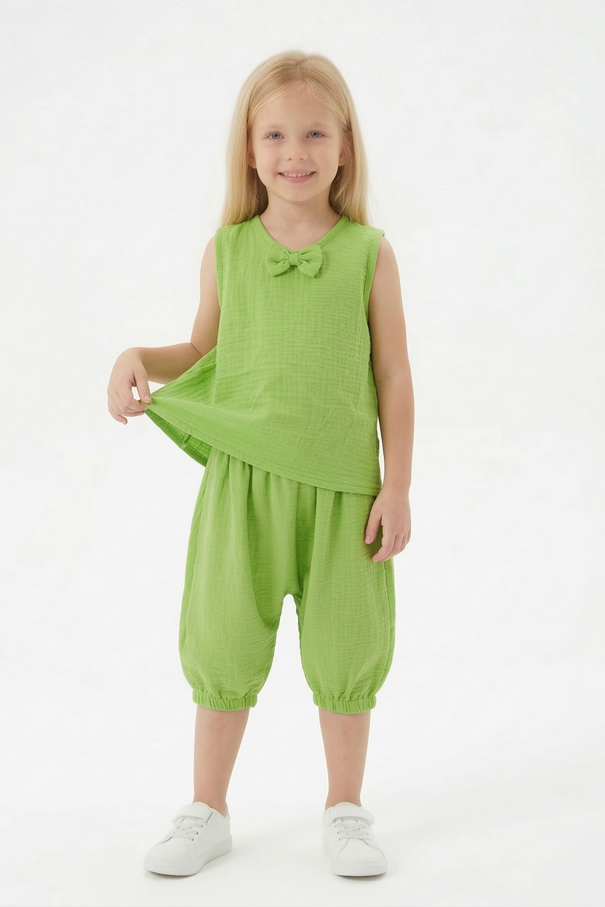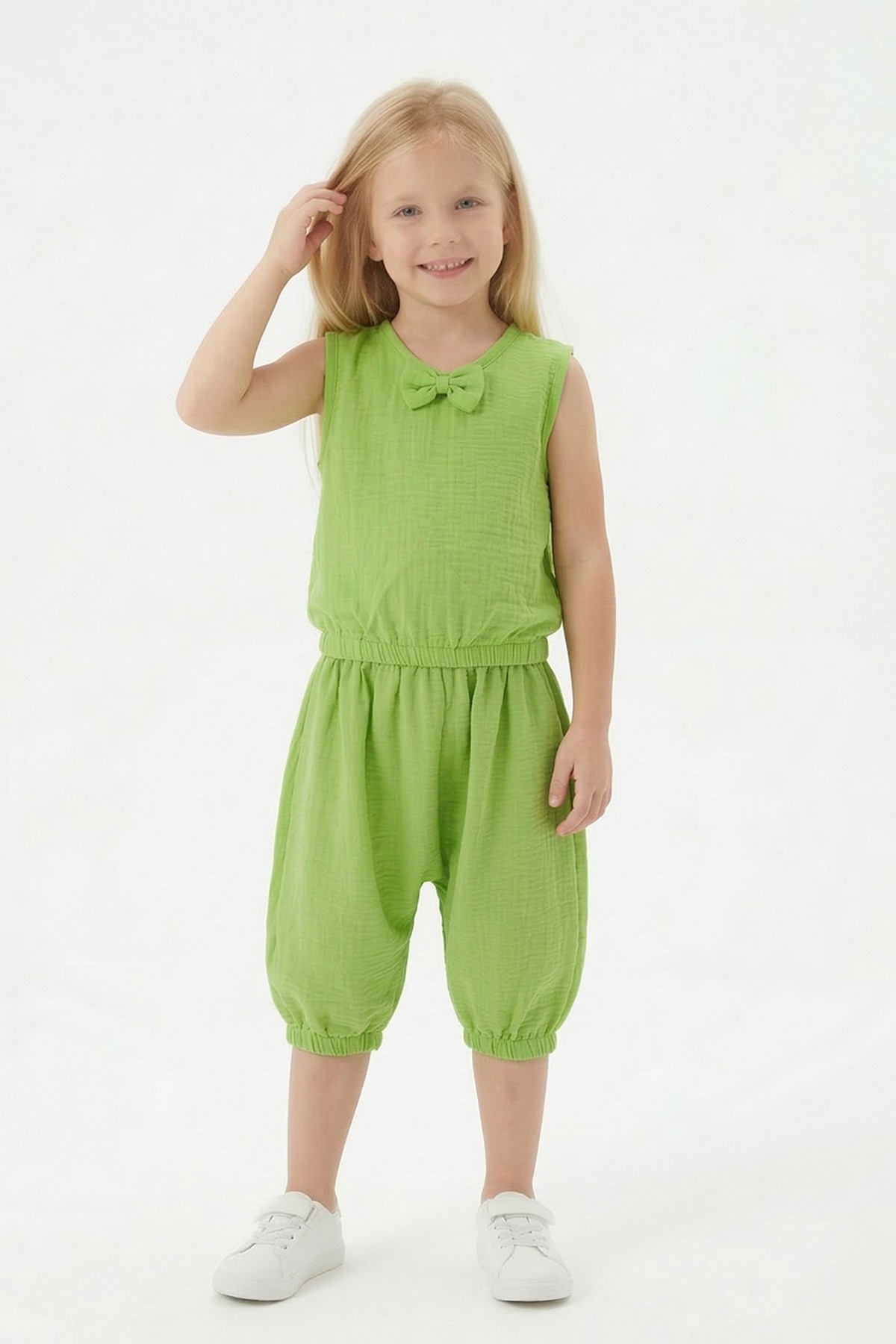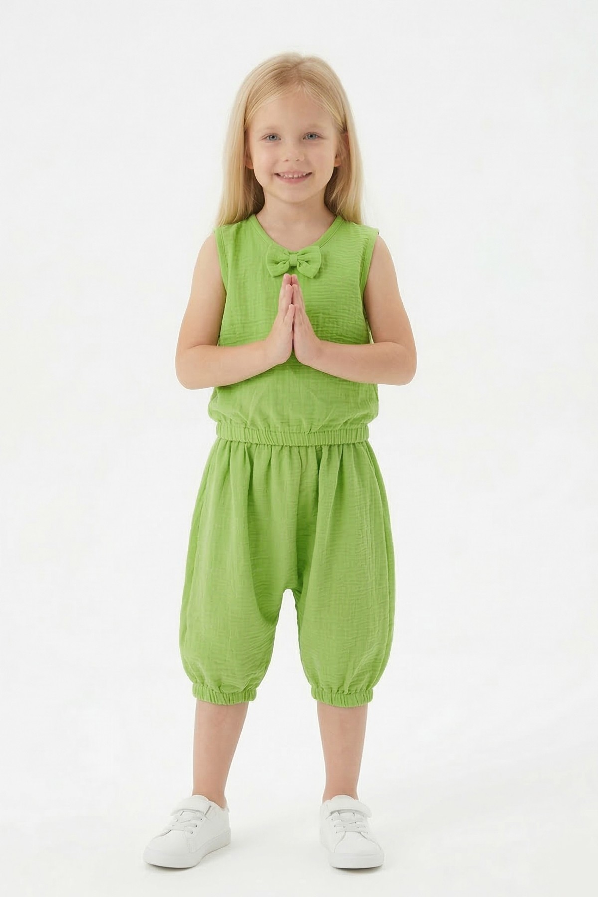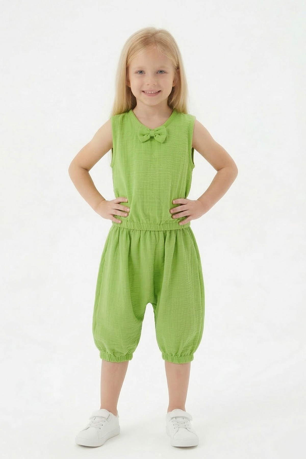 Kız Çocuk Kolsuz V Yaka Fiyonk Detaylı Şalvar Kesim Rahat Yazlık Takım