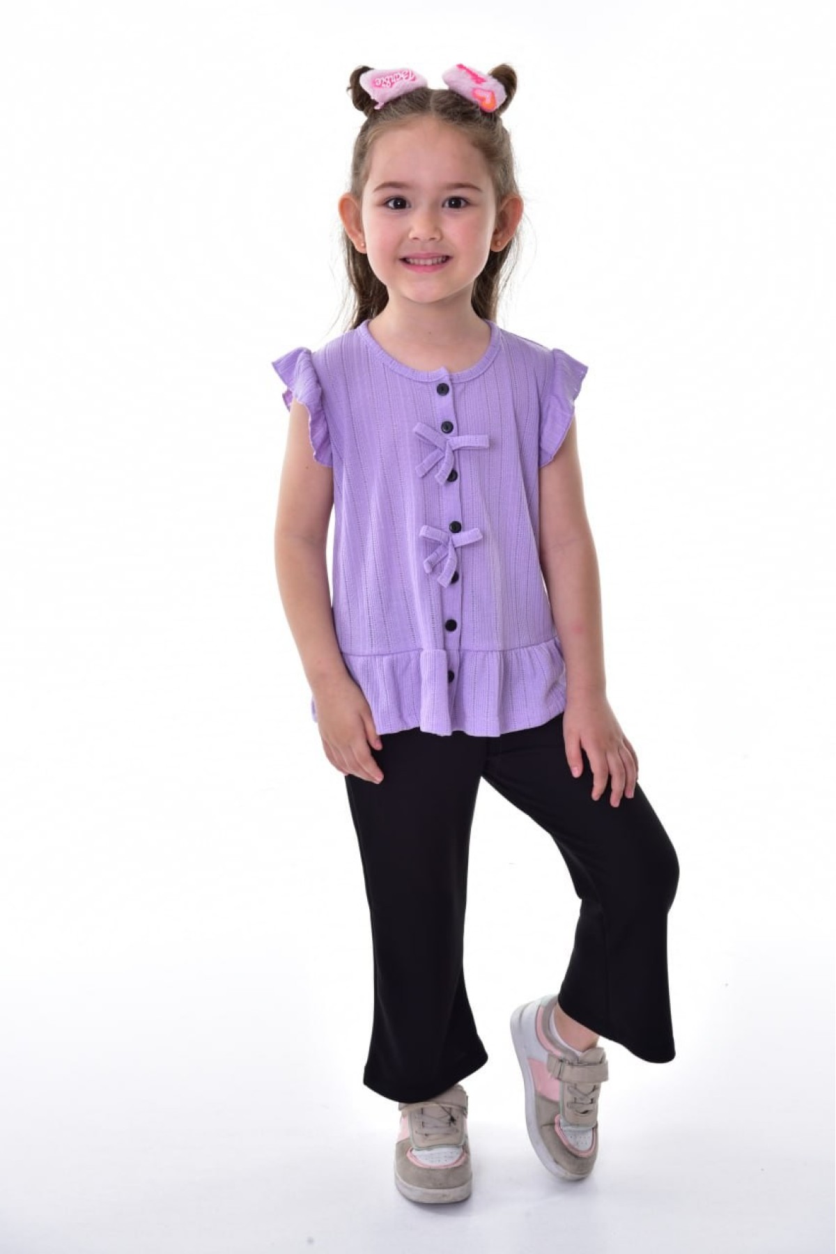 Kız Çocuk Kolsuz Fiyonk Detaylı Düğmeli Bluz Ve İspanyol Paça Pantolon Takım