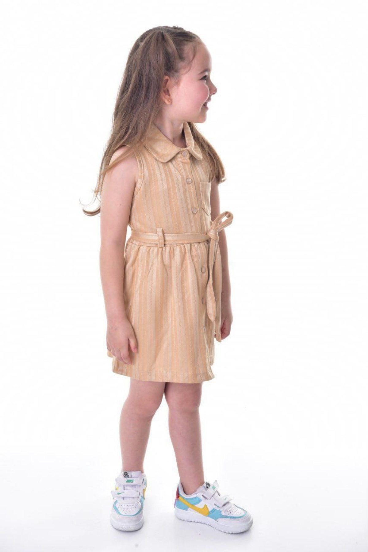 Kız Çocuk Çizgili Kolsuz Bebek Yaka Önden Düğmeli Ve Belden Bağlamalı Pamuklu Yazlık Elbise