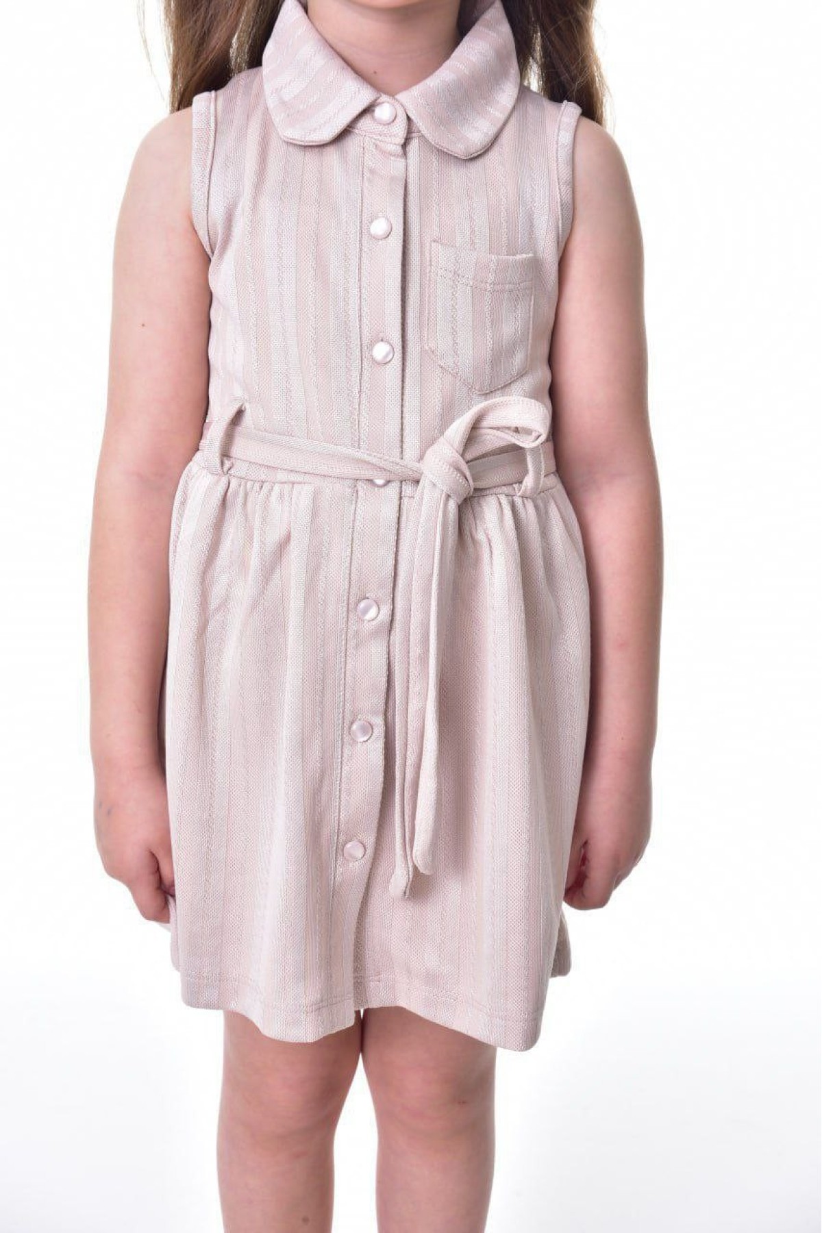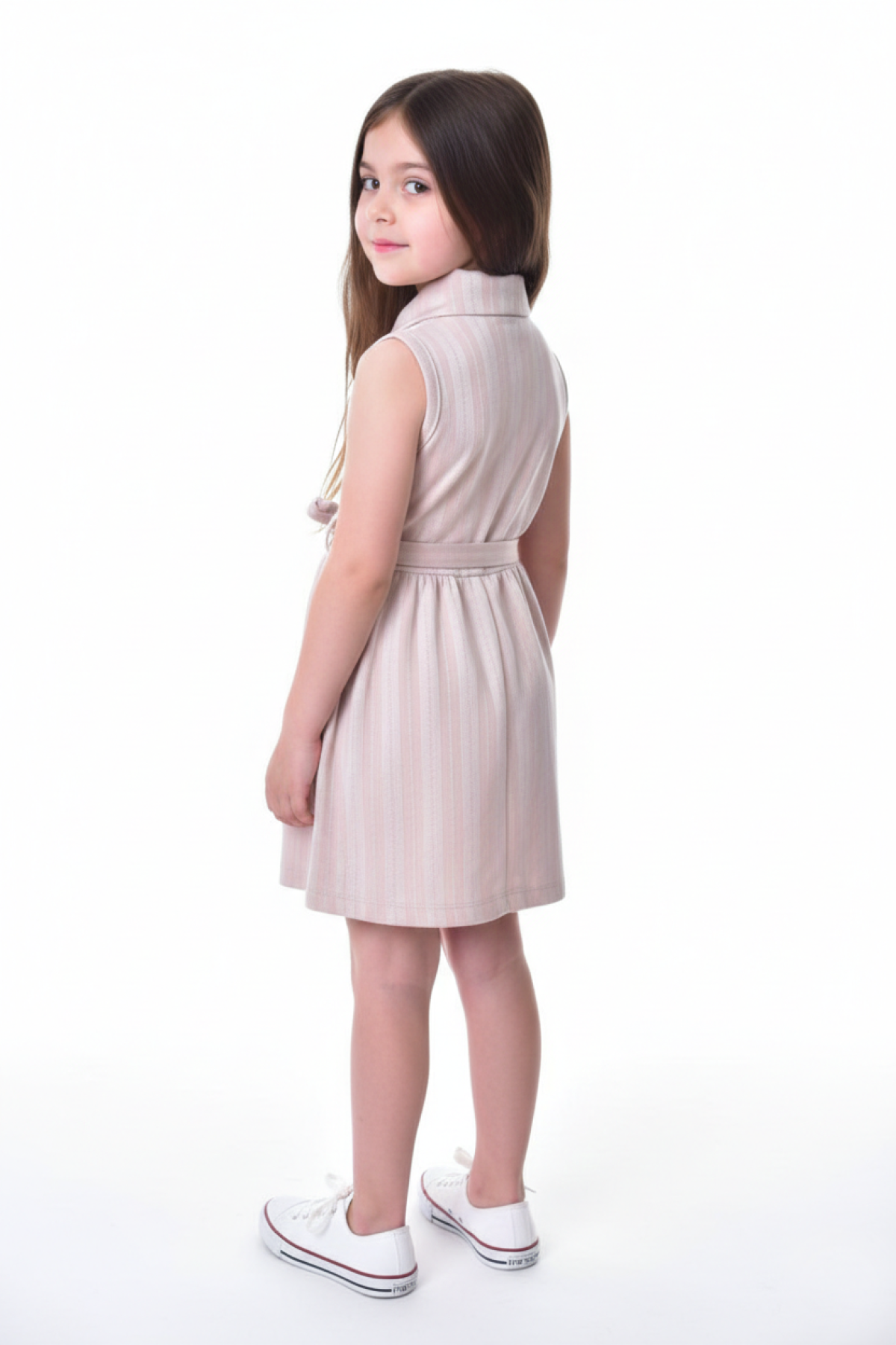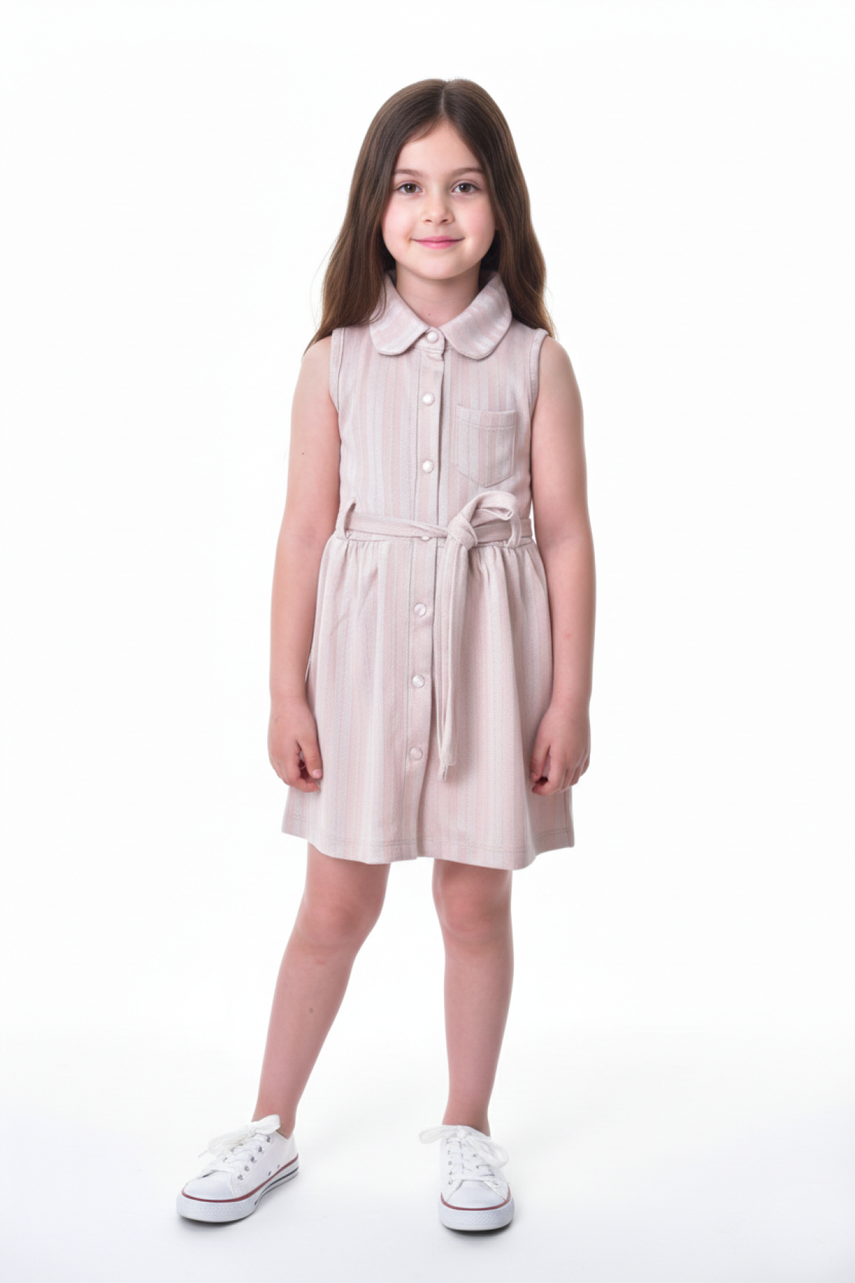 Kız Çocuk Çizgili Kolsuz Bebek Yaka Önden Düğmeli Ve Belden Bağlamalı Pamuklu Yazlık Elbise