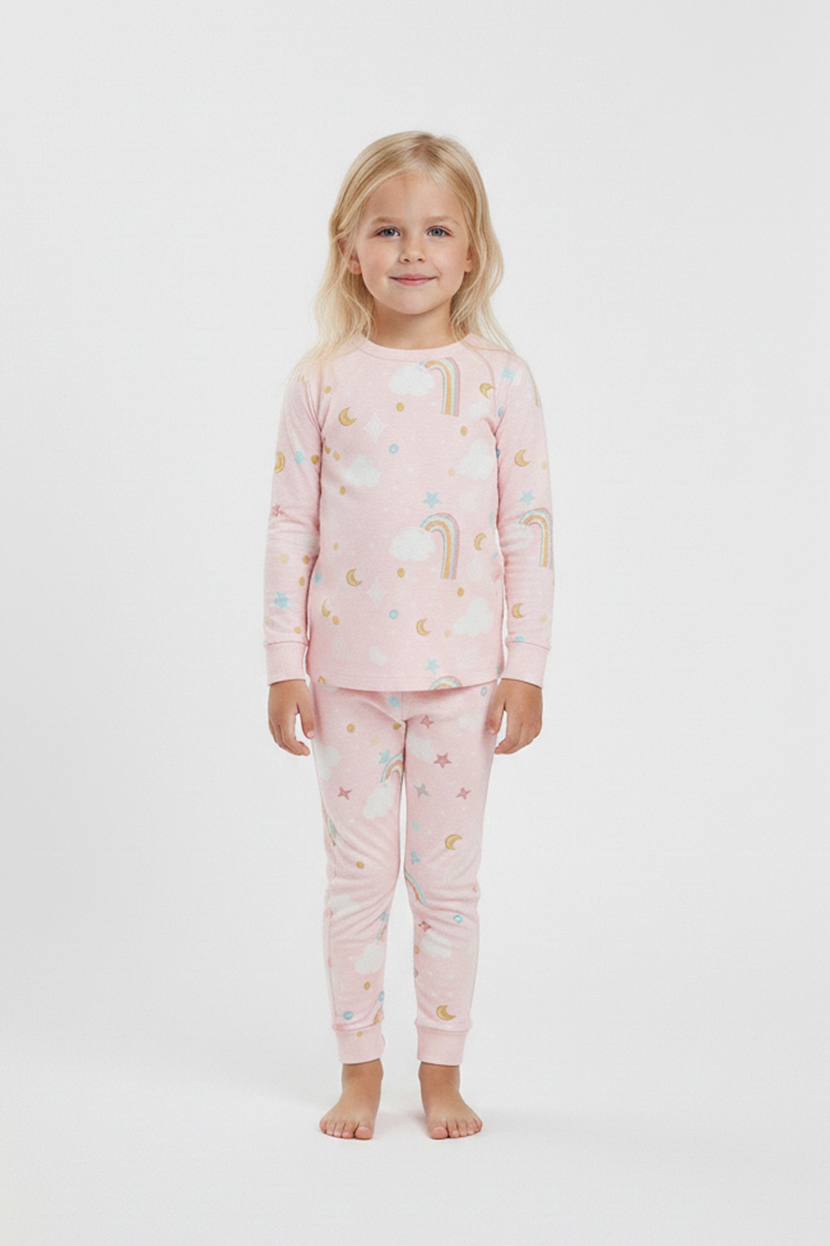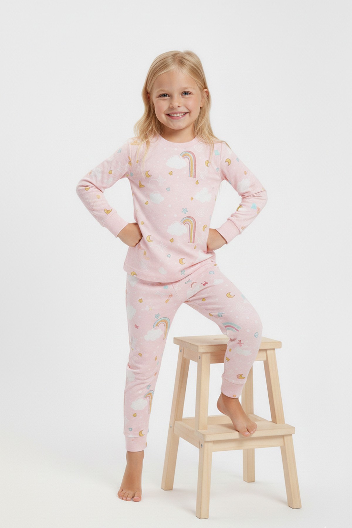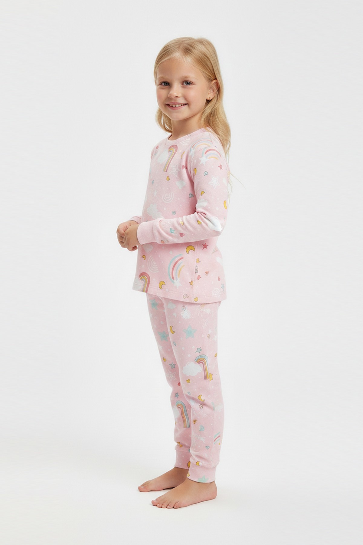 Kız Çocuk Gökkuşağı Baskılı %100 Pamuk İnterlok Kumaş Uzun Kollu Pijama Takımı