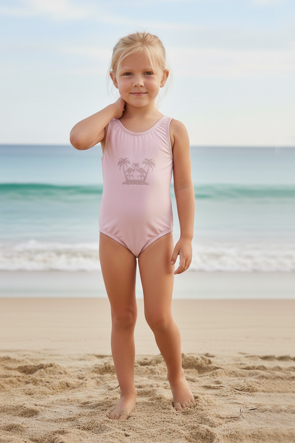 Kız Çocuk Polyester + Elastan Flamingo Desenli ve Taş İşlemeli Yüzücü Mayosu