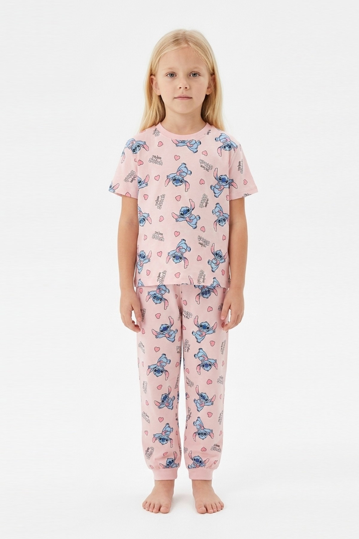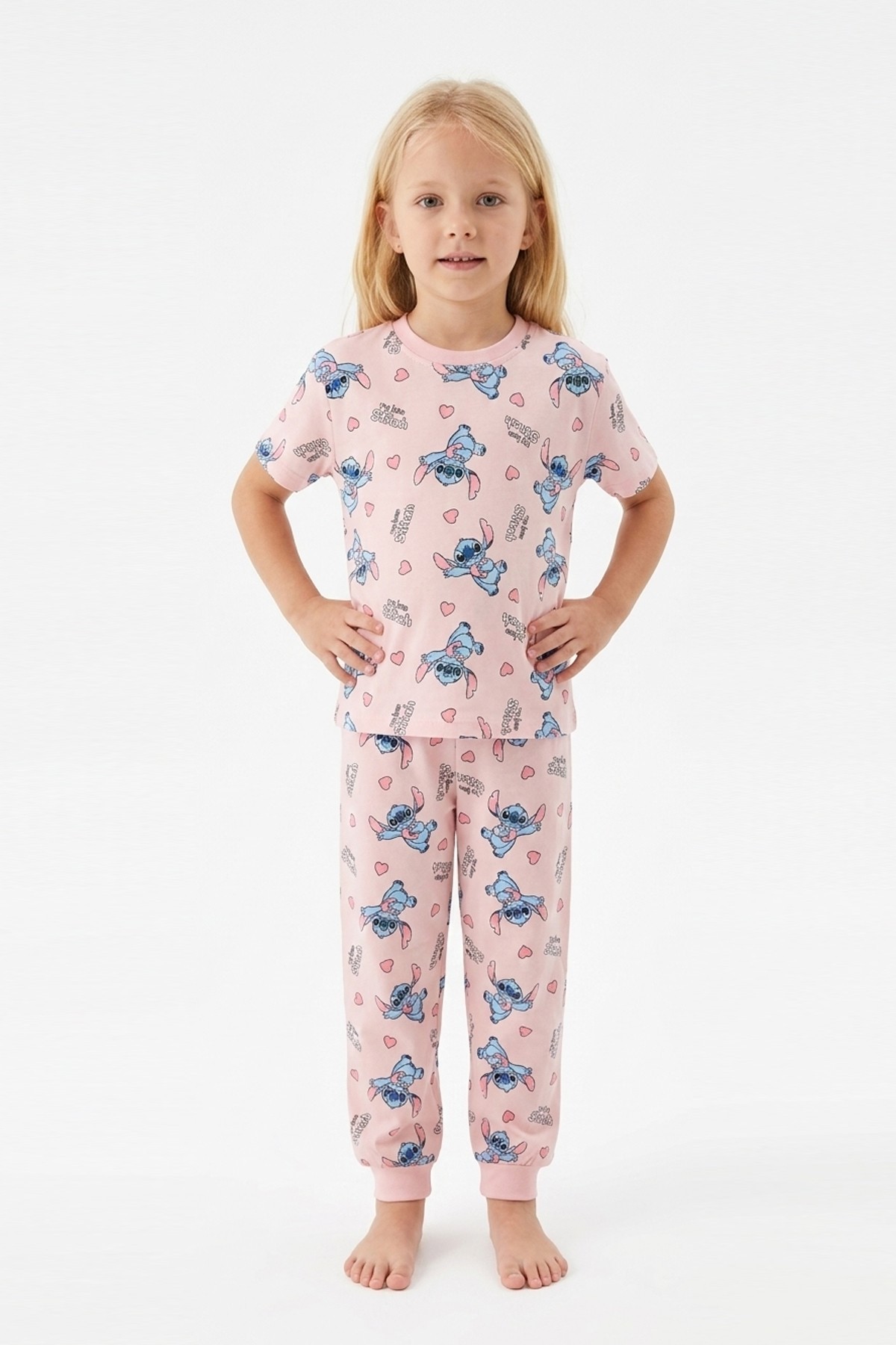 Kız Çocuk Figürlü ve Kalp Desenli %100 Pamuk Reaktif Boyalı Süprem Kumaş Kısa Kollu Pijama Takımı