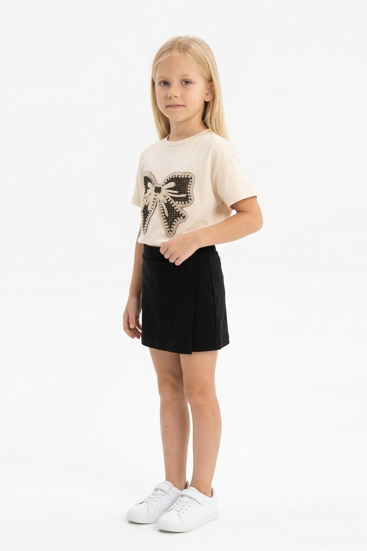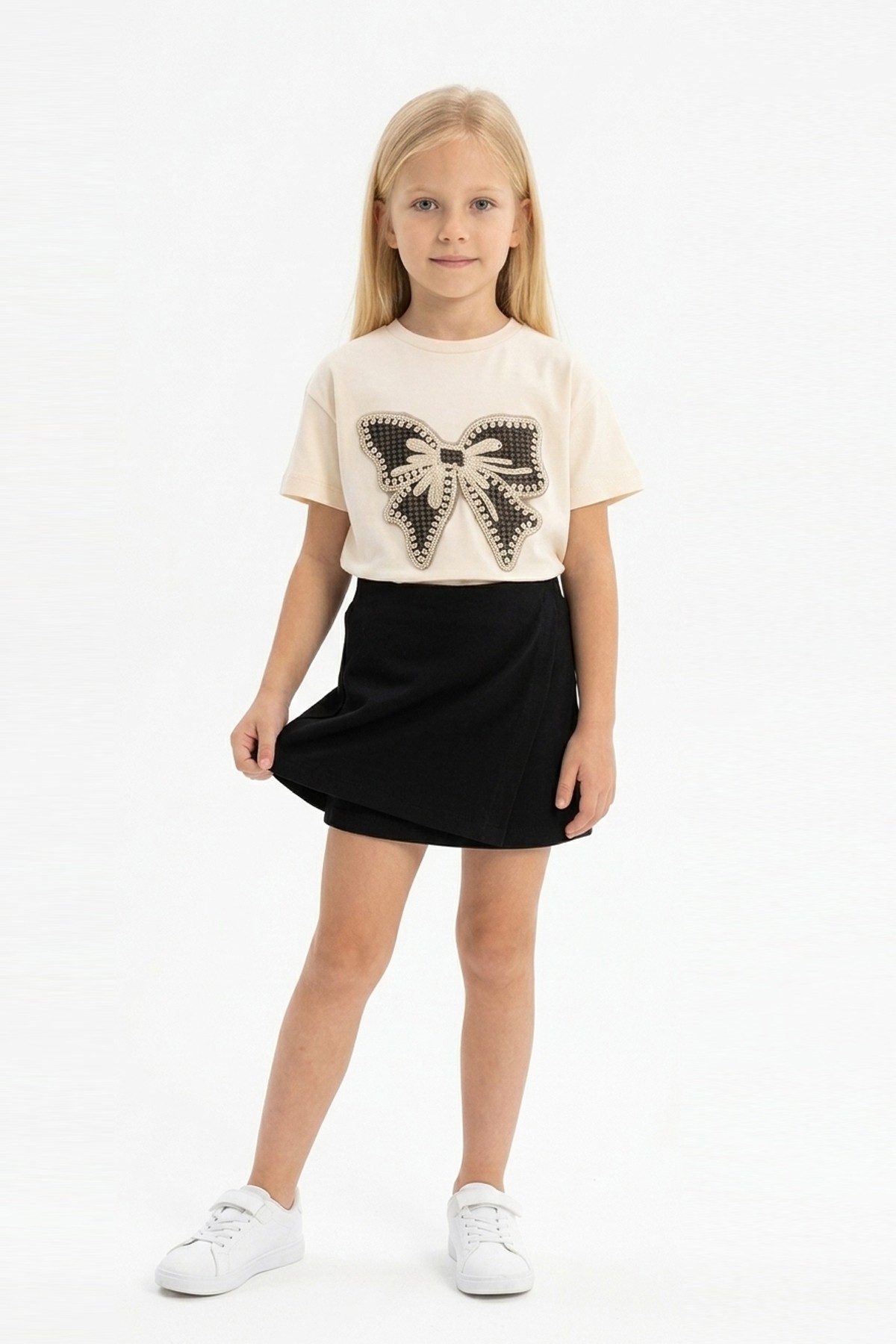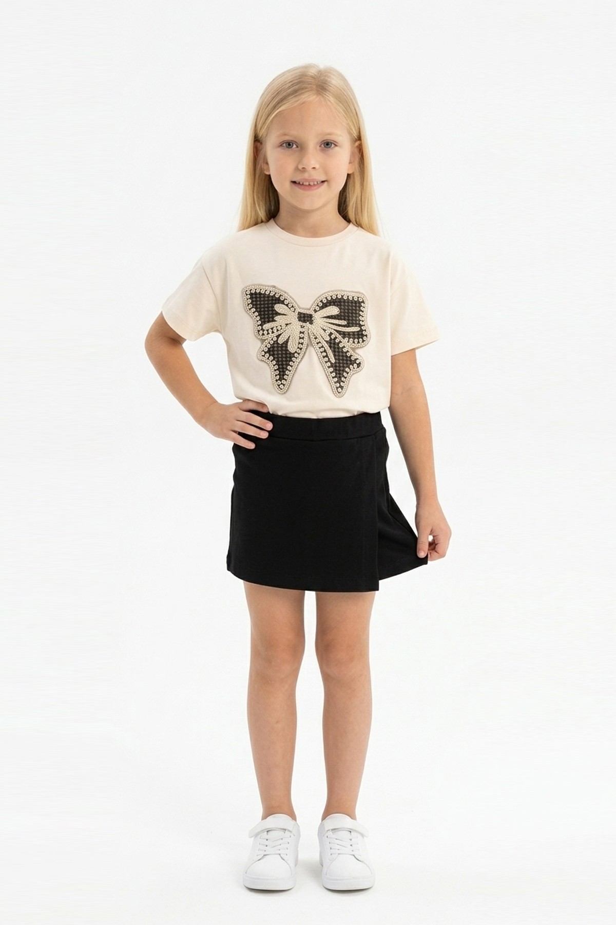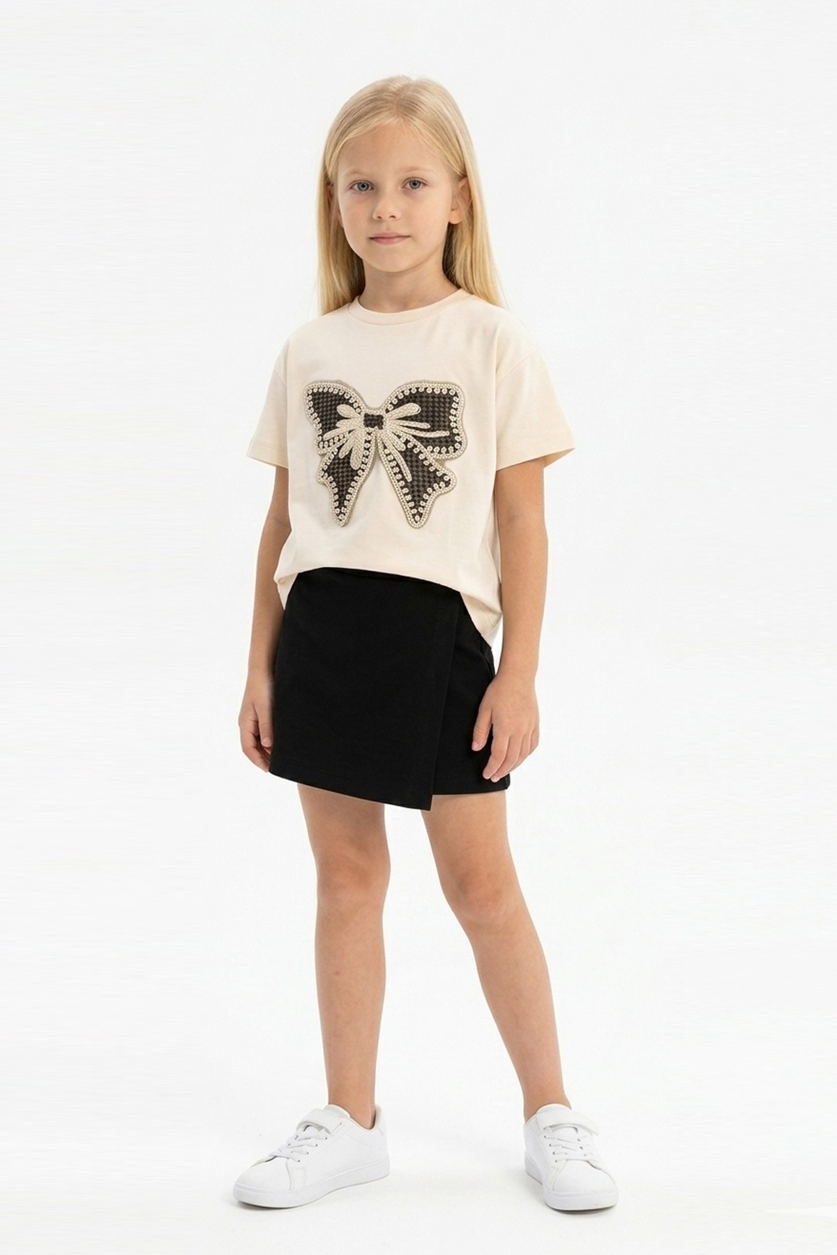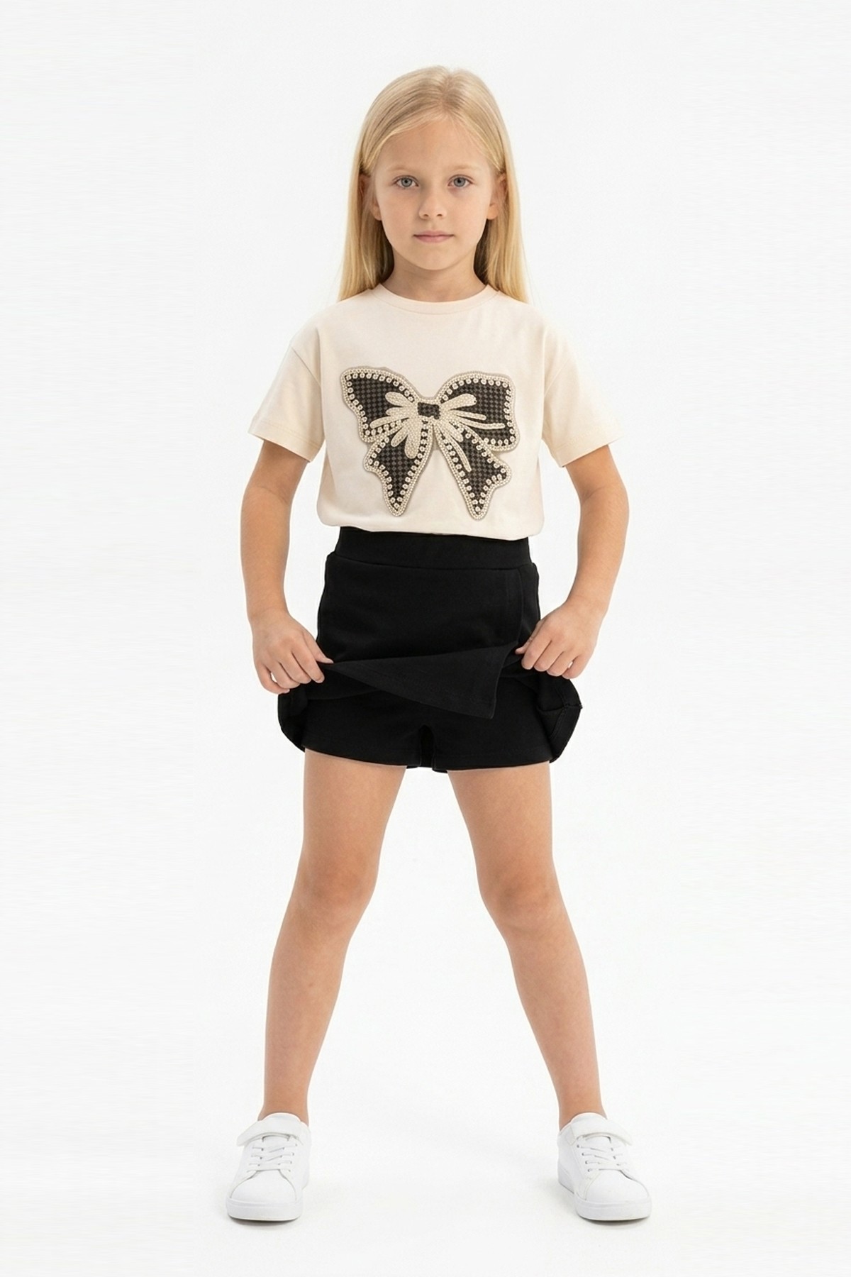 Kız Çocuk Dantel Nakışlı Fiyonk Detaylı Kısa Kollu Bisiklet Yaka Tişört Ve Lastikli Şort Etek Yazlık Takım