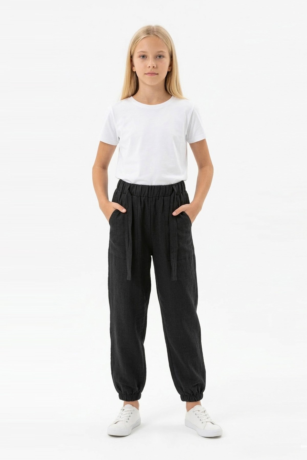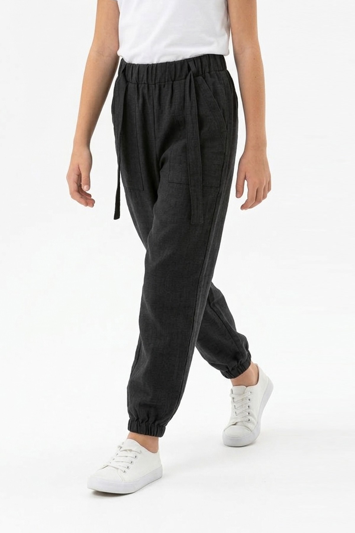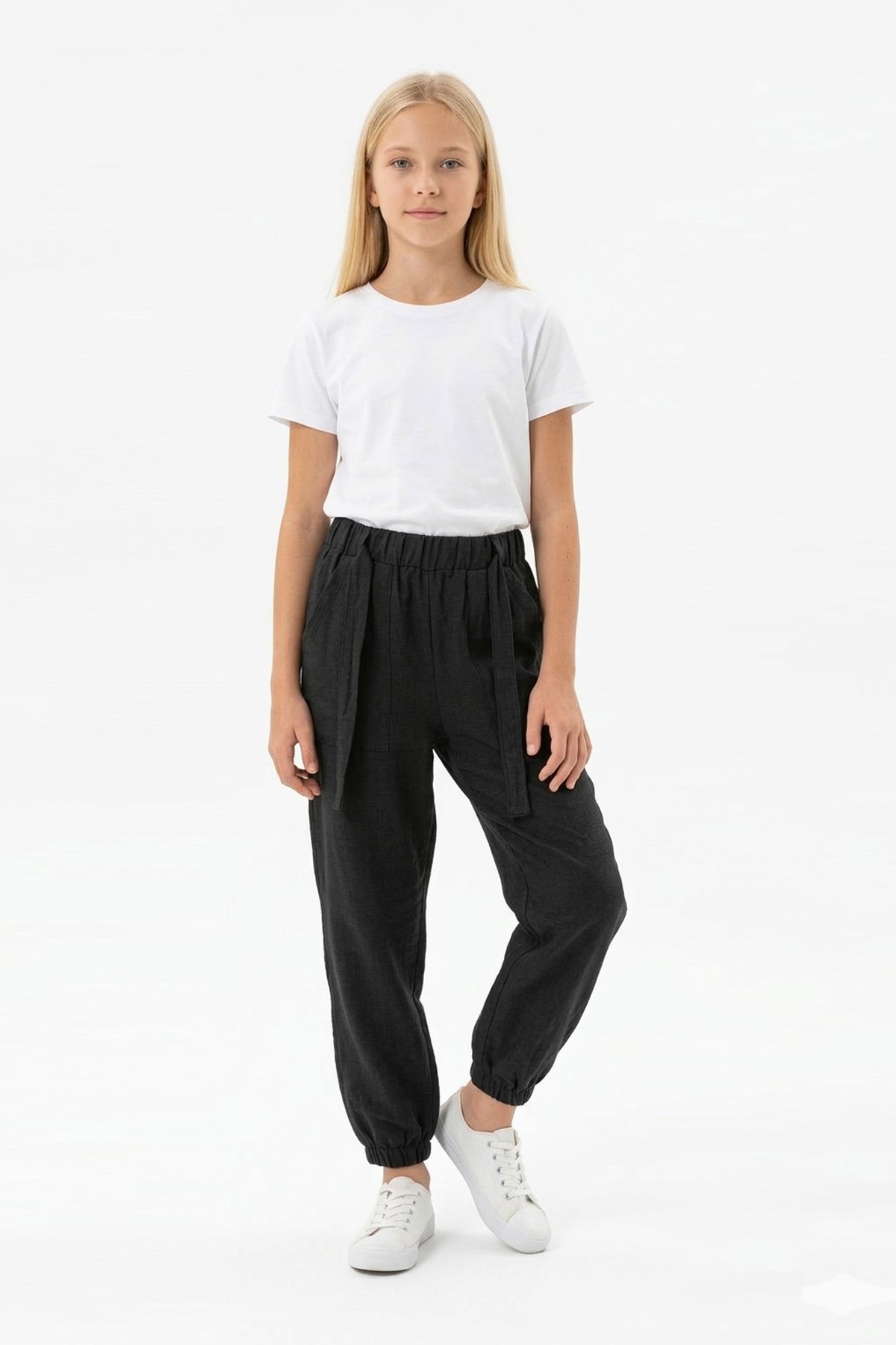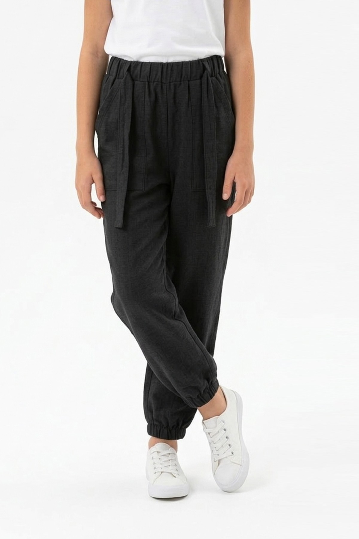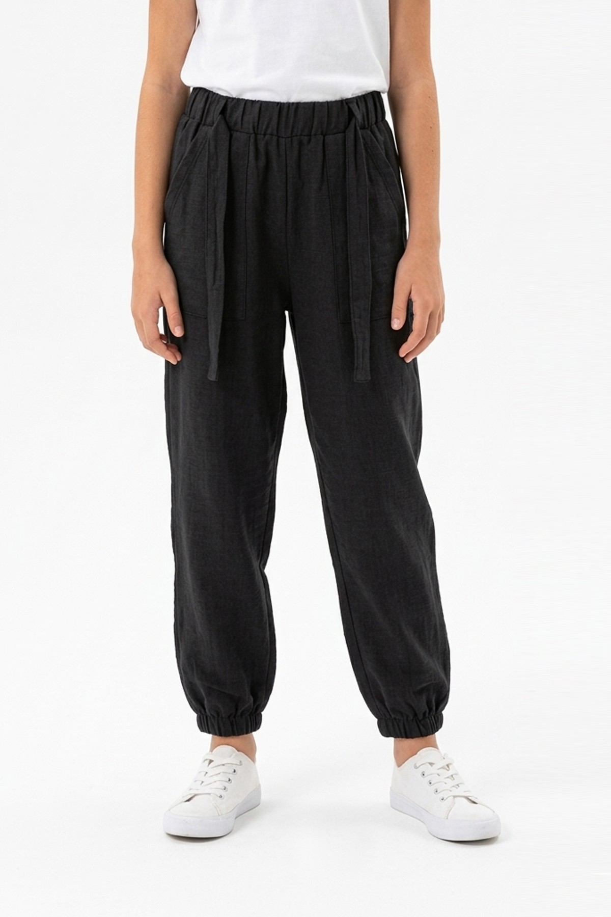 Garson Kız Çocuk Aerobin Kumaş Beli Lastikli ve Kuşaklı Paçası Lastikli Cepli Rahat Kesim Pantolon