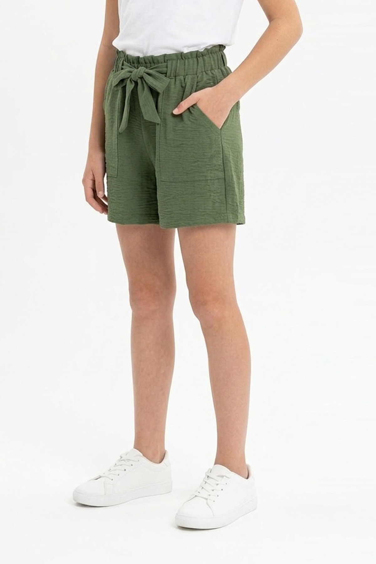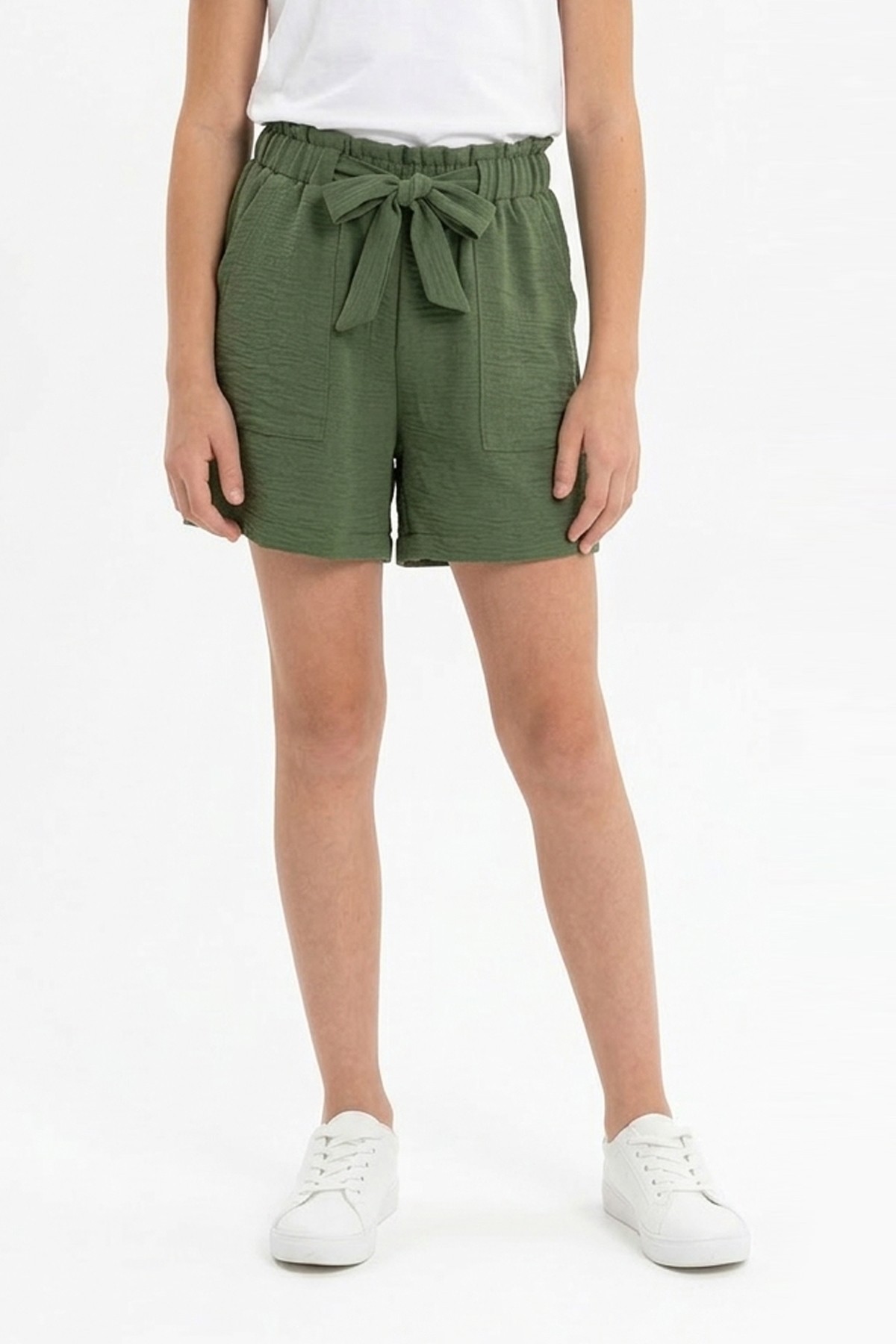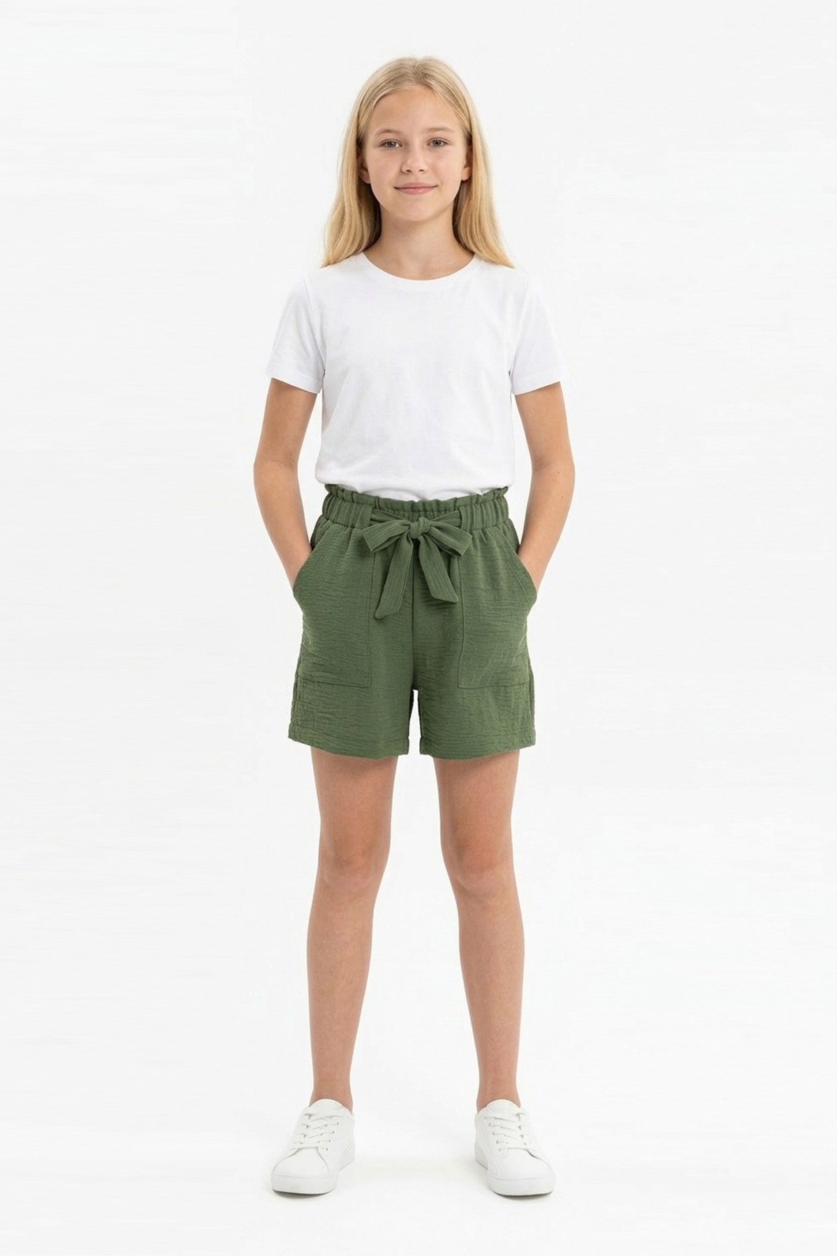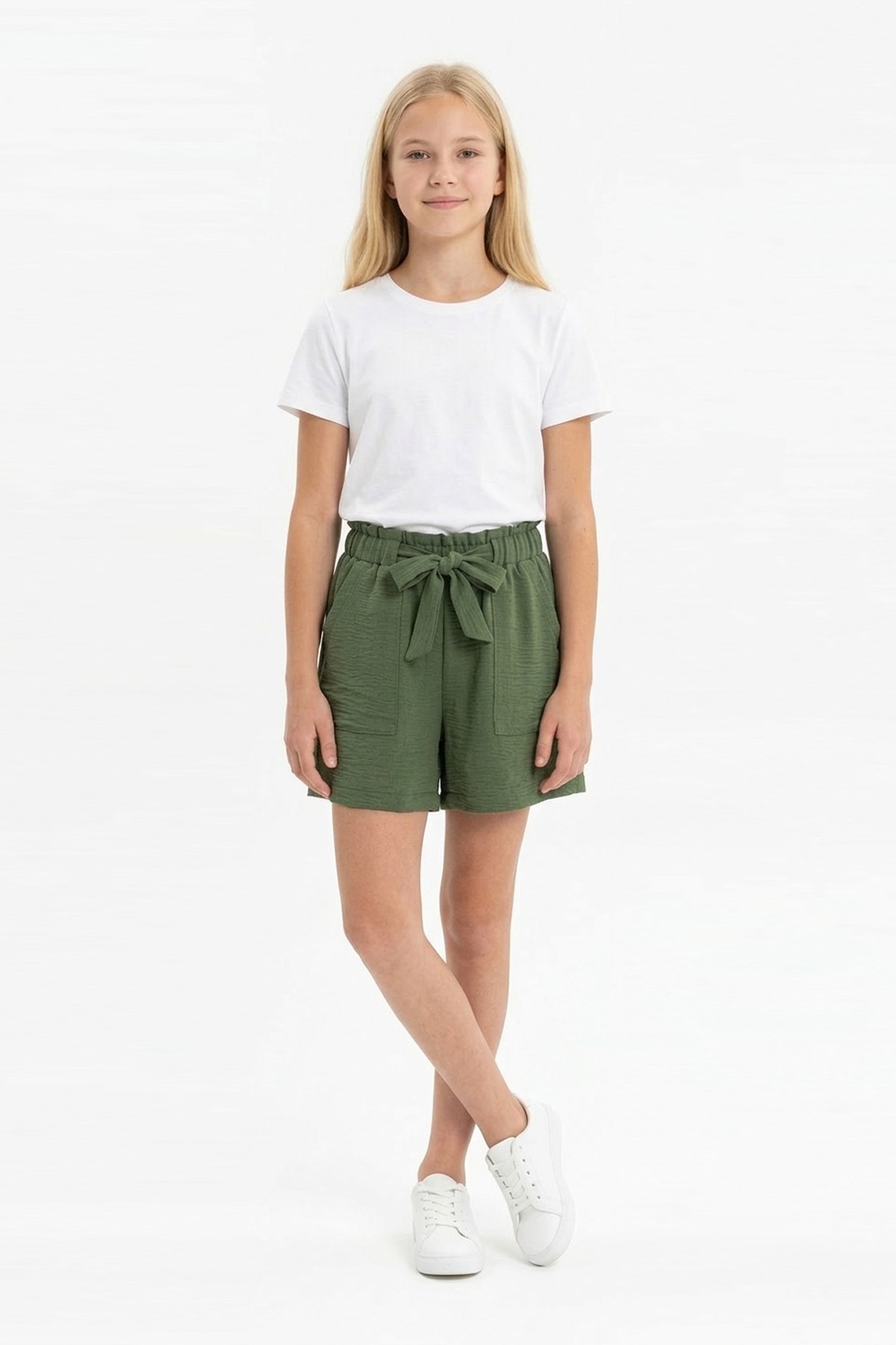 Kız Çocuk Aerobin Kumaş Beli Lastikli ve Kuşaklı Cepli Rahat Kesim Yazlık Şort