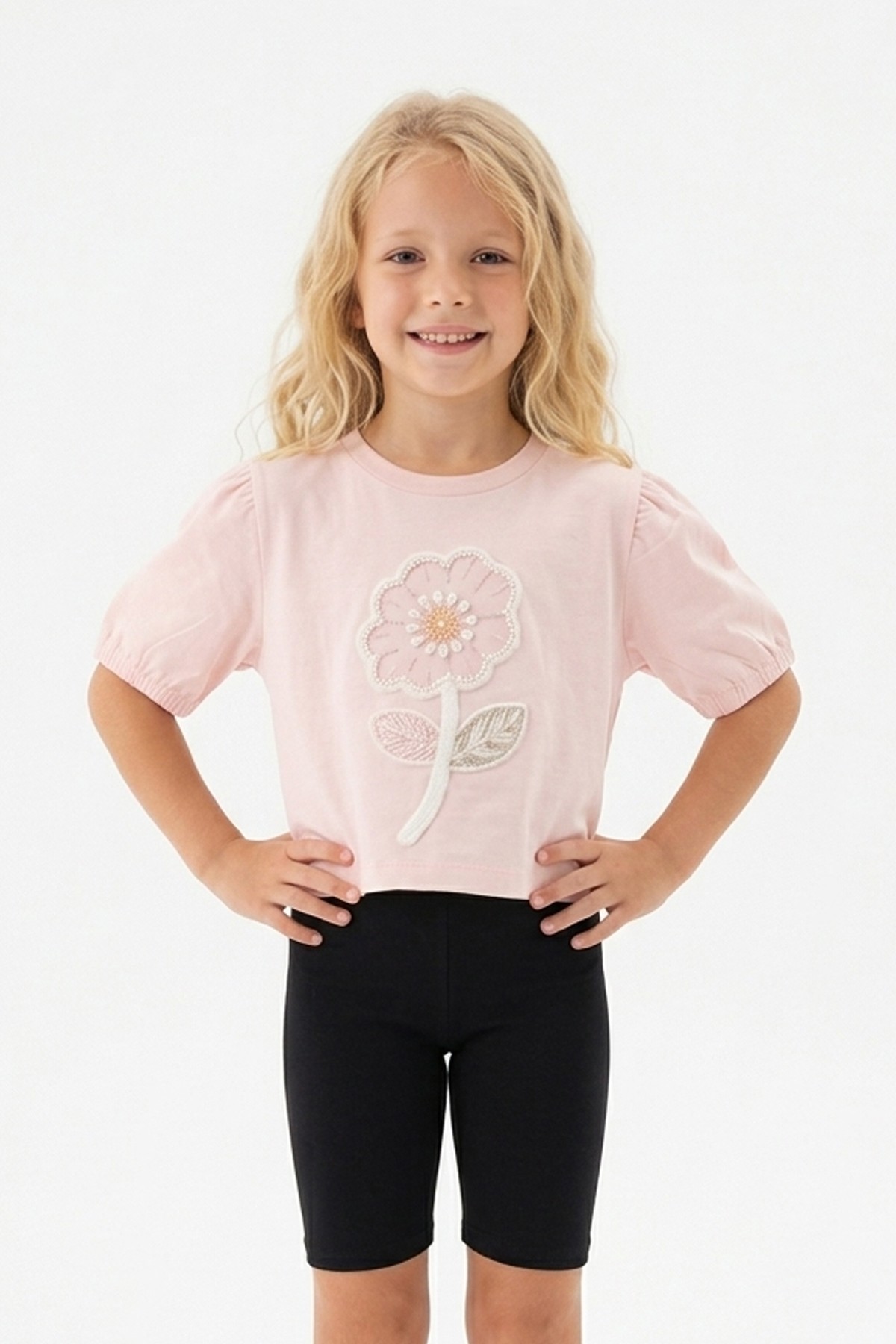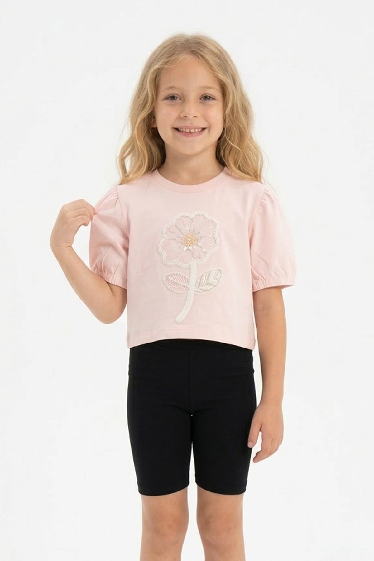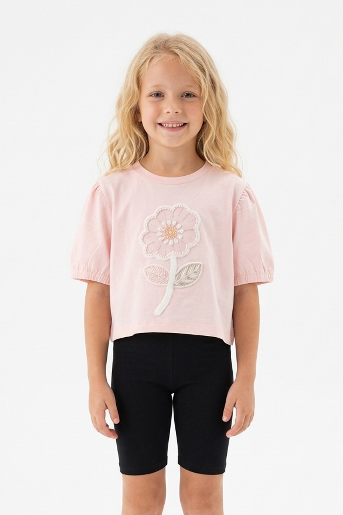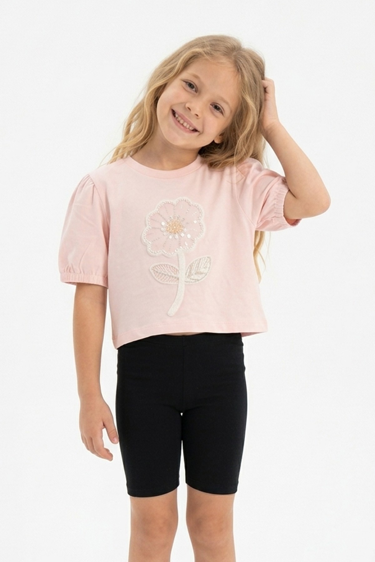 Kız Çocuk Süprem Kumaş Karpuz Kol Detaylı İnci ve Pul İşlemeli Çiçek Nakışlı Pamuklu Kısa Kollu Tişört