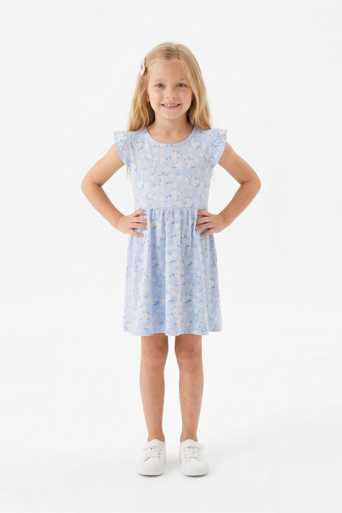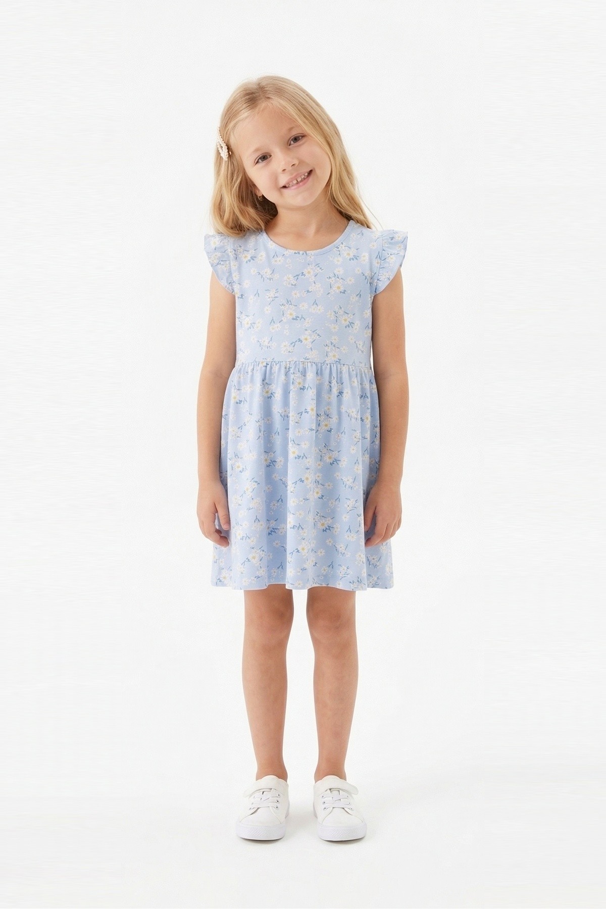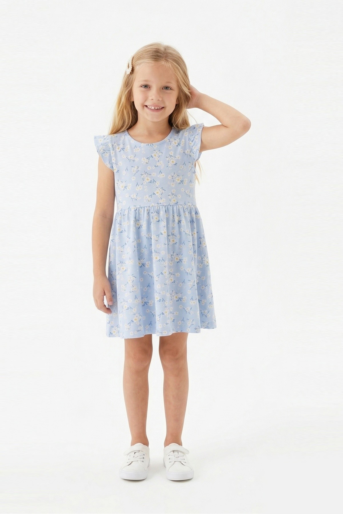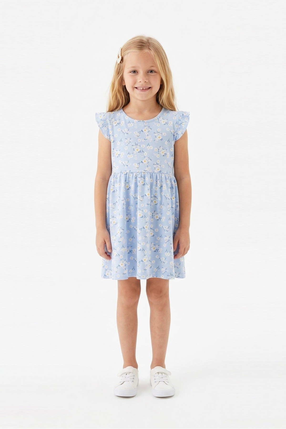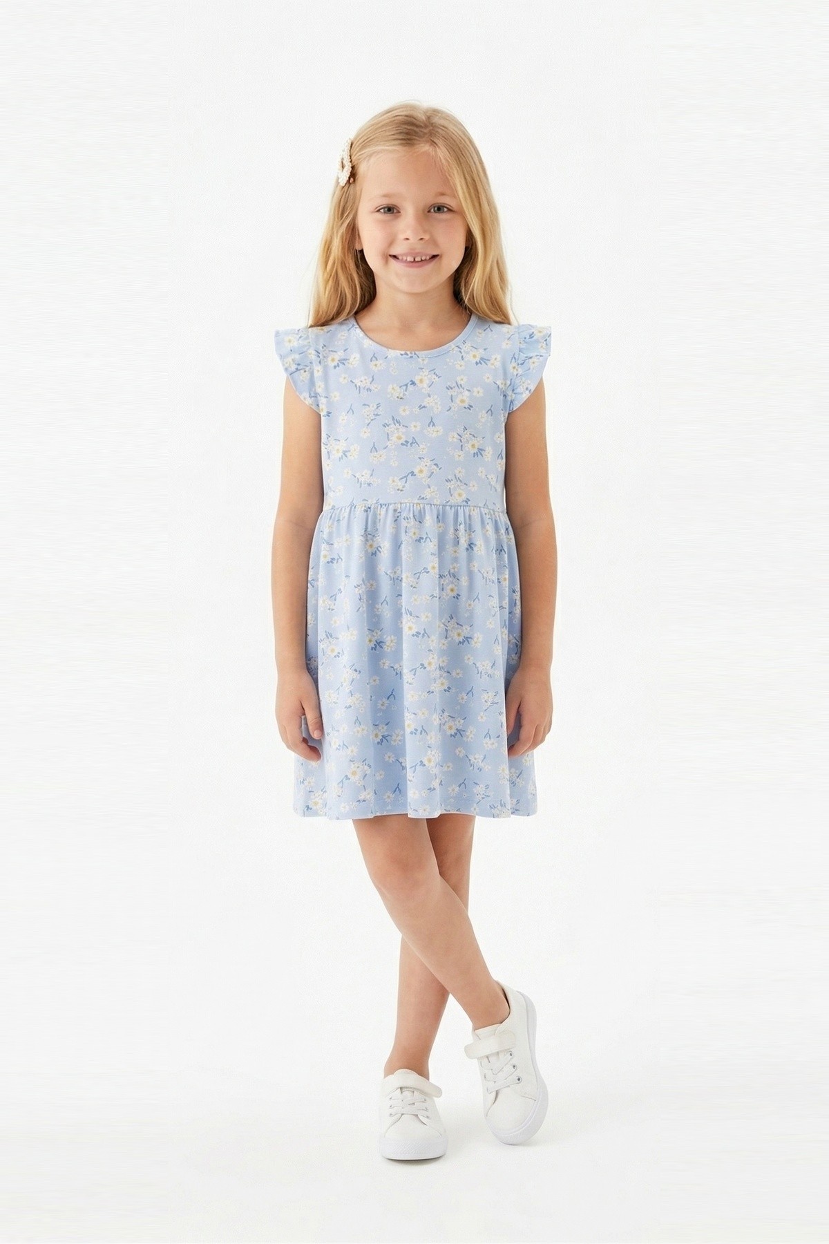 Kız Çocuk Sıfır Kol Papatya Desenli Bel Büzgülü %100 Pamuk Süprem Kumaş Yazlık Elbise