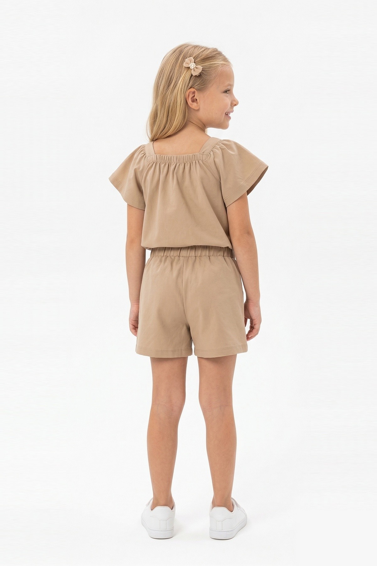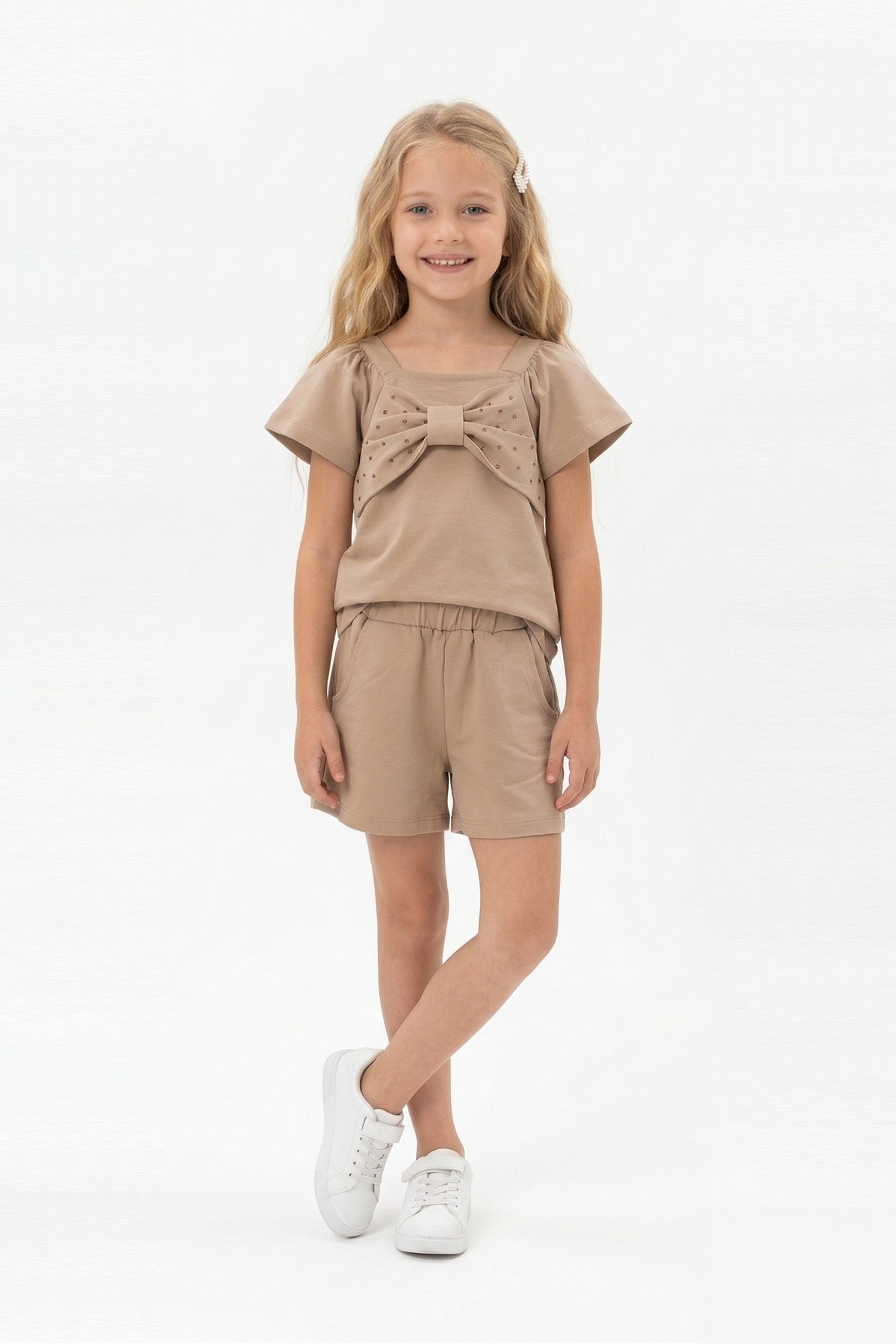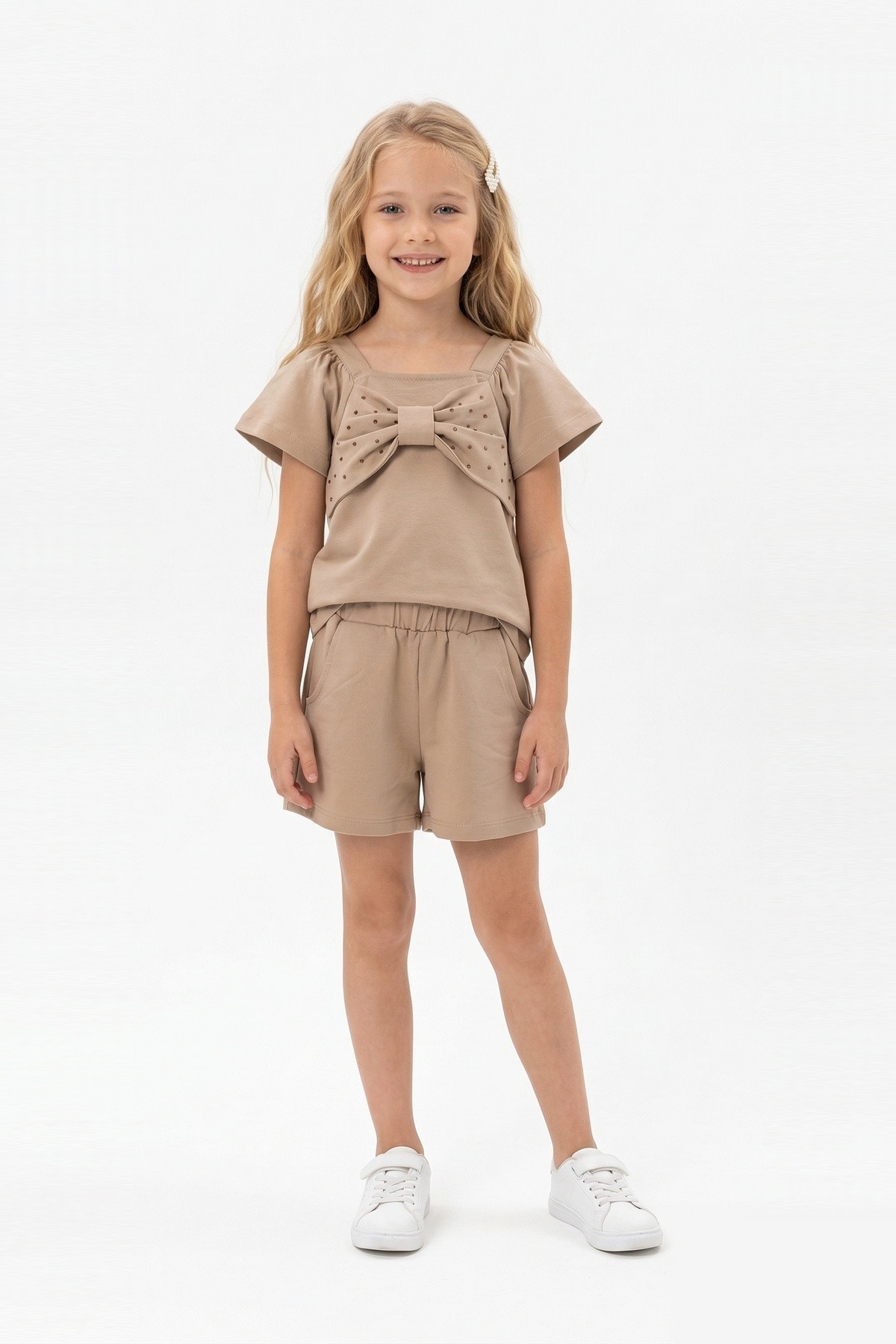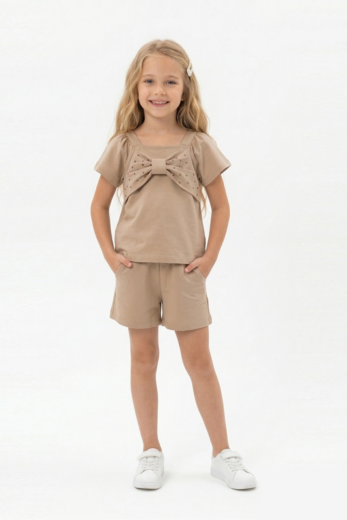 Kız Çocuk Önü Fiyonk Taş Baskılı Kare Yaka Tişört %100 Pamuk Süprem Kumaş Cepli Şortlu Takım