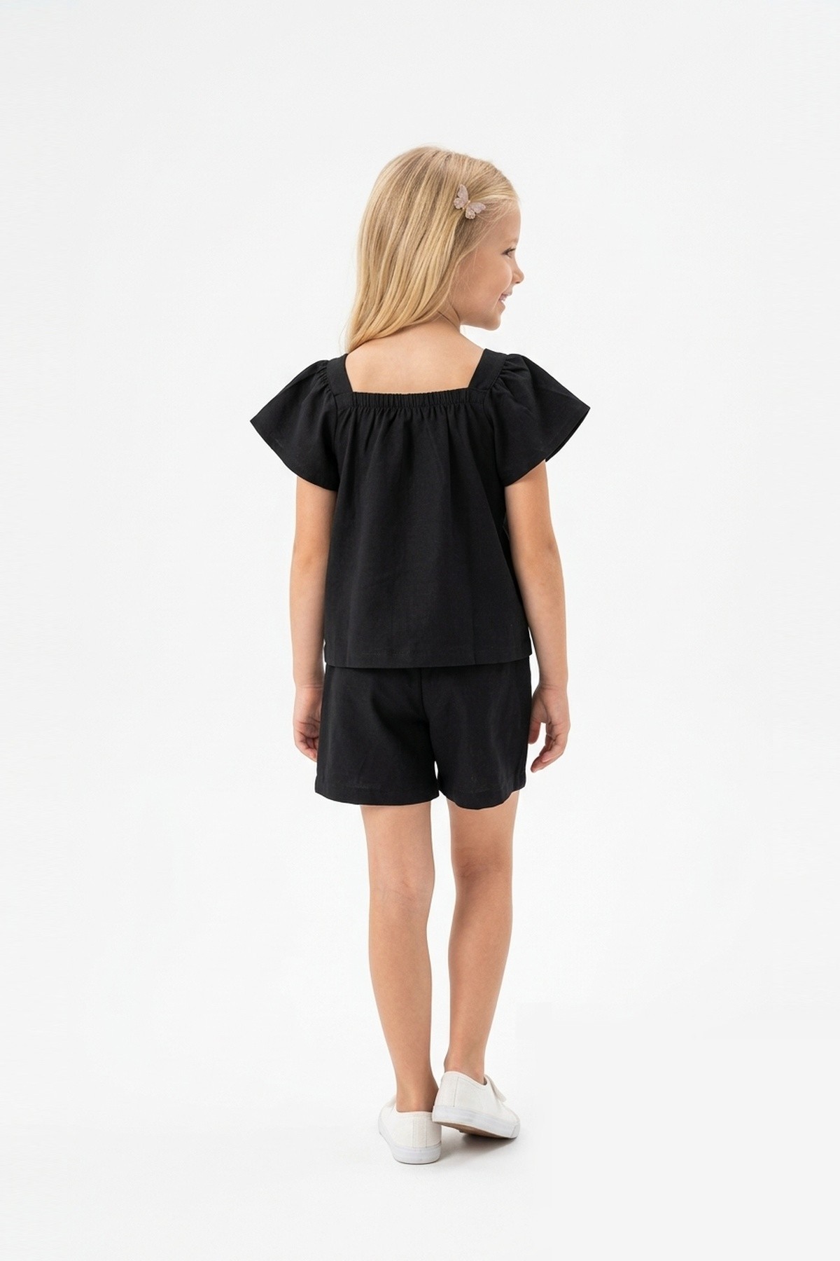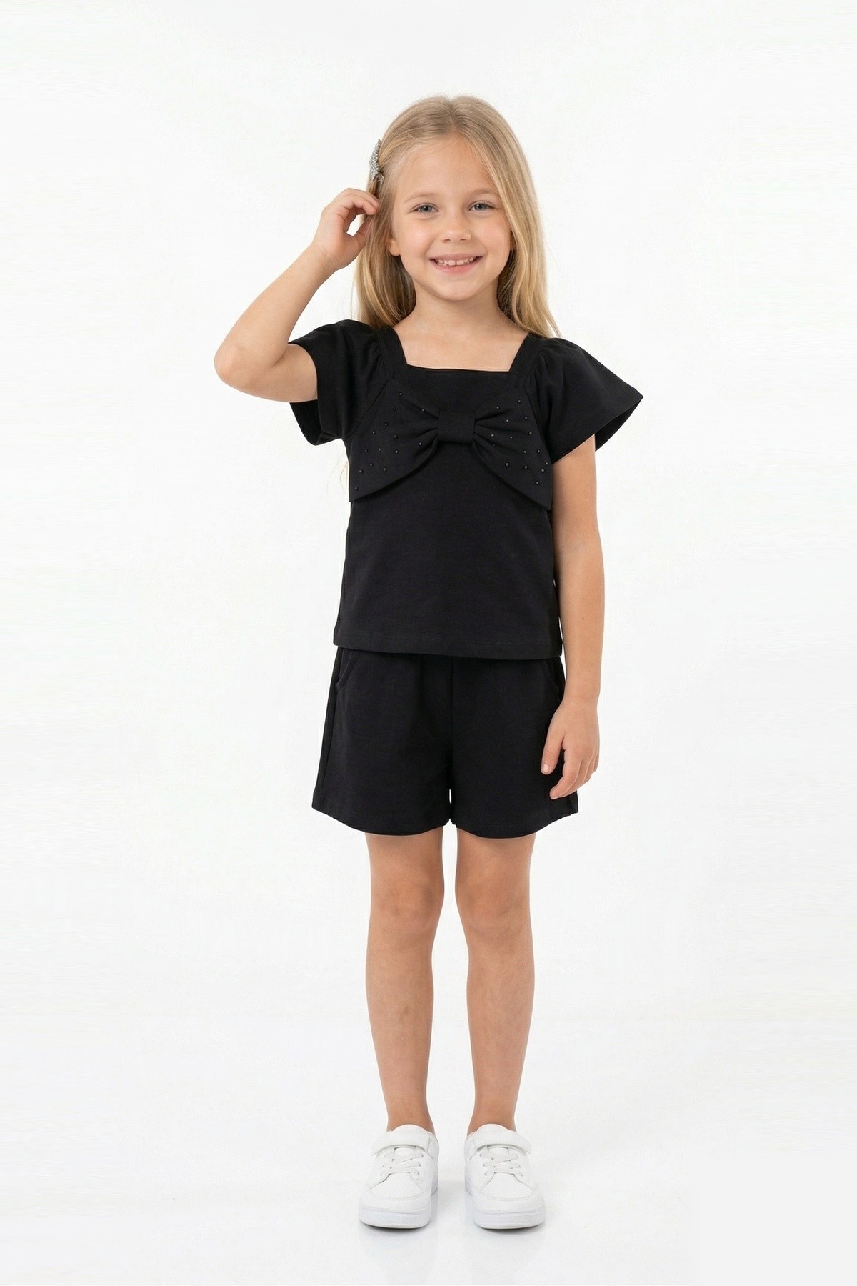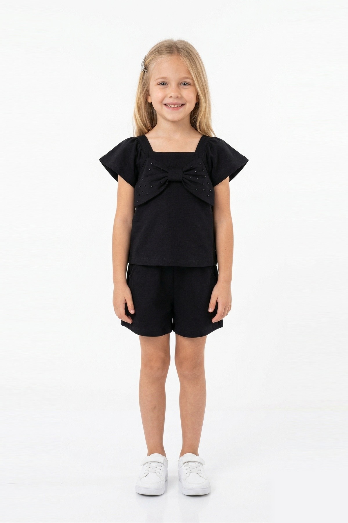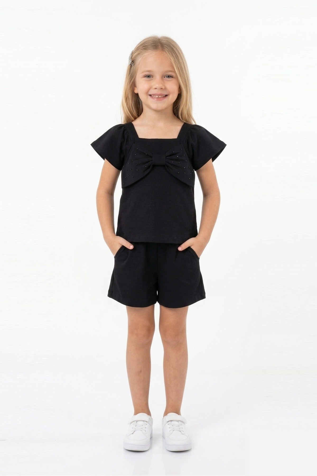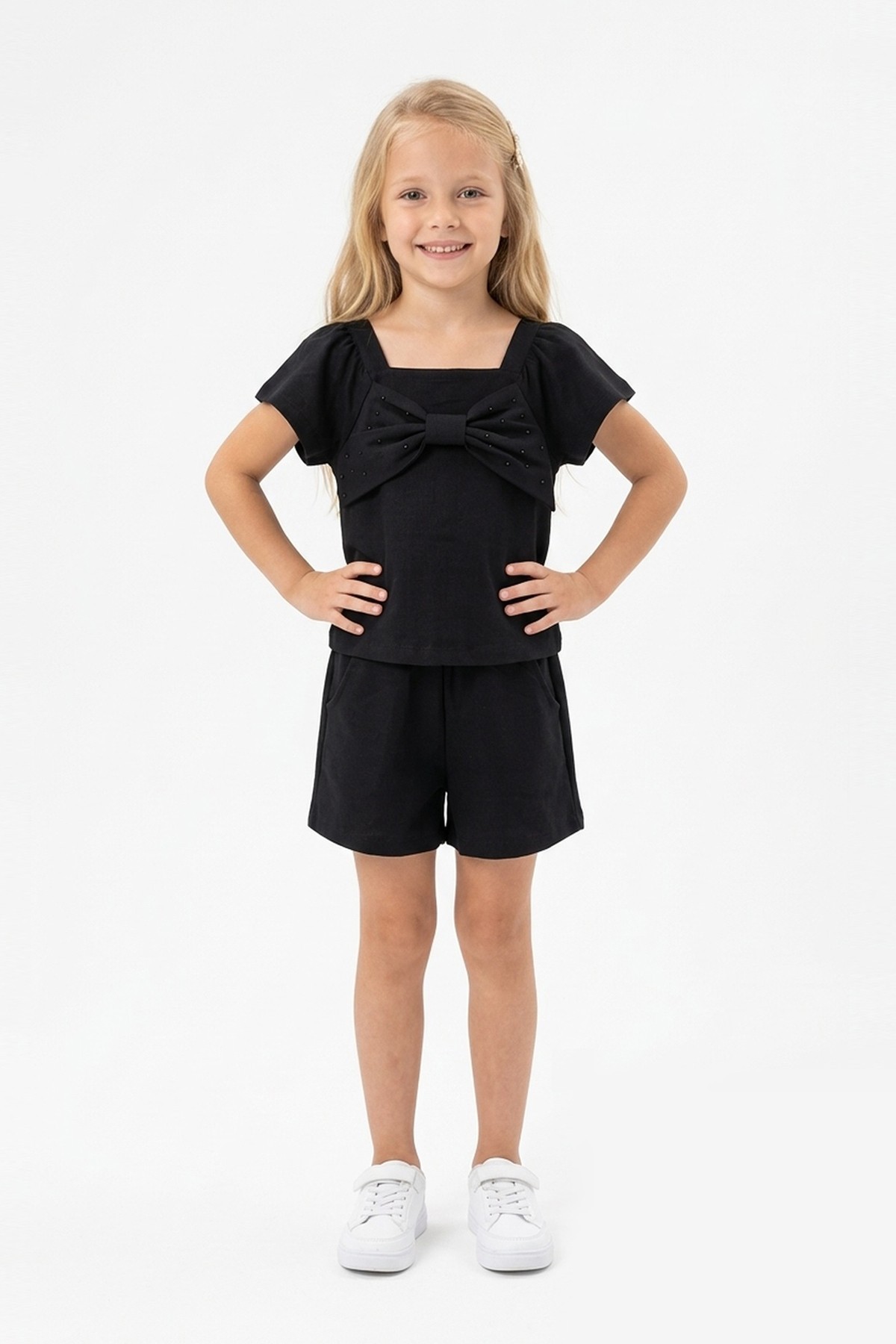 Kız Çocuk Önü Fiyonk Taş Baskılı Kare Yaka Tişört %100 Pamuk Süprem Kumaş Cepli Şortlu Takım