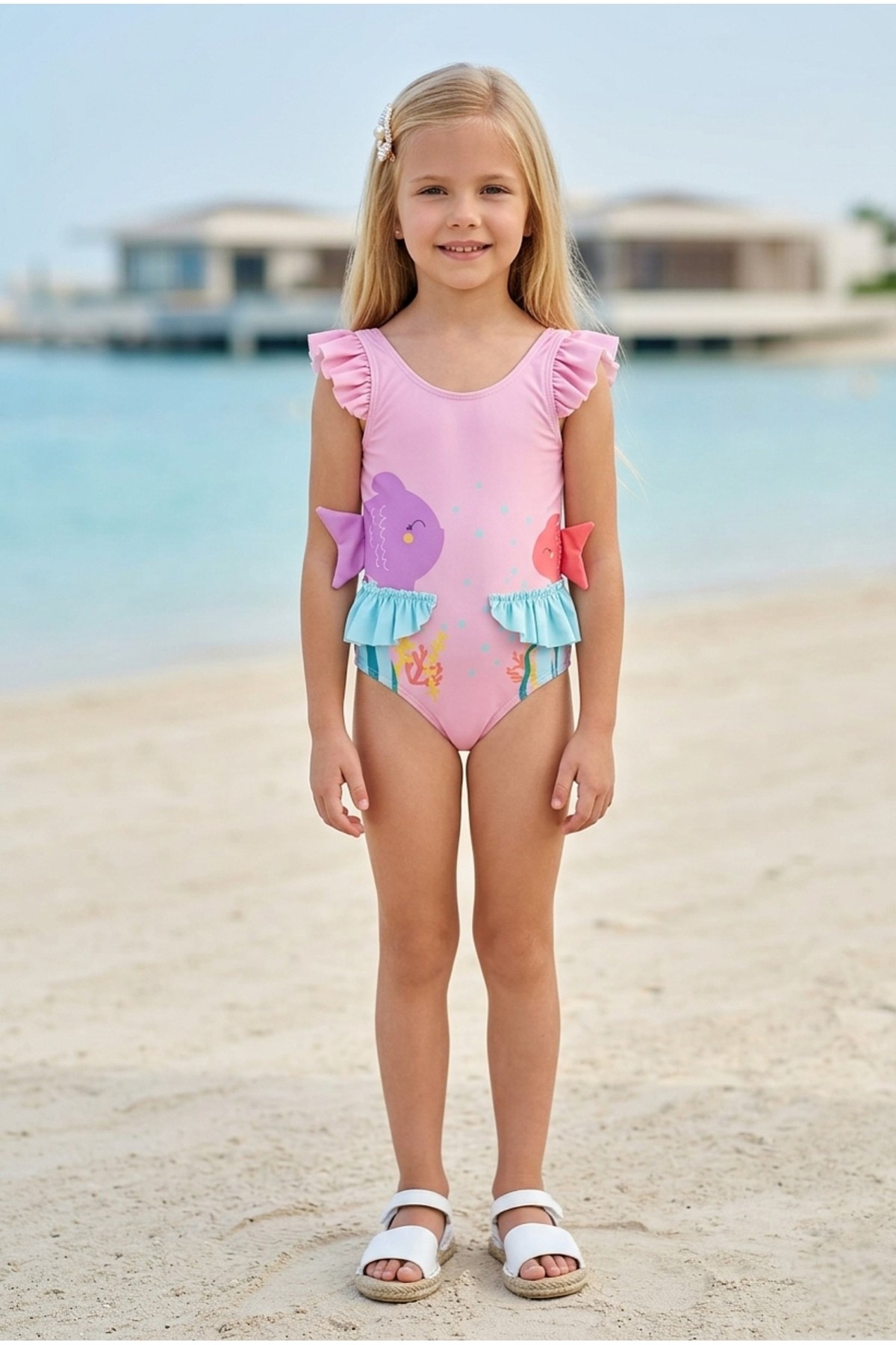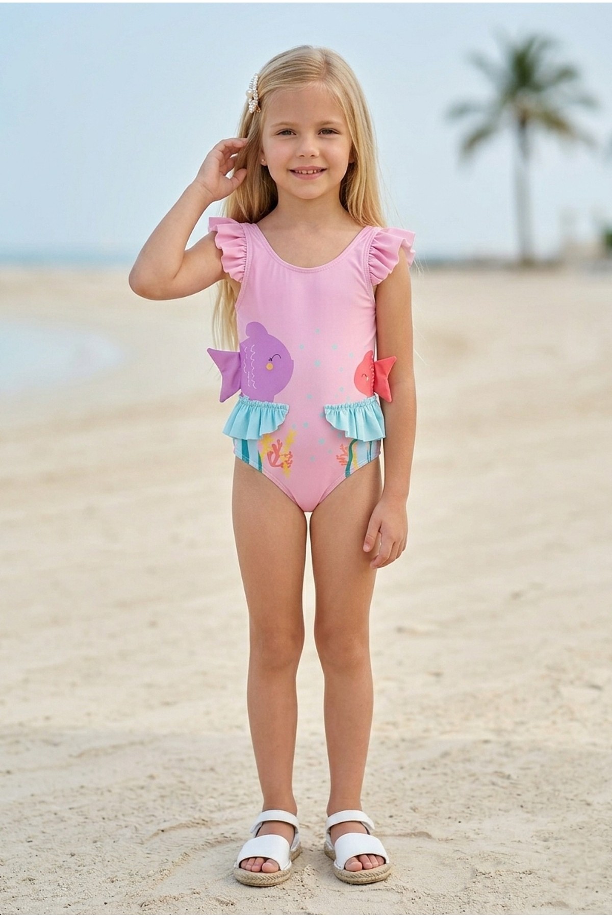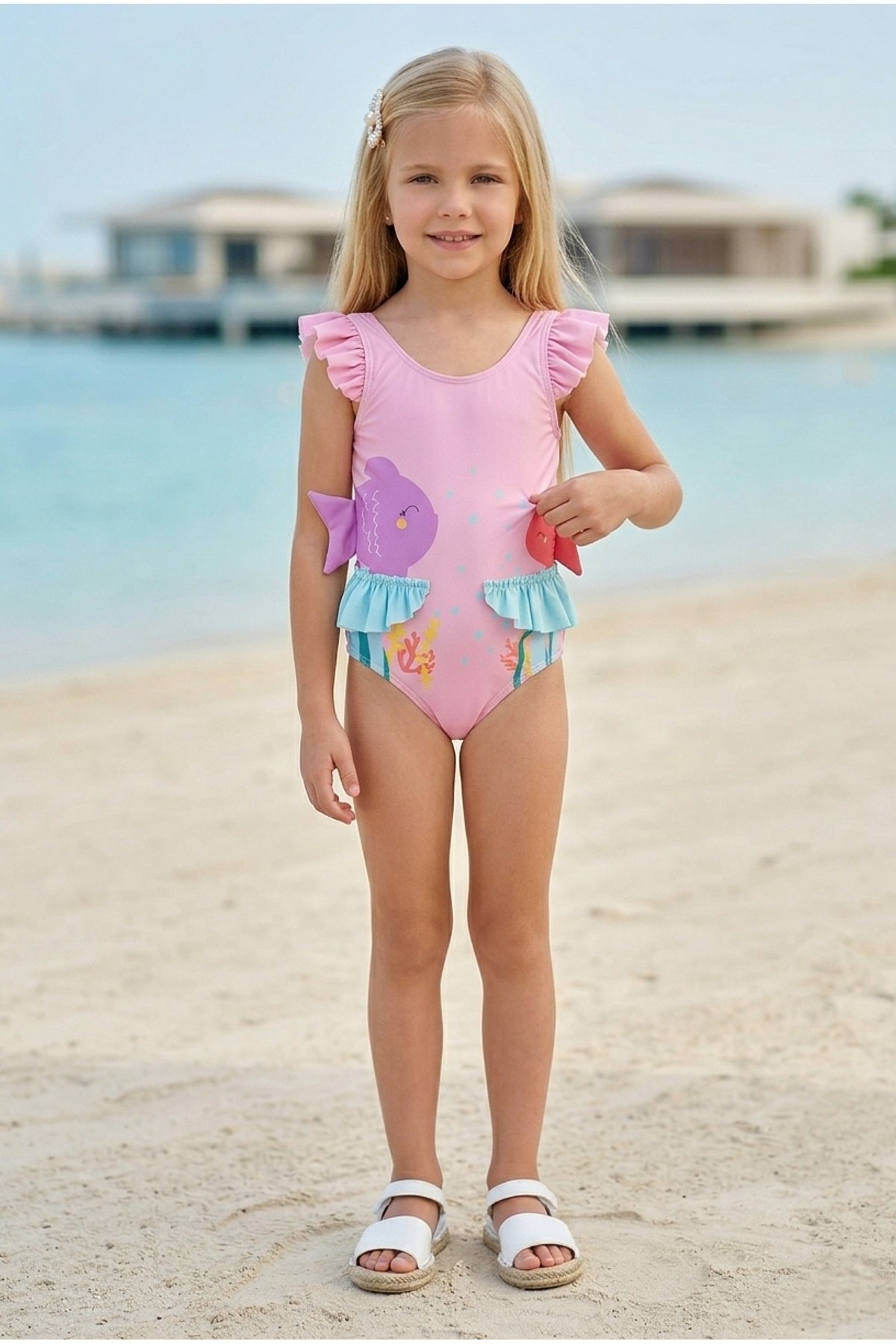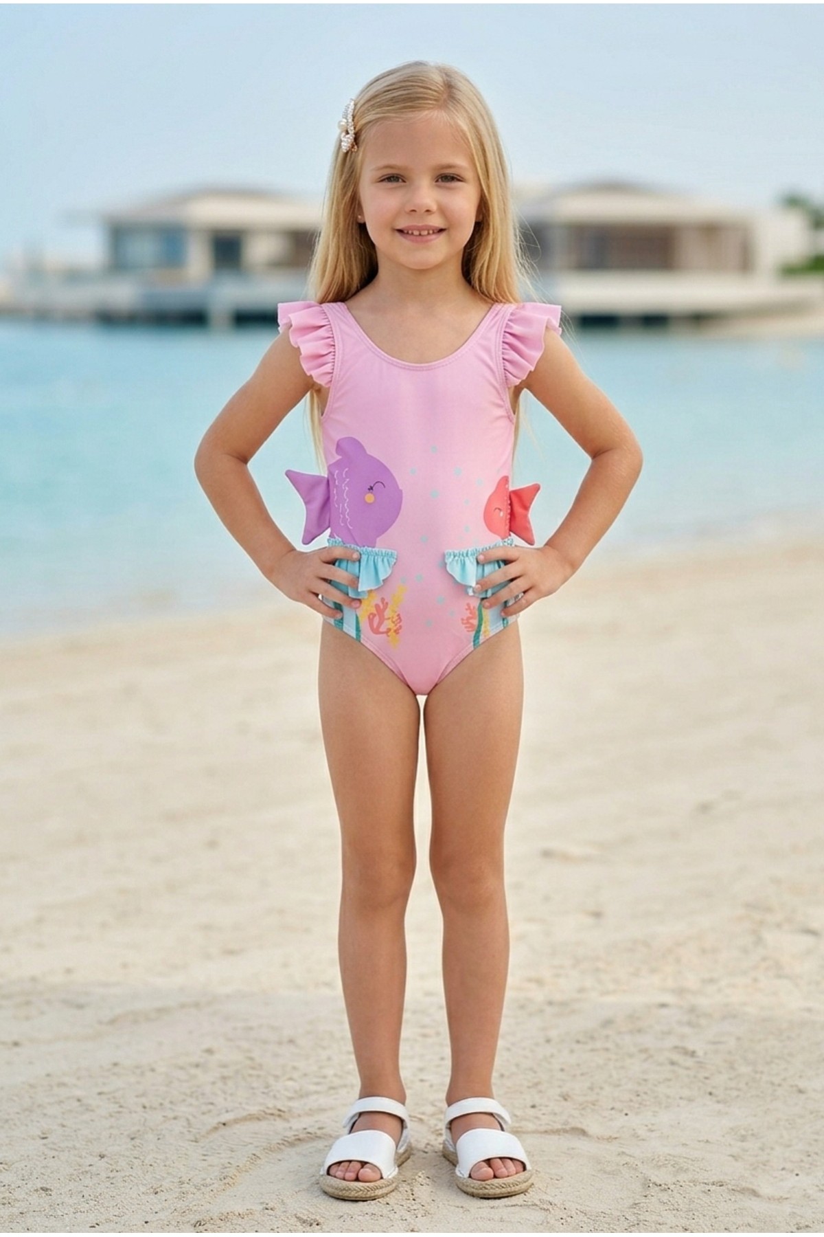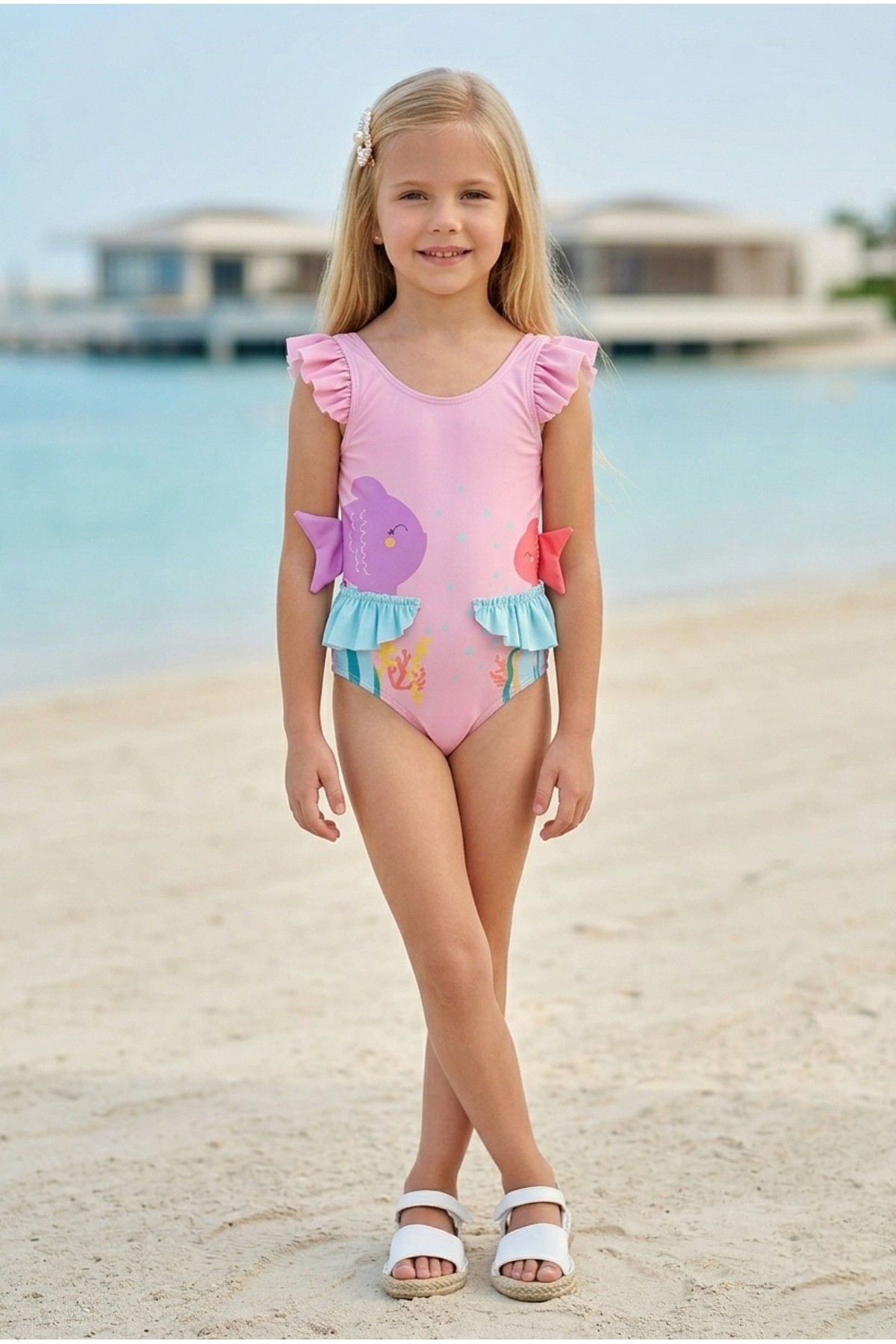 Kız Çocuk Polyester + Elastan Balık Desenli Omuzları Fırfırlı ve Belden Yan Yüzgeç Detaylı Şık Tasarım Mayo