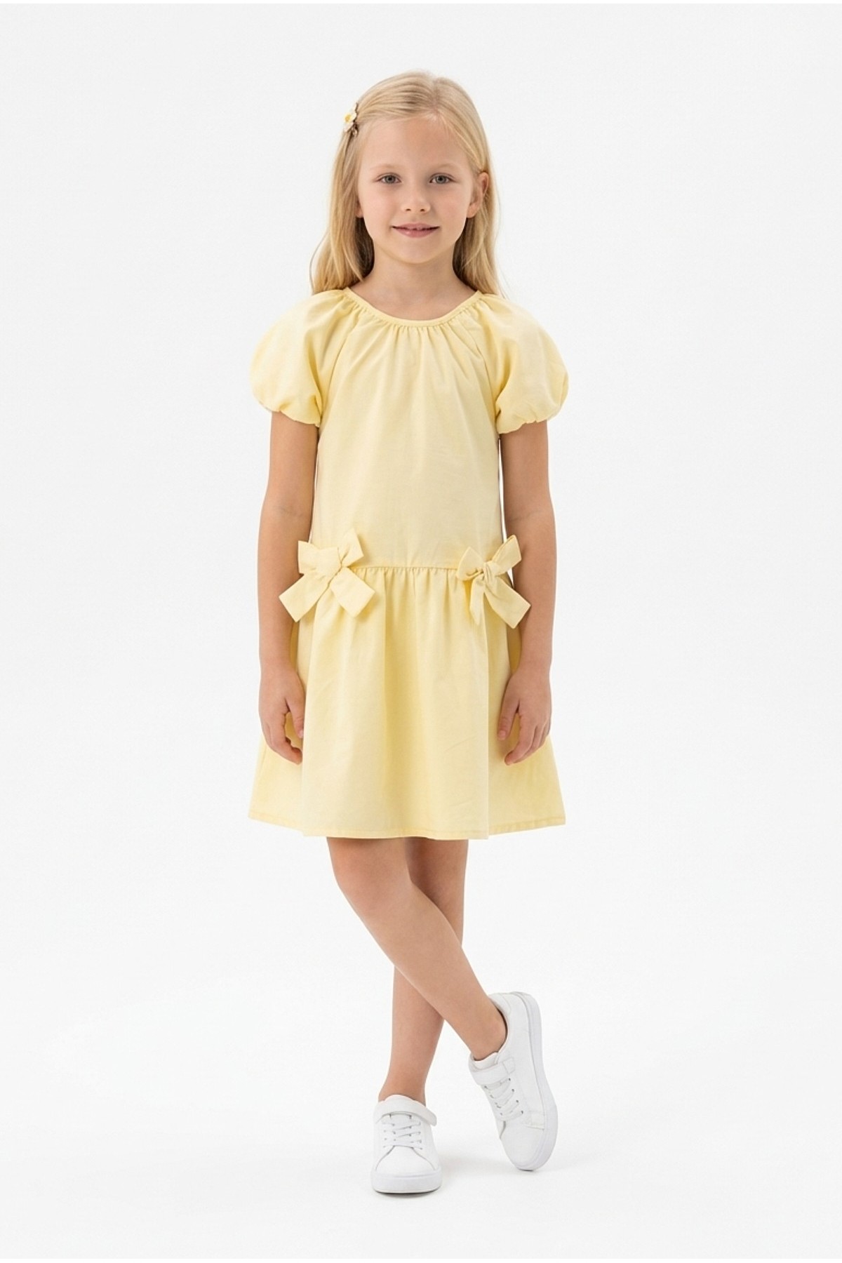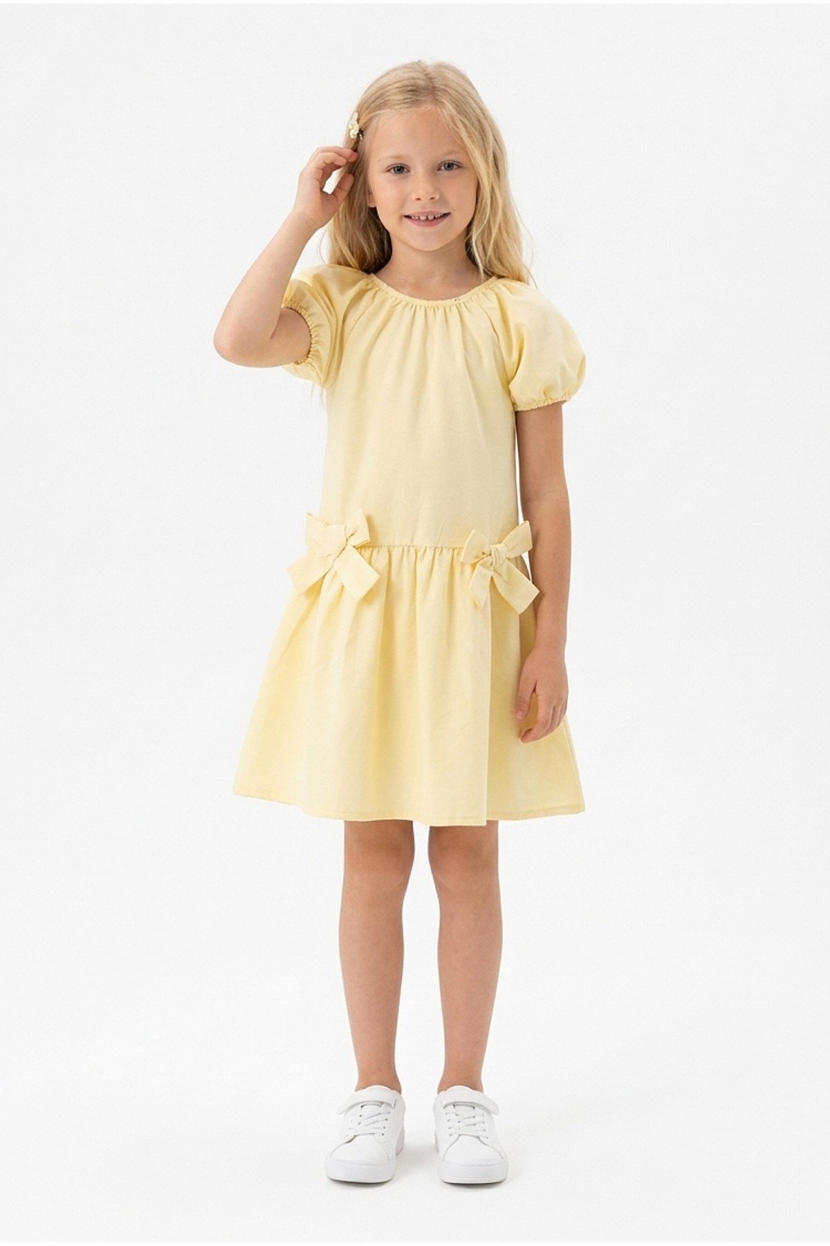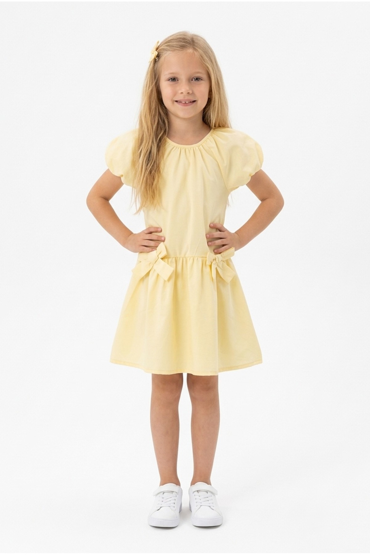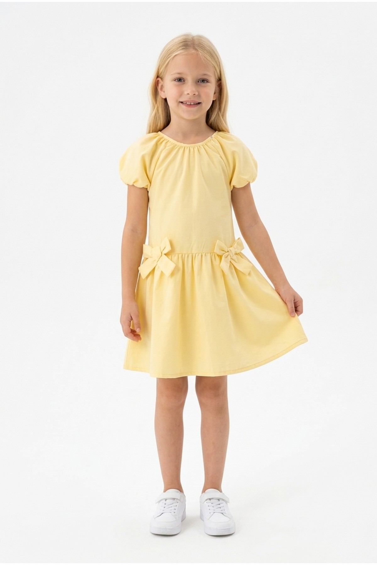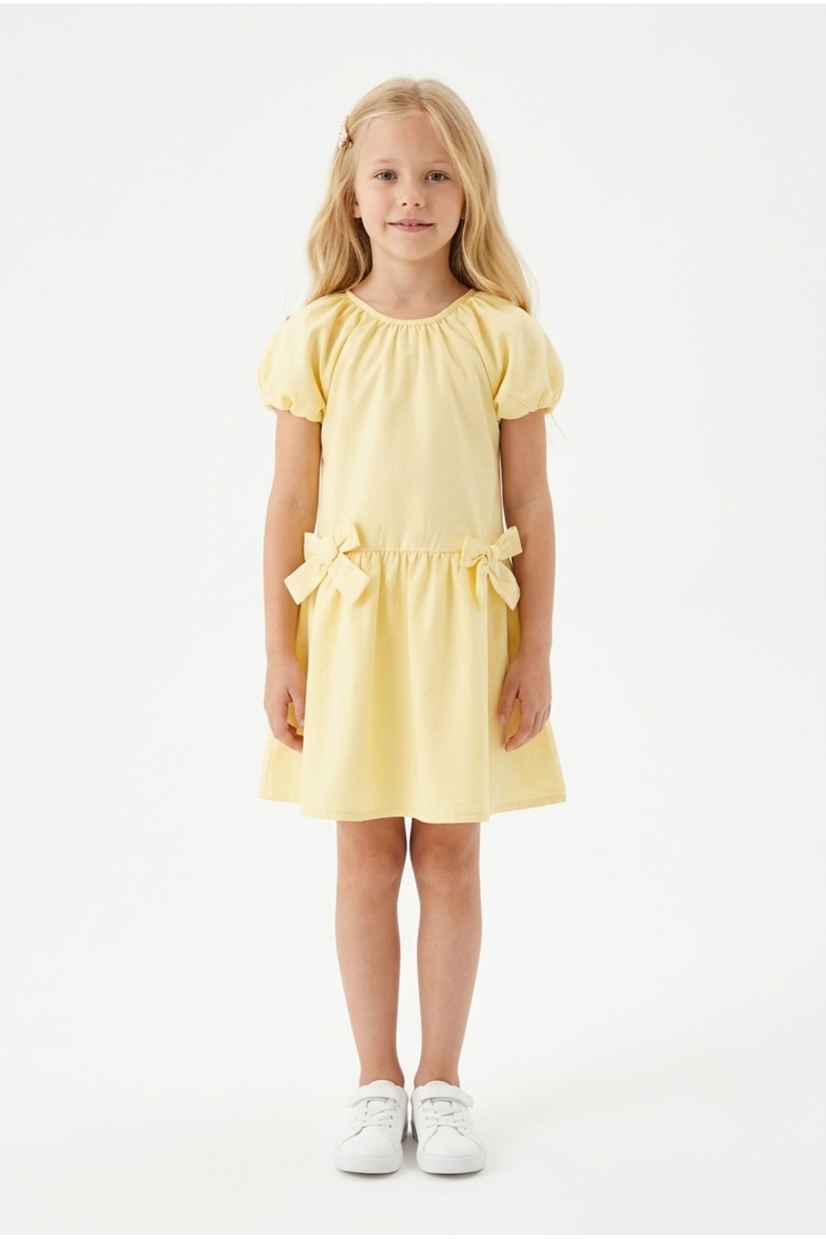 Kız Çocuk Karpuz Kollu Fiyonk Detay %100 Pamuk Vual Kumaş Elbise