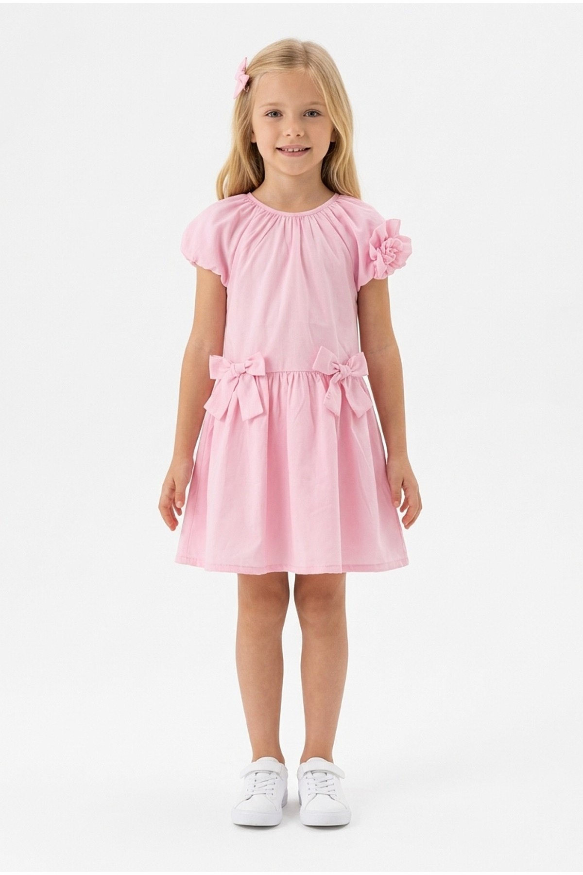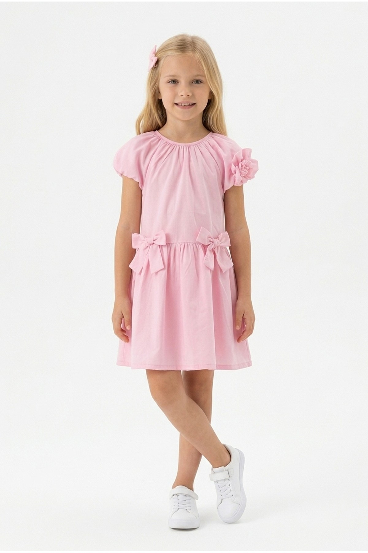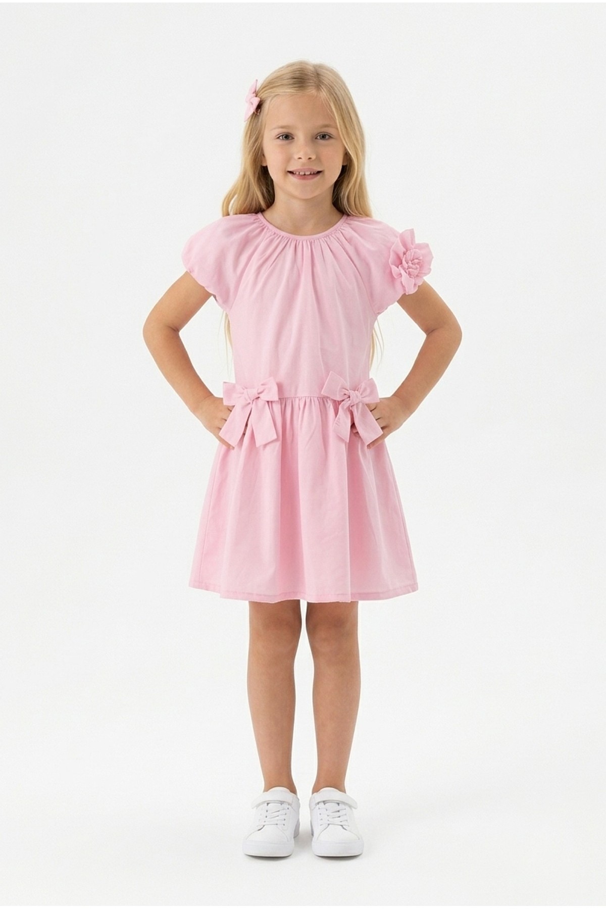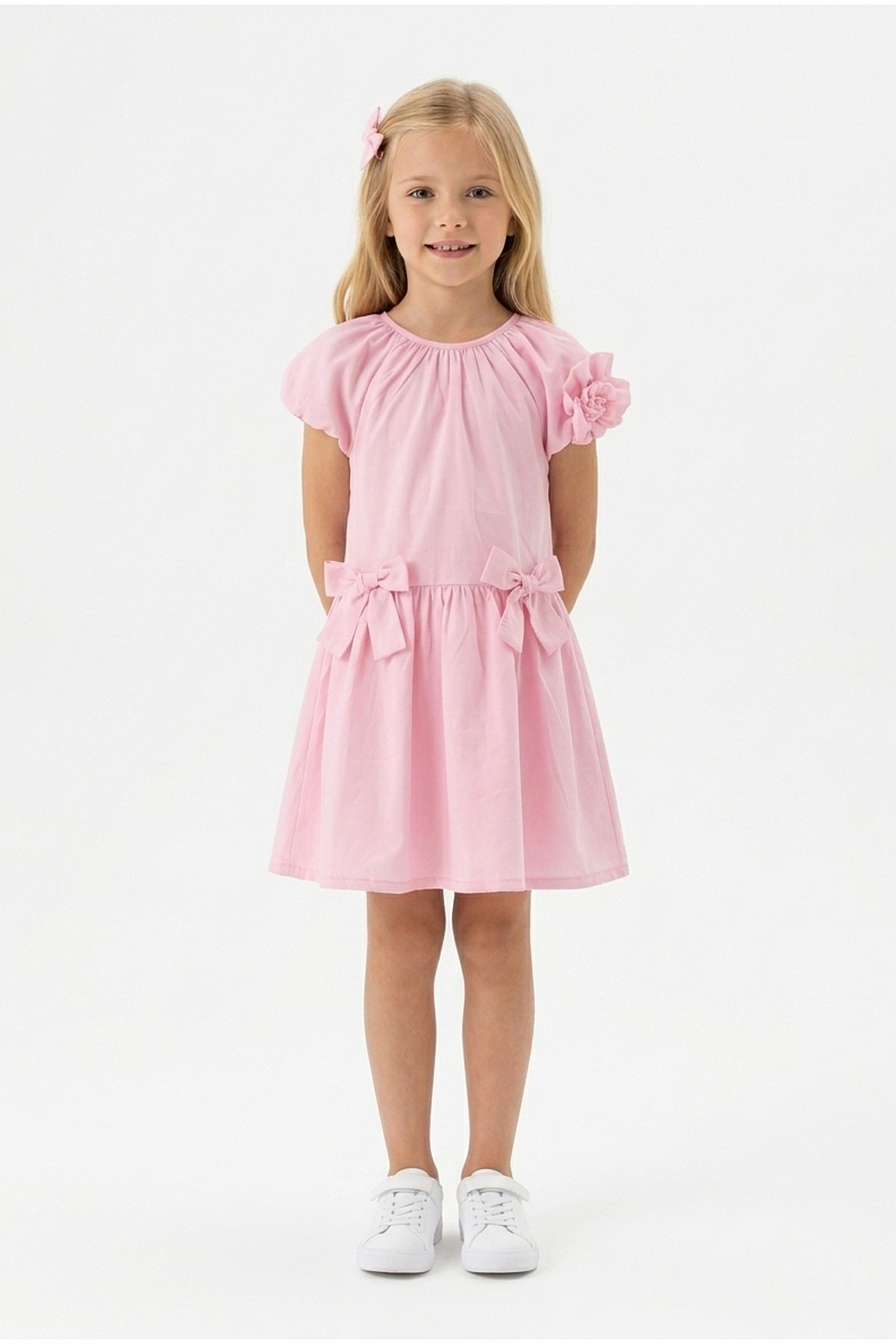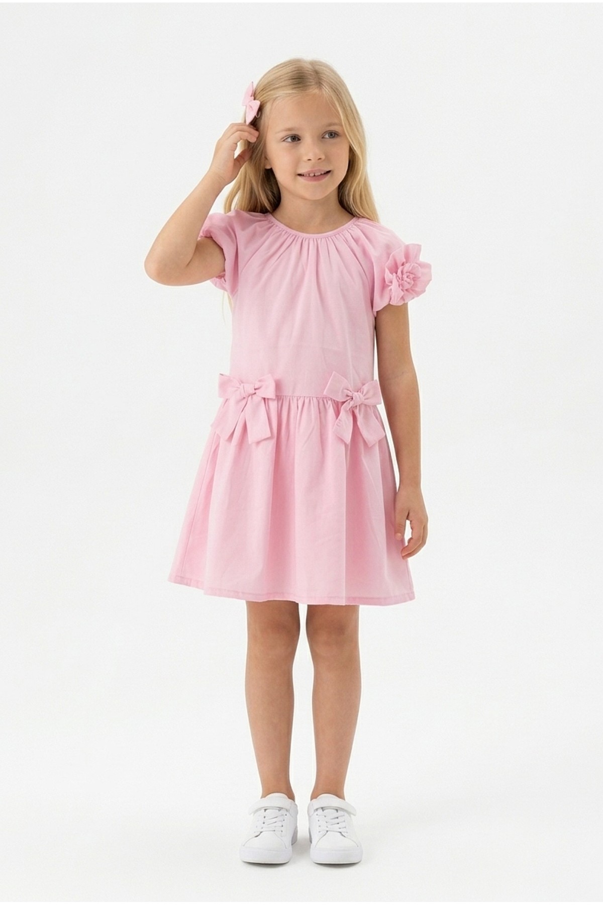 Kız Çocuk Karpuz Kollu Fiyonk Detay %100 Pamuk Vual Kumaş Elbise