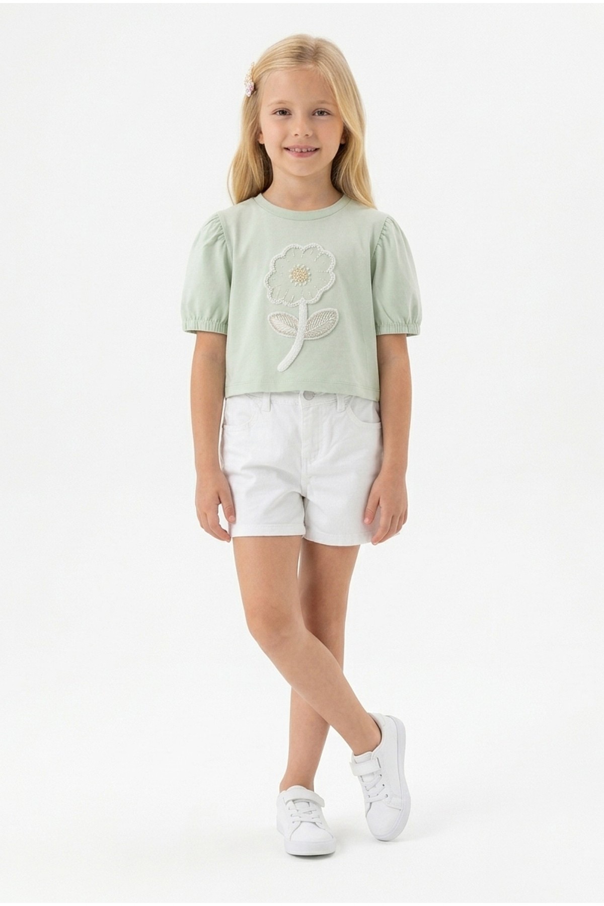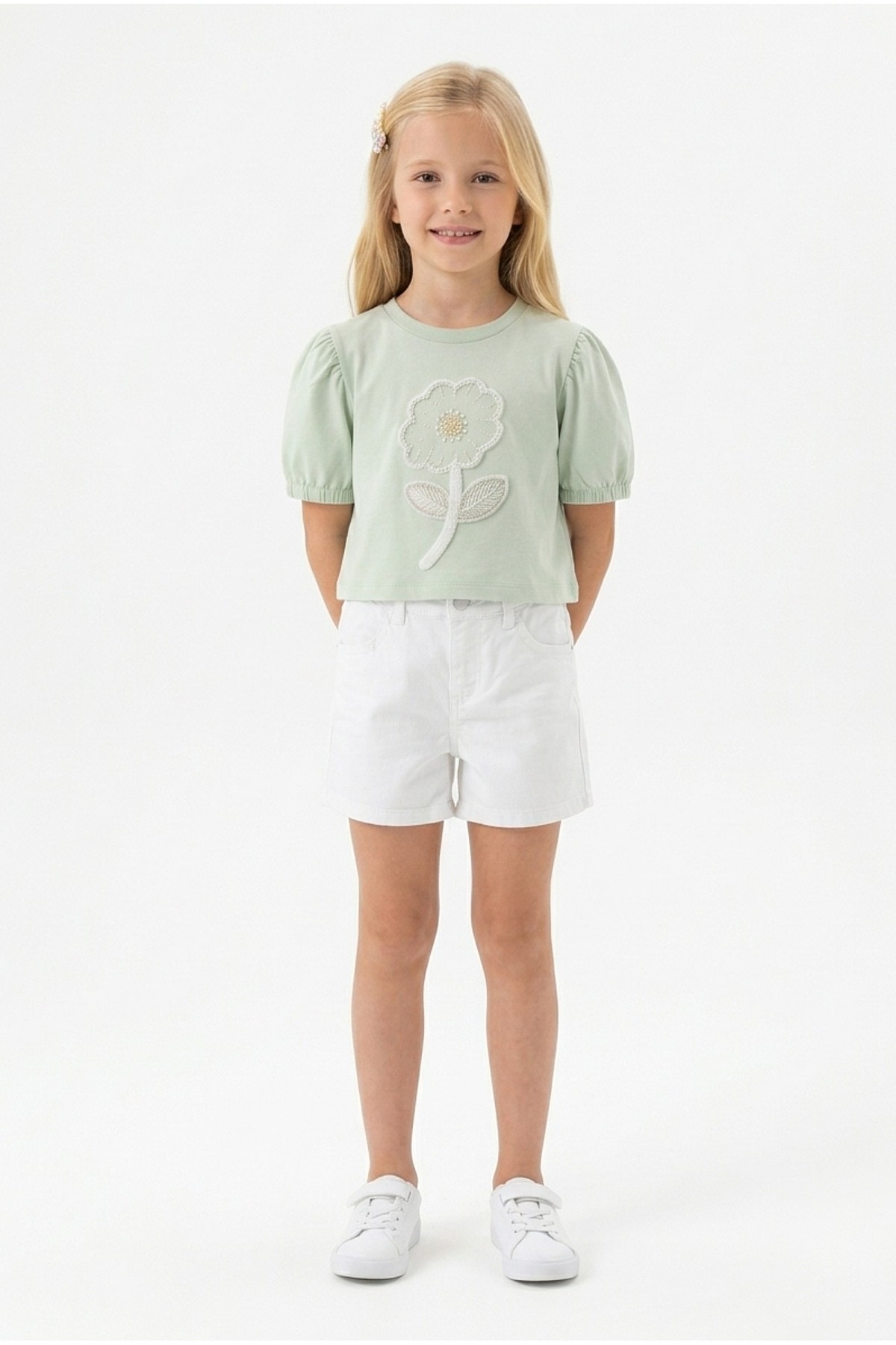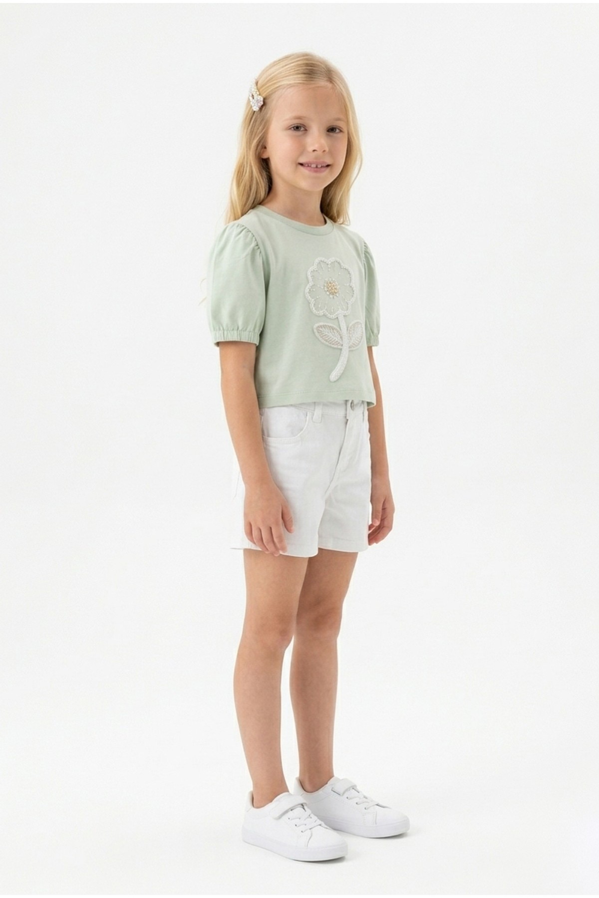 Kız Çocuk İnci ve Pul İşlemeli Papatya Nakışlı Tişört Ve Gabardin Kumaş Yazlık Şortlu Takım