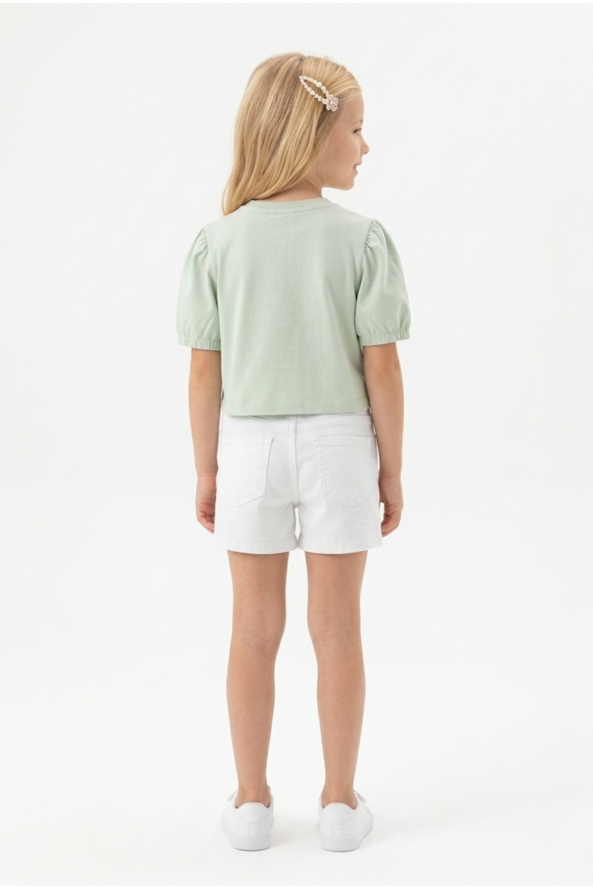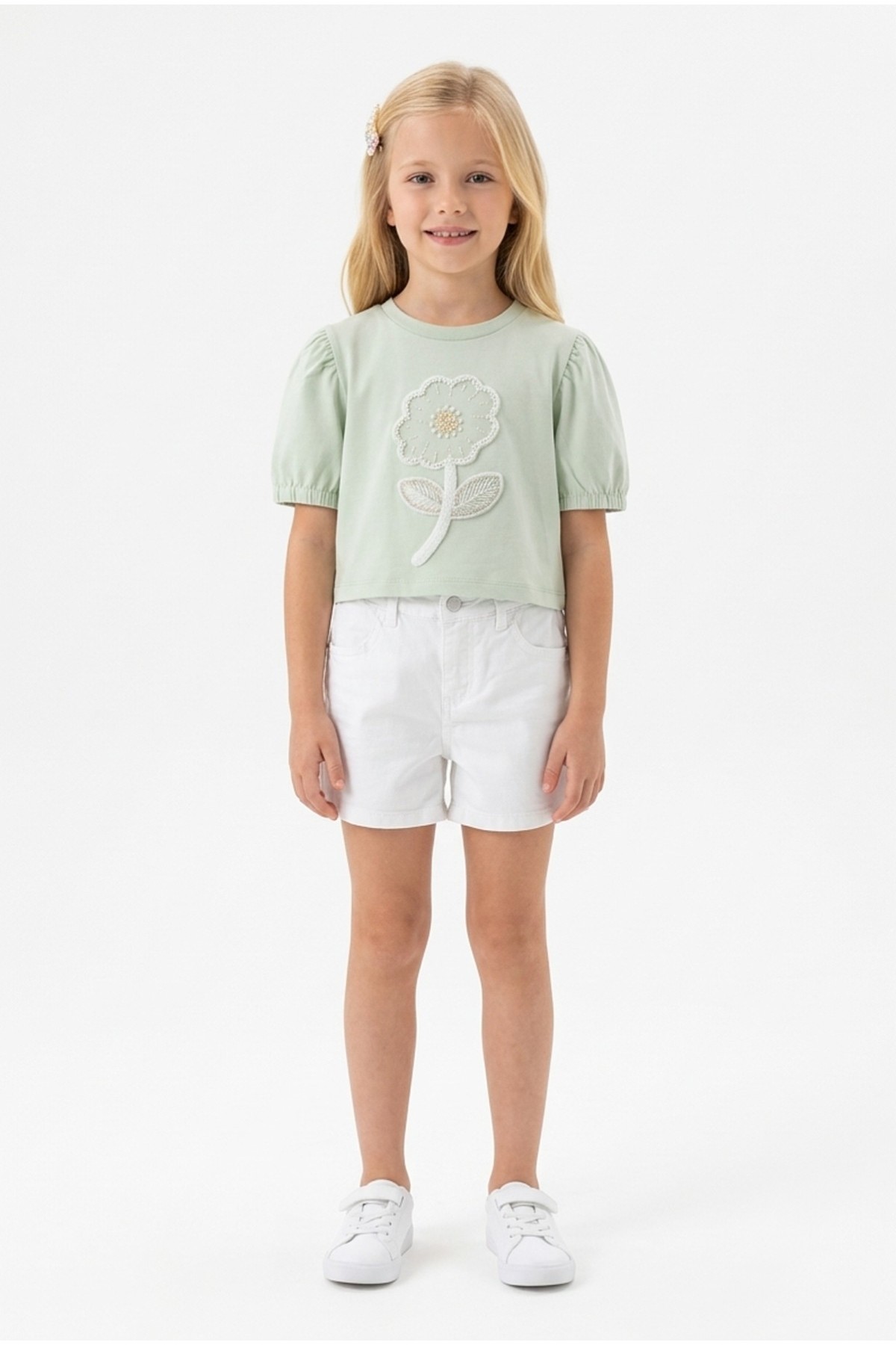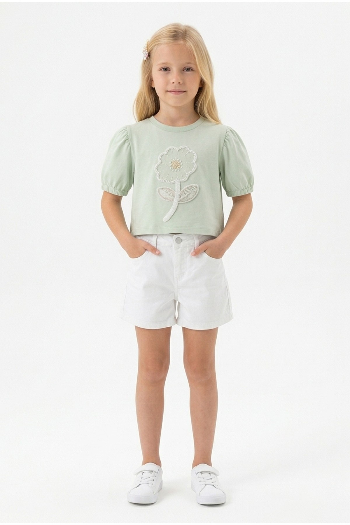 Kız Çocuk İnci ve Pul İşlemeli Papatya Nakışlı Tişört Ve Gabardin Kumaş Yazlık Şortlu Takım