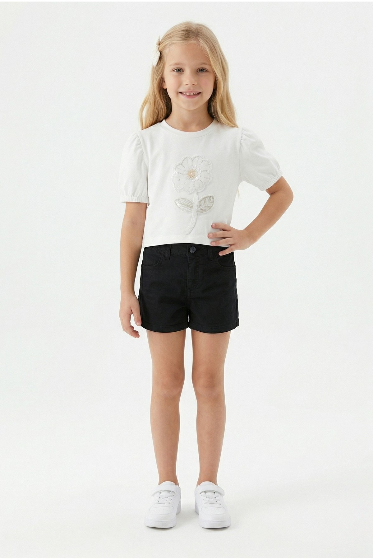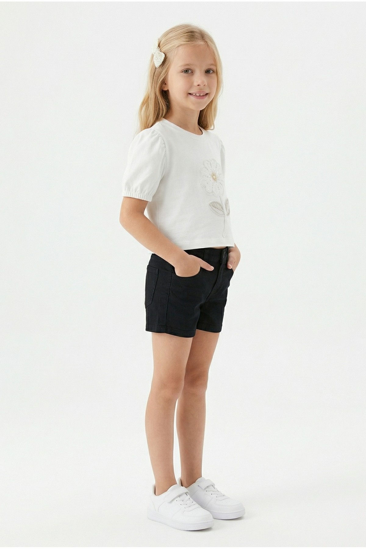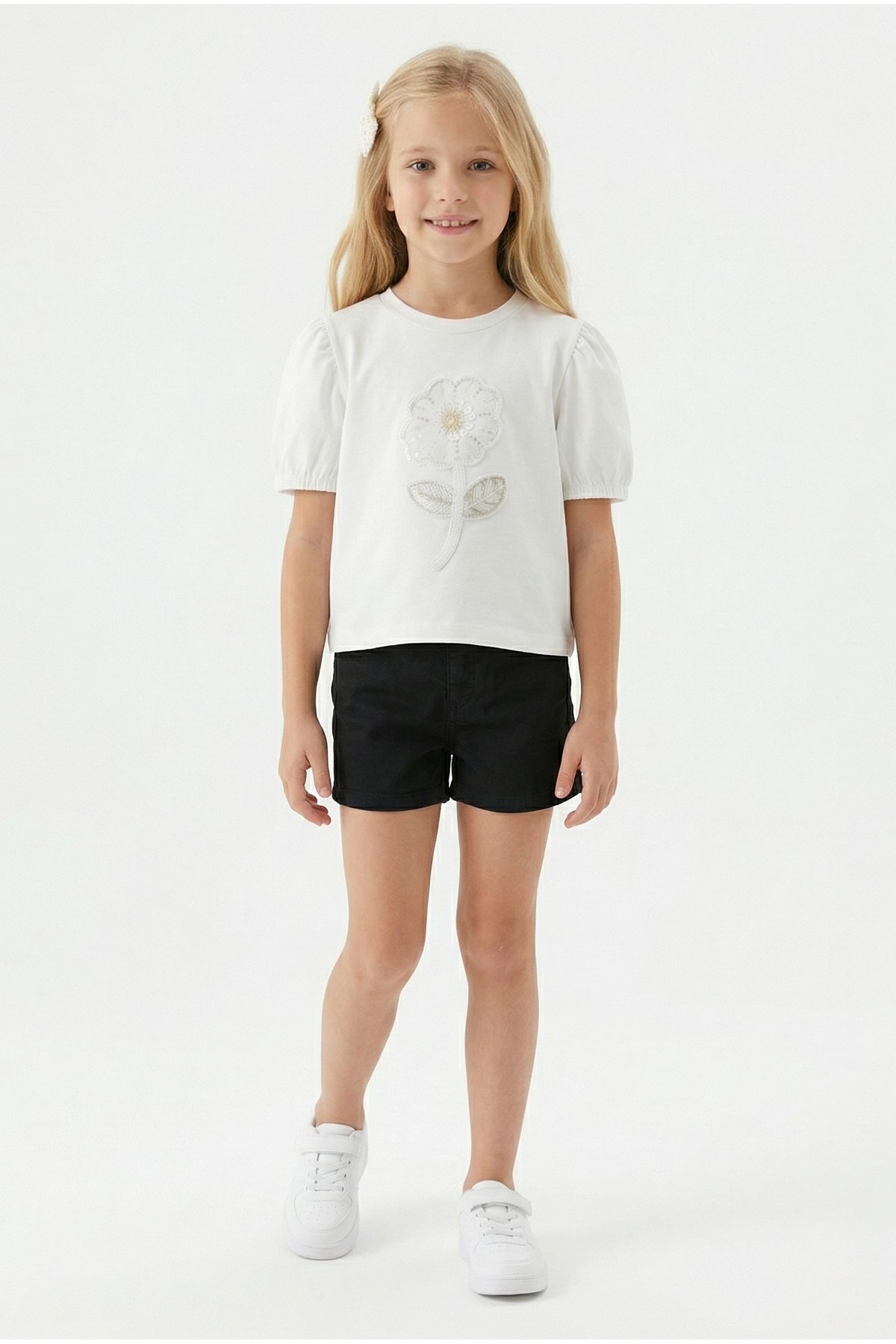 Kız Çocuk İnci ve Pul İşlemeli Papatya Nakışlı Tişört Ve Gabardin Kumaş Yazlık Şortlu Takım