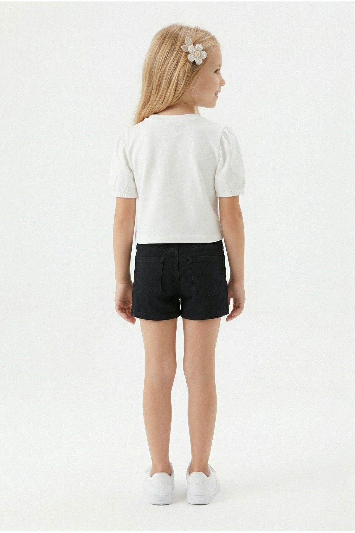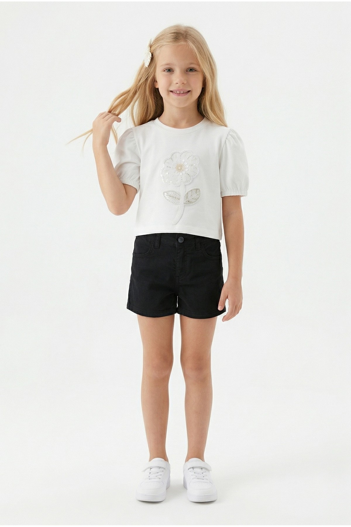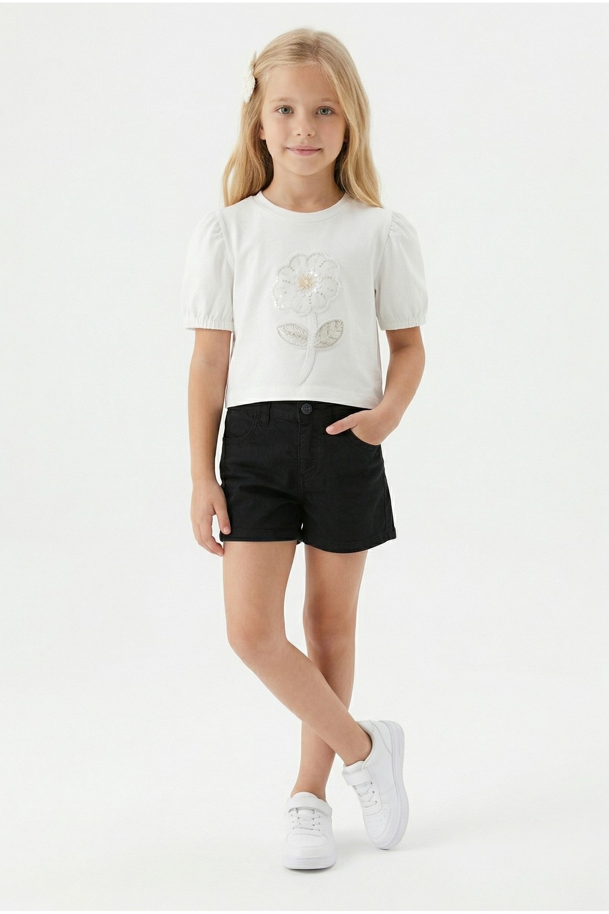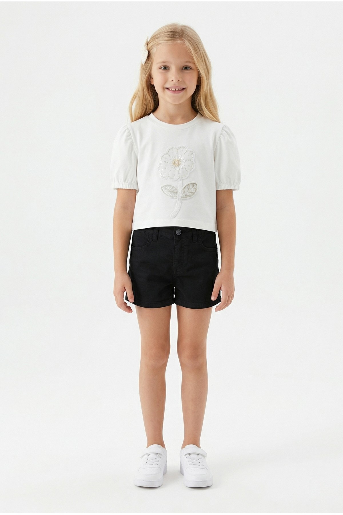 Kız Çocuk İnci ve Pul İşlemeli Papatya Nakışlı Tişört Ve Gabardin Kumaş Yazlık Şortlu Takım