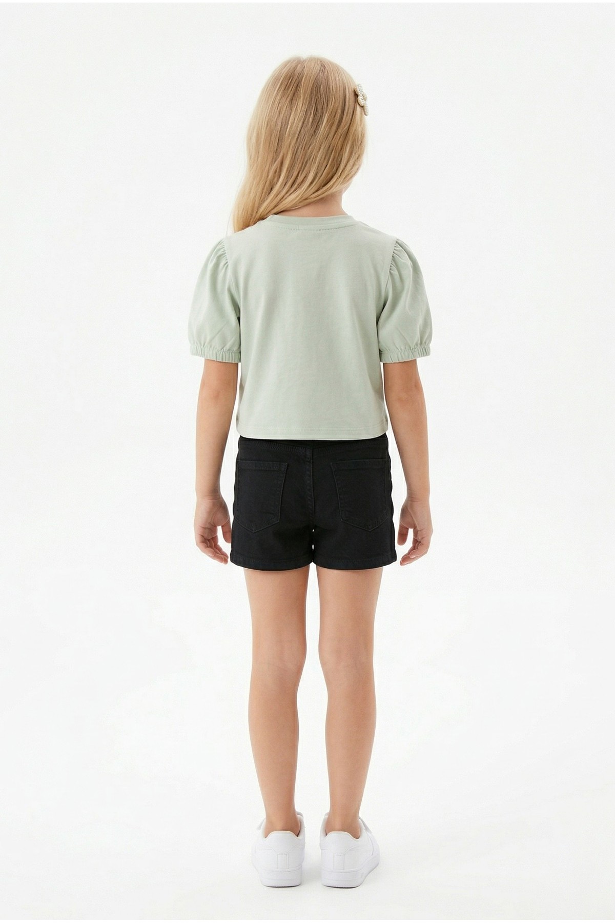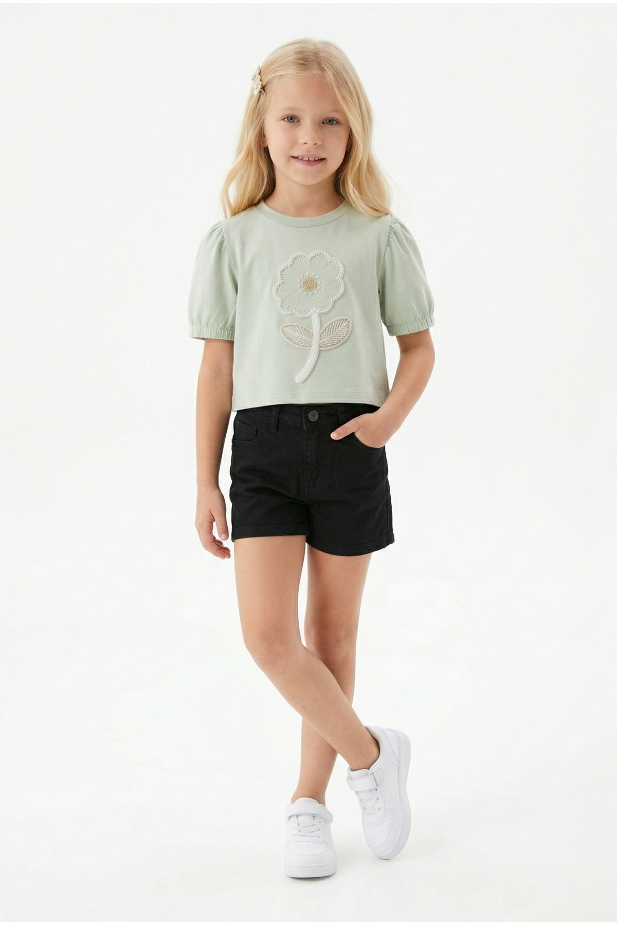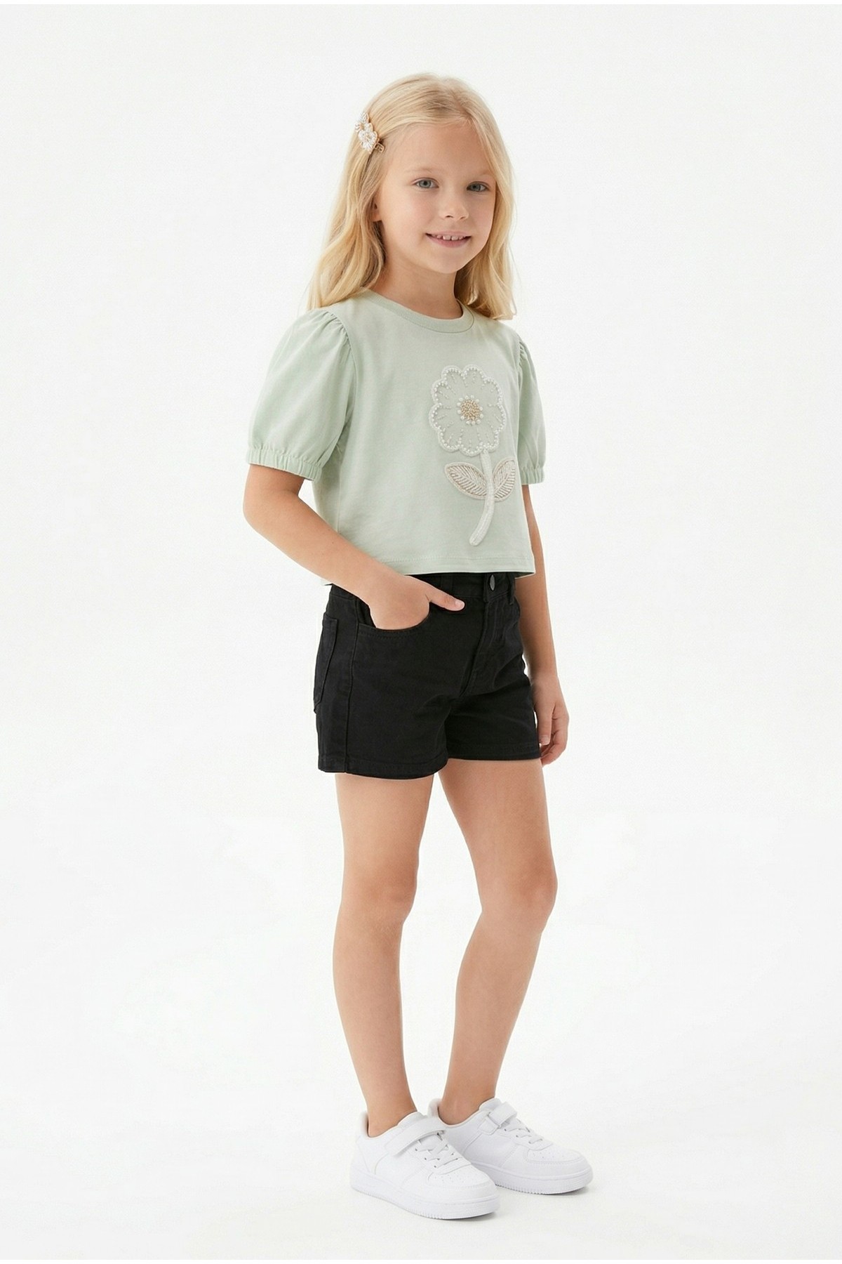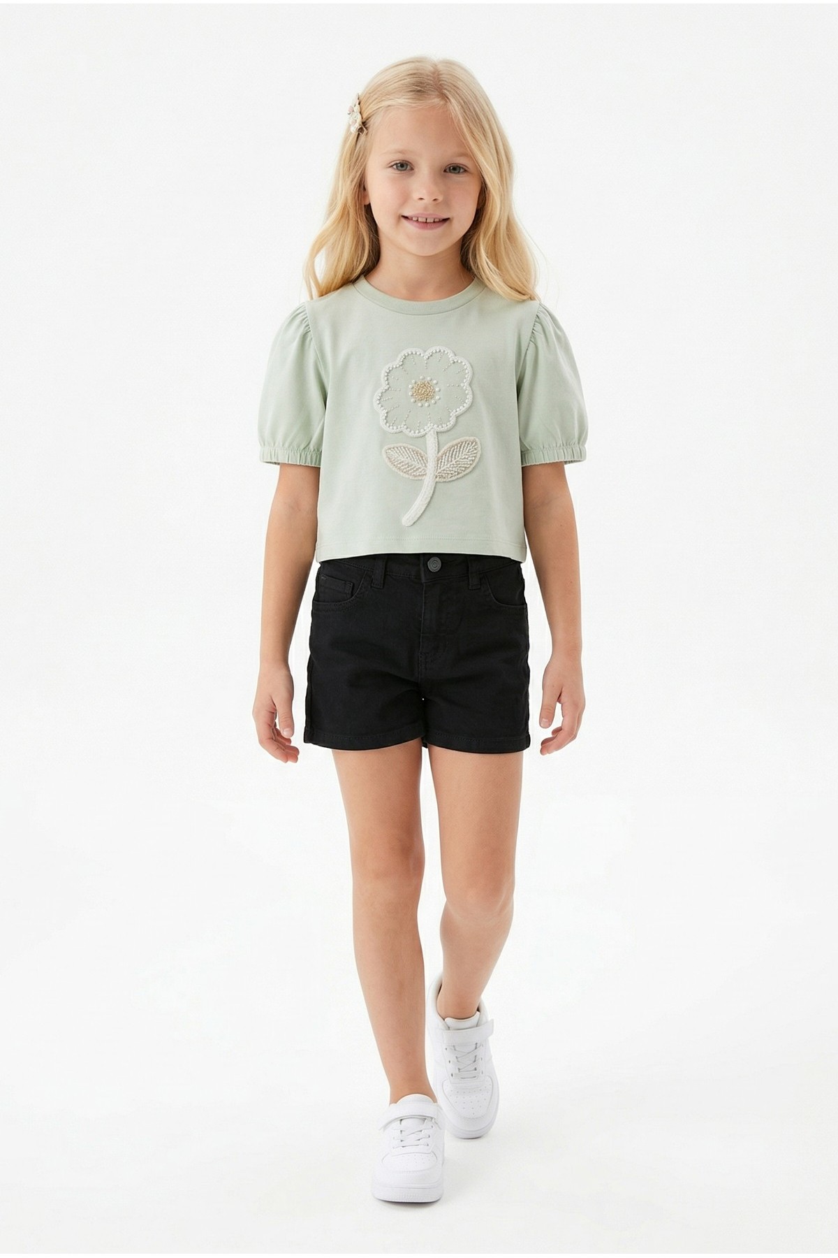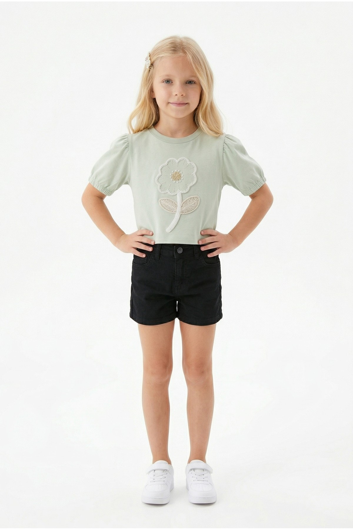 Kız Çocuk İnci ve Pul İşlemeli Papatya Nakışlı Tişört Ve Gabardin Kumaş Yazlık Şortlu Takım