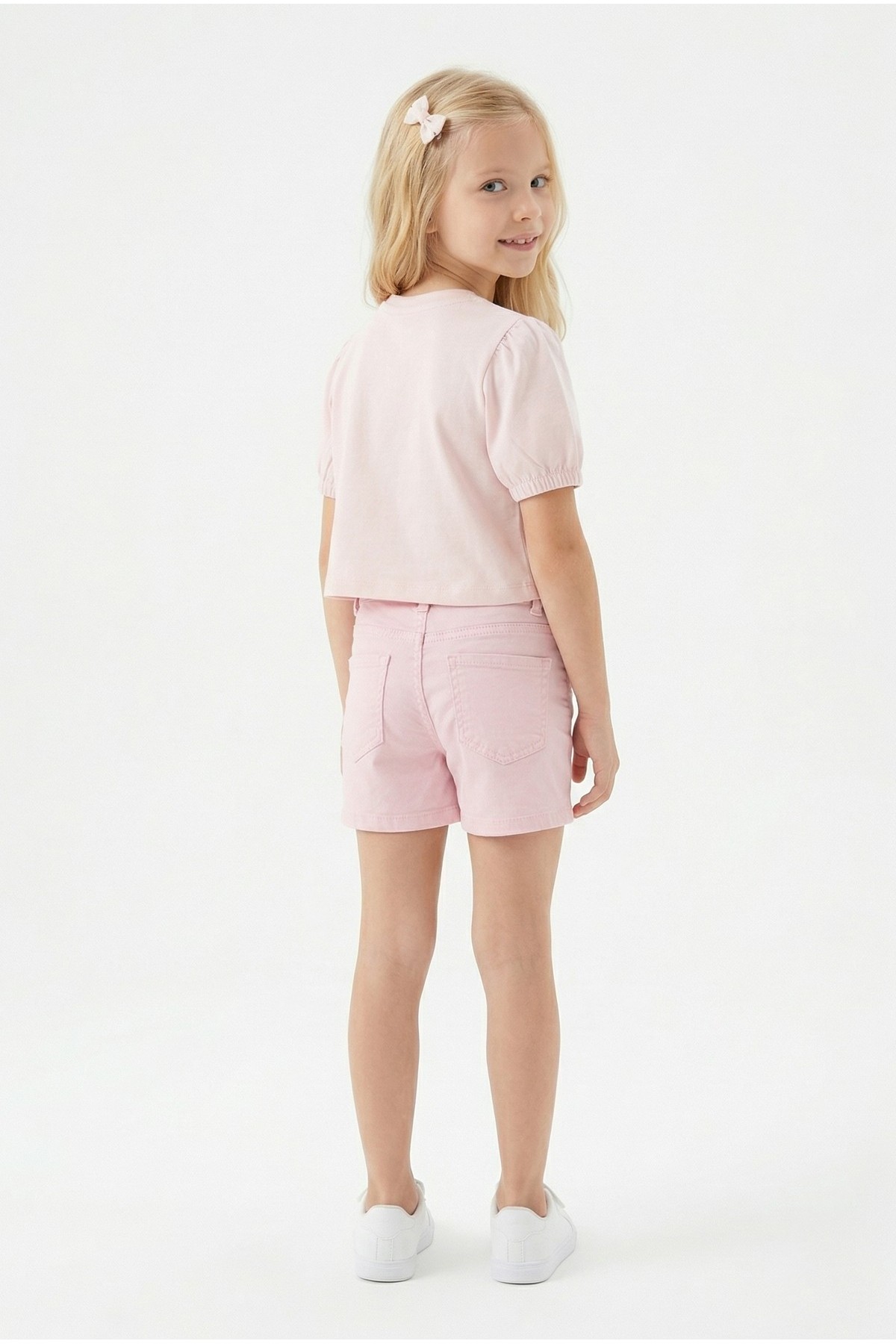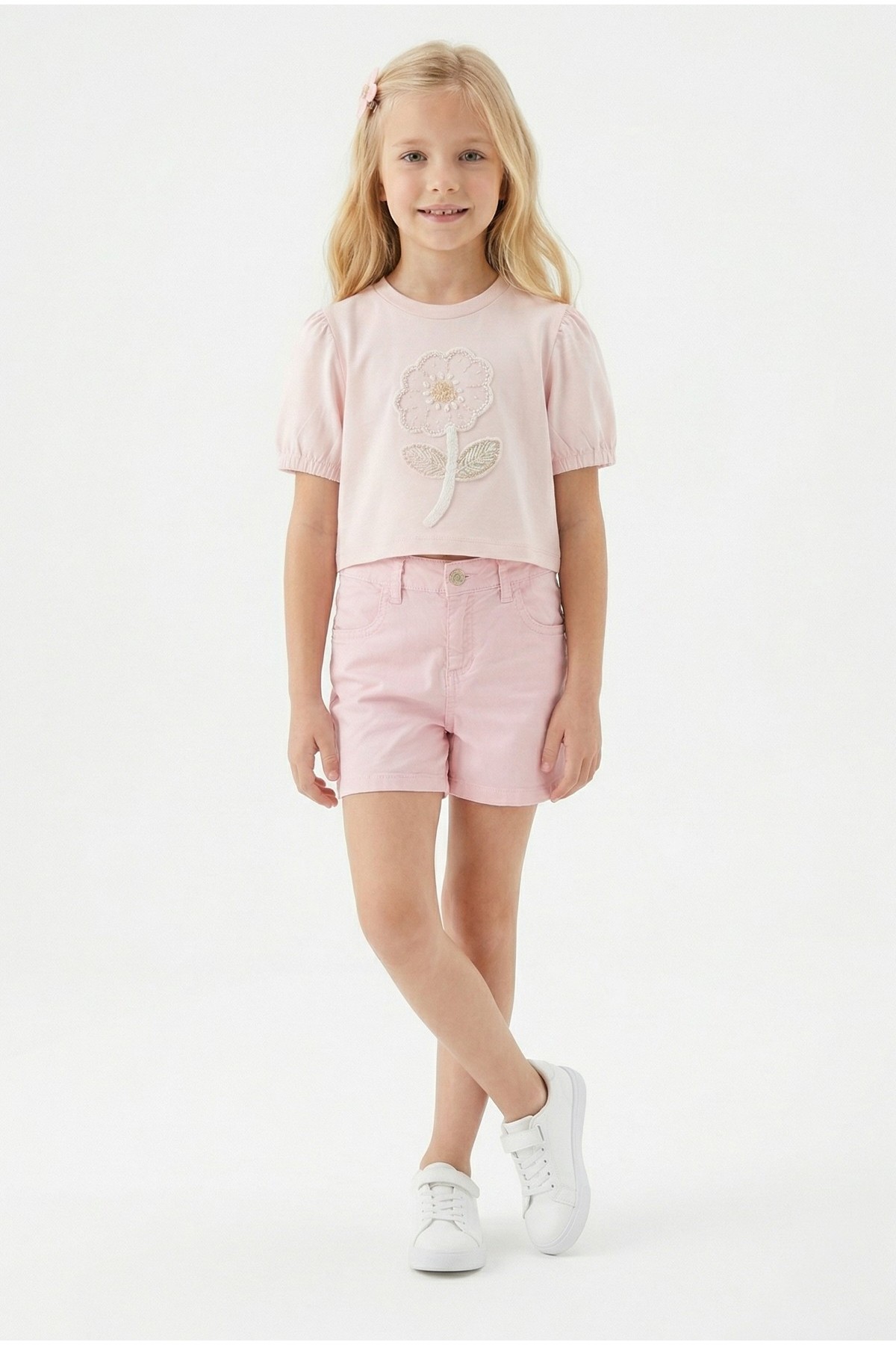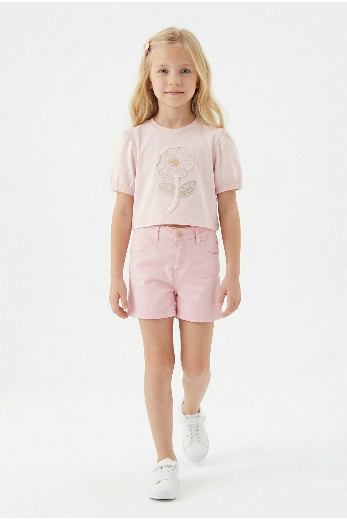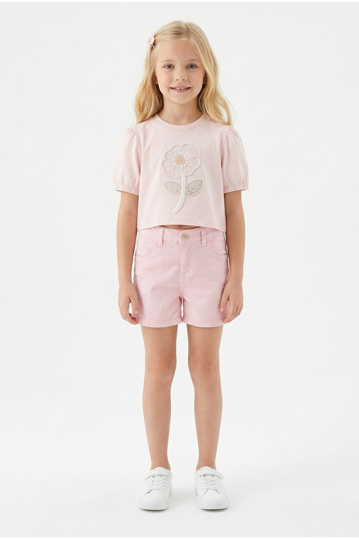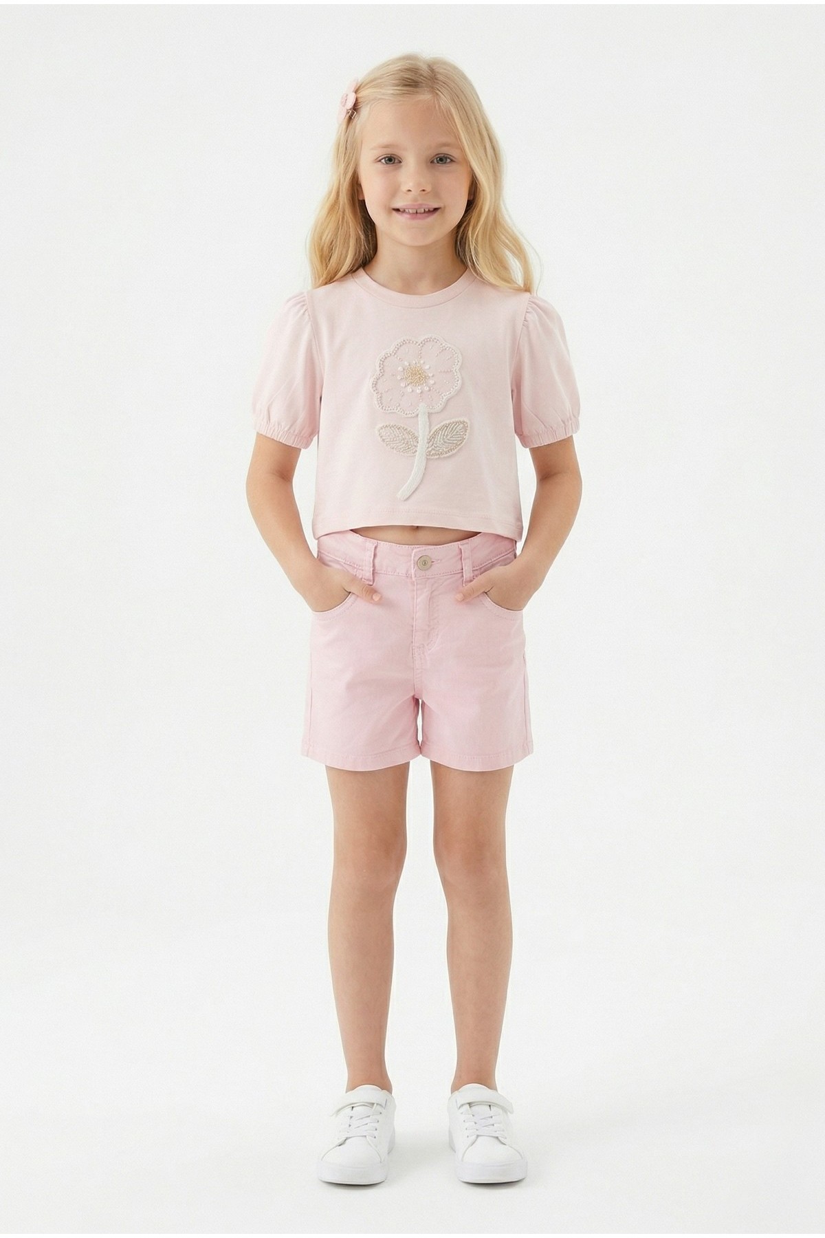 Kız Çocuk İnci ve Pul İşlemeli Papatya Nakışlı Tişört Ve Gabardin Kumaş Yazlık Şortlu Takım