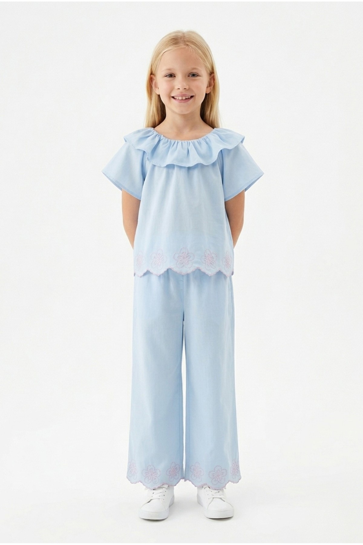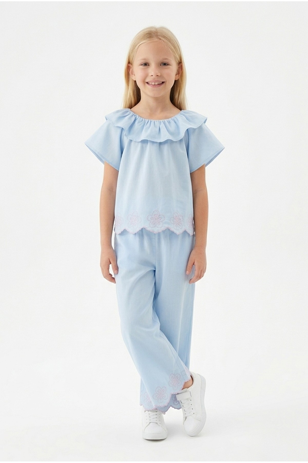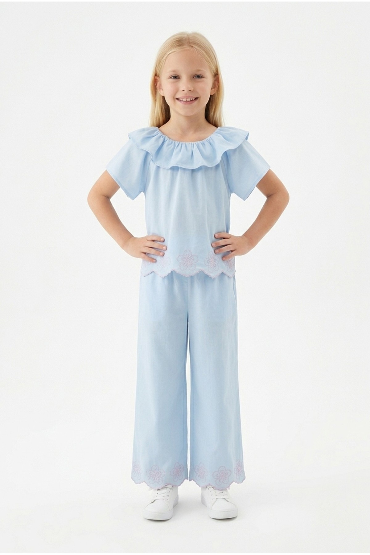 Kız Çocuk Fisto İşlemeli Volanlı Bluz ve Geniş Paça Pantolonlu Vual Kumaş Takım