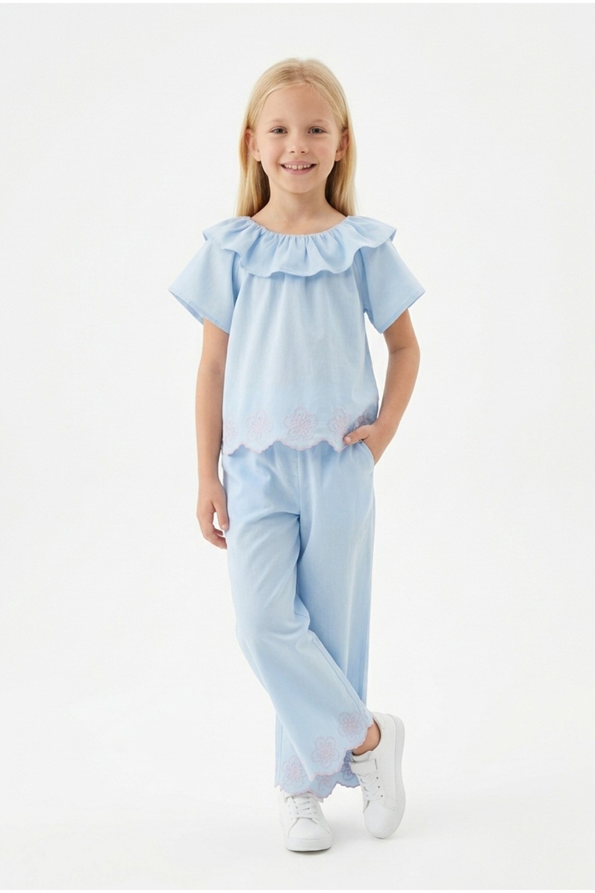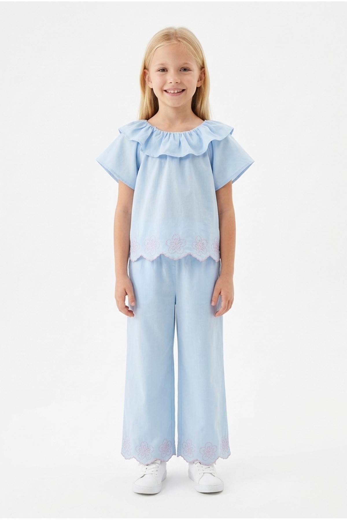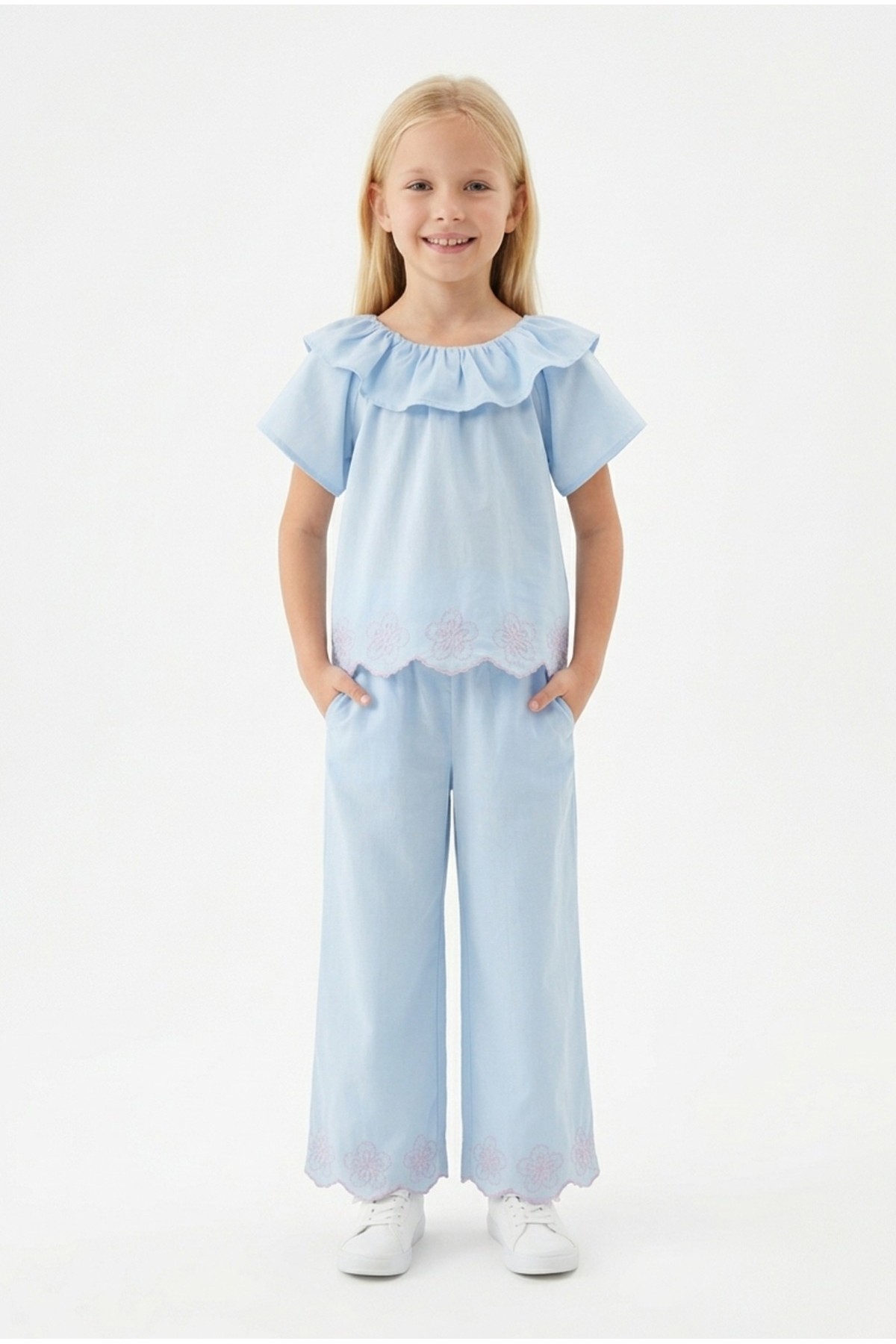 Kız Çocuk Fisto İşlemeli Volanlı Bluz ve Geniş Paça Pantolonlu Vual Kumaş Takım