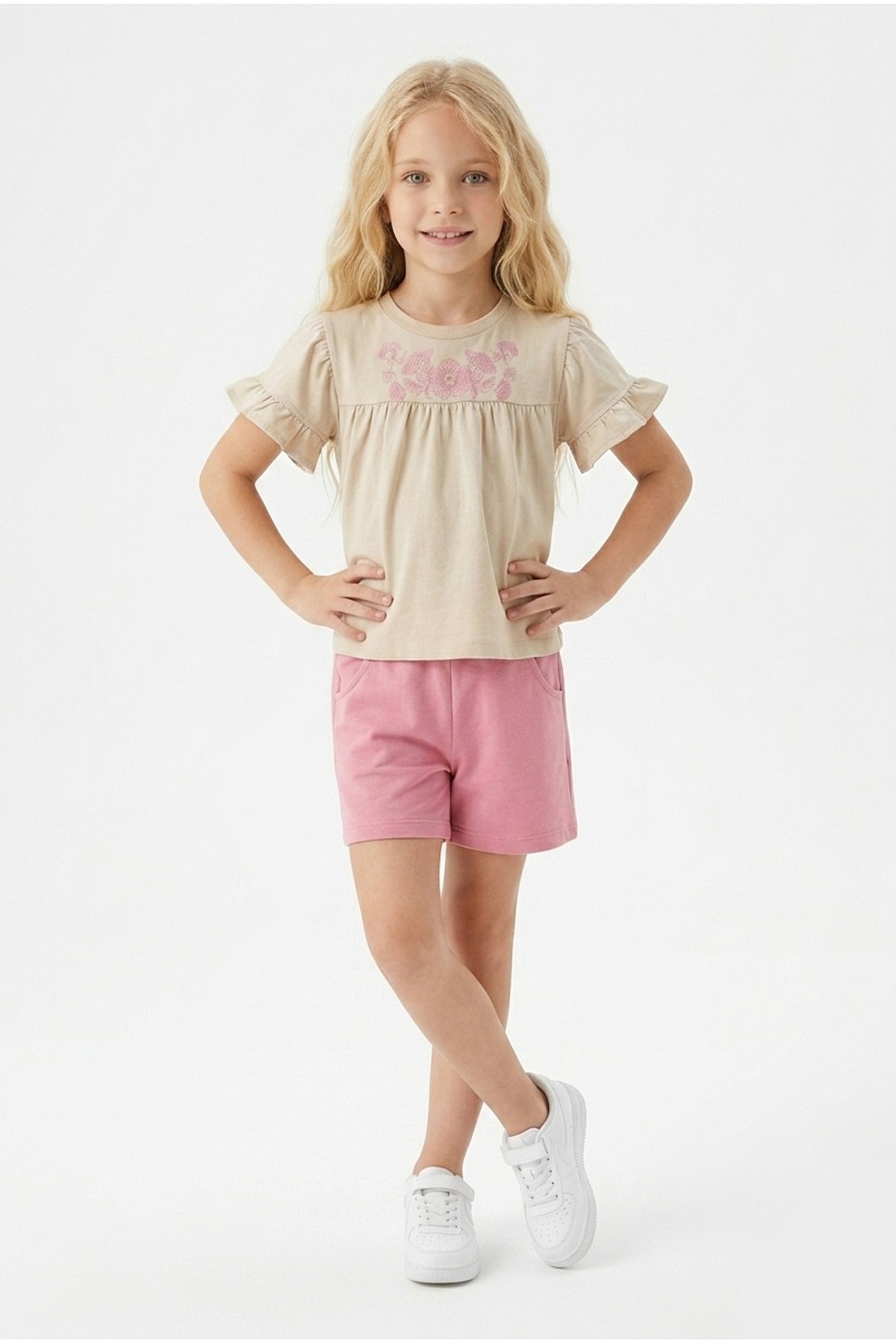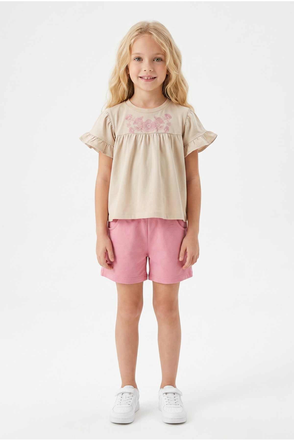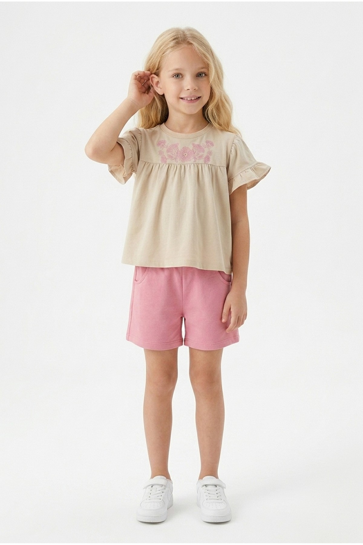 Kız Çocuk Çiçek Baskılı Omuz Fırfırlı 100% Pamuk Süprem Kumaş Tişört İki İplik Bel Büzgülü Şortlu Takım
