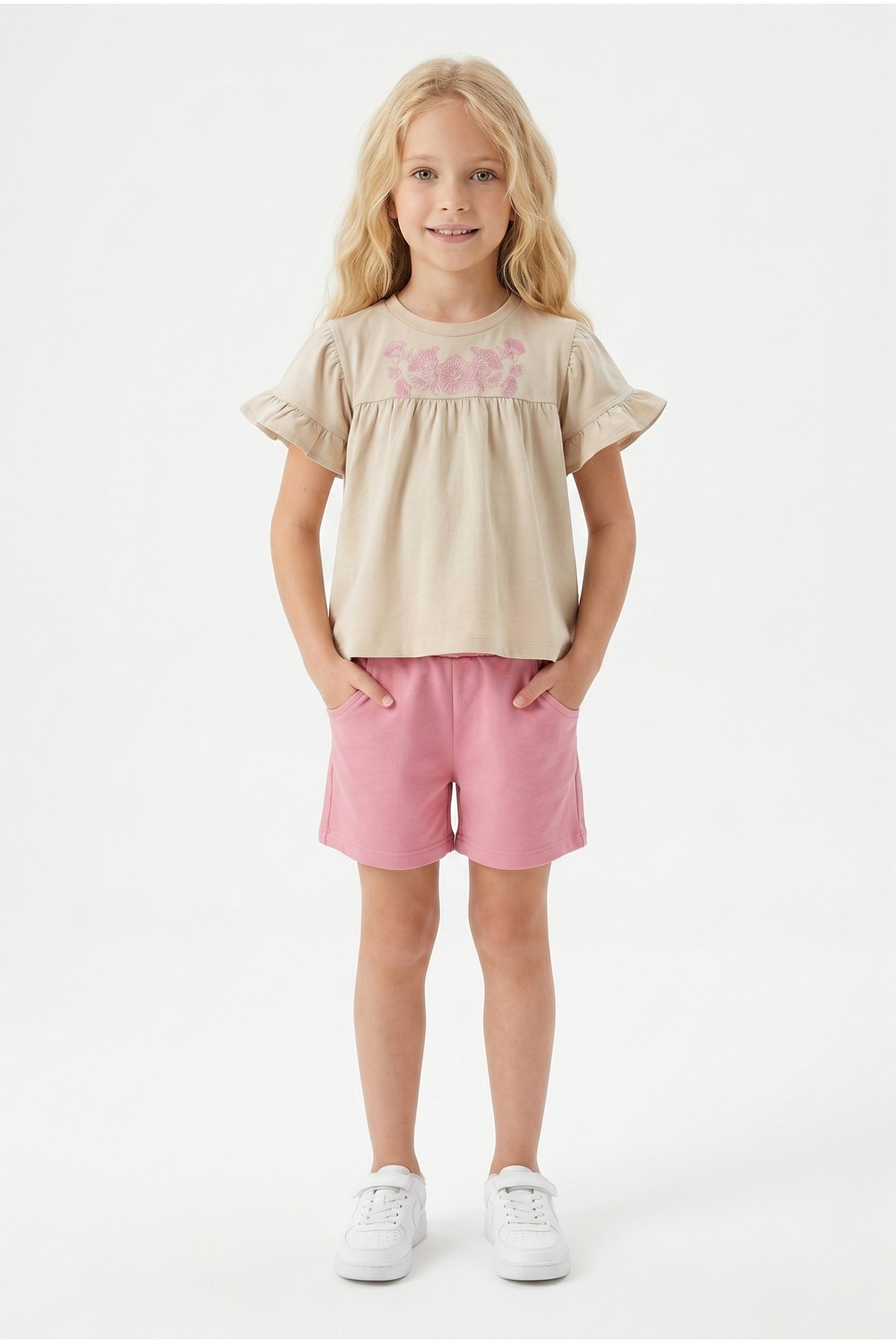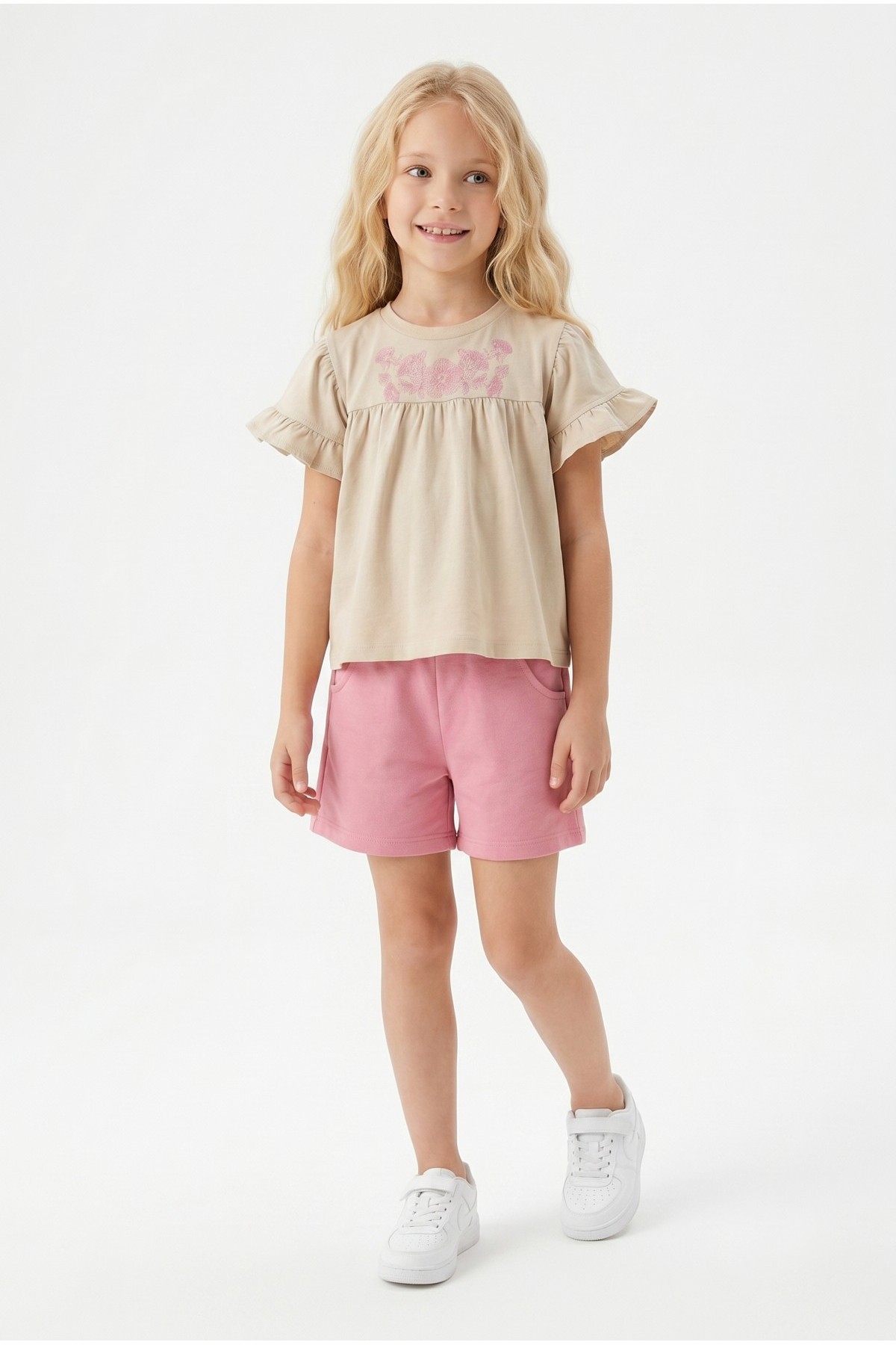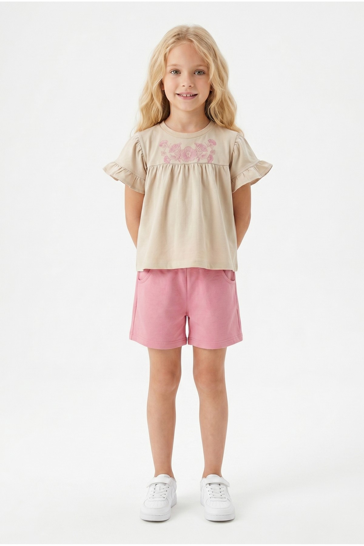 Kız Çocuk Çiçek Baskılı Omuz Fırfırlı 100% Pamuk Süprem Kumaş Tişört İki İplik Bel Büzgülü Şortlu Takım