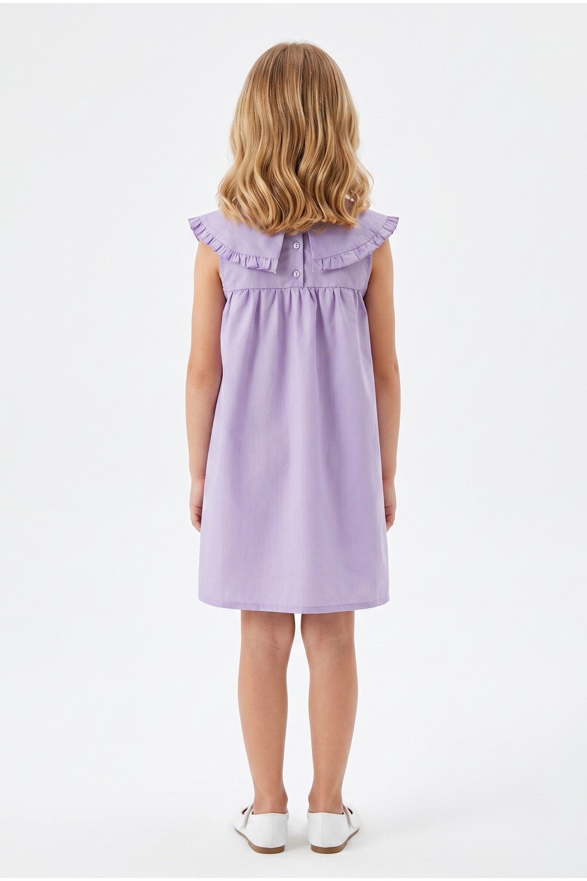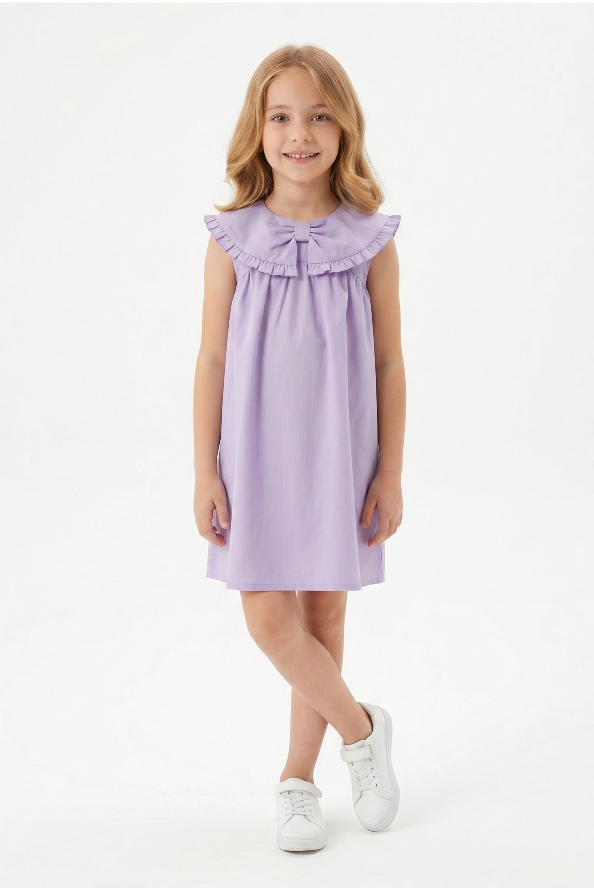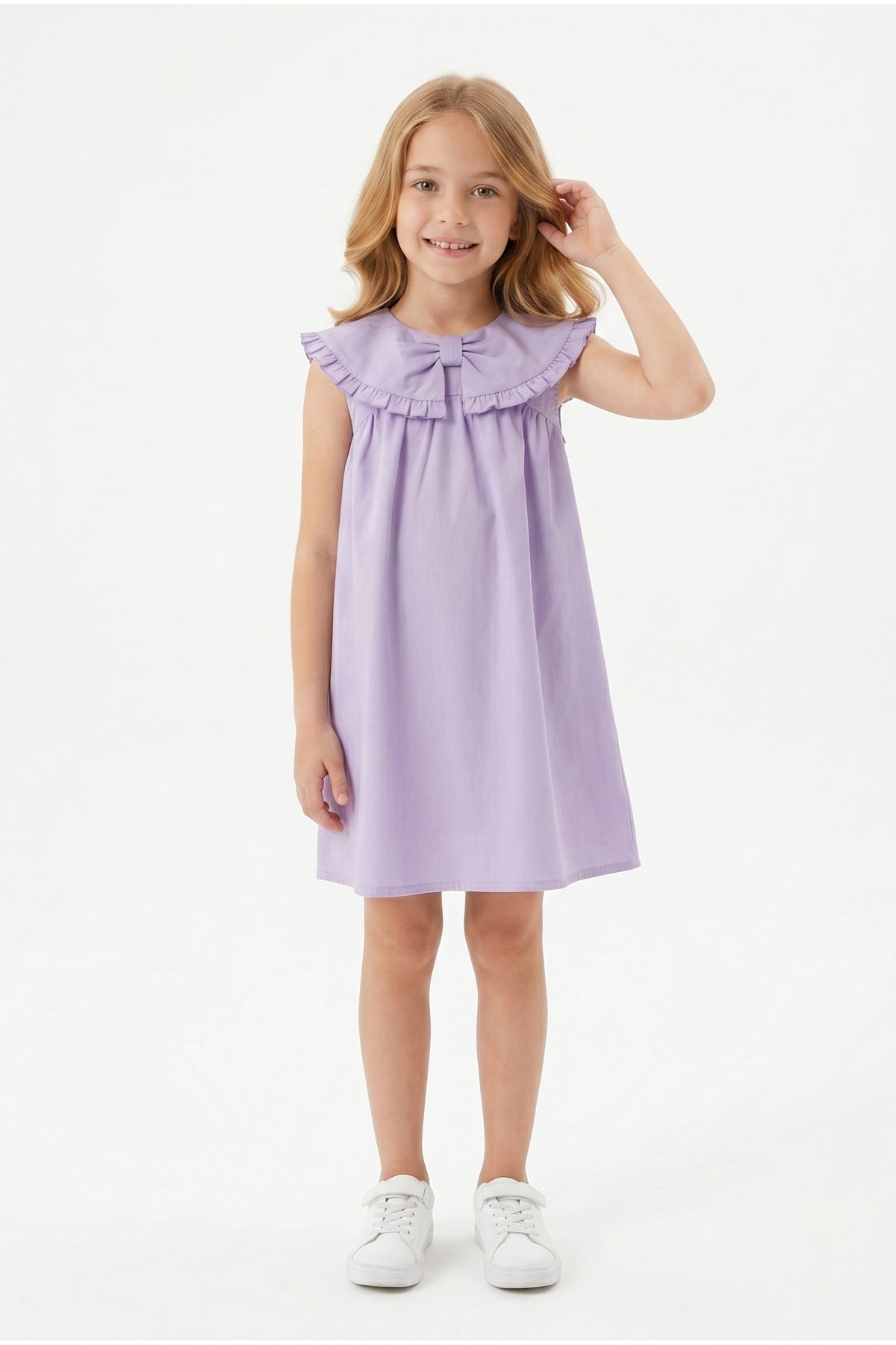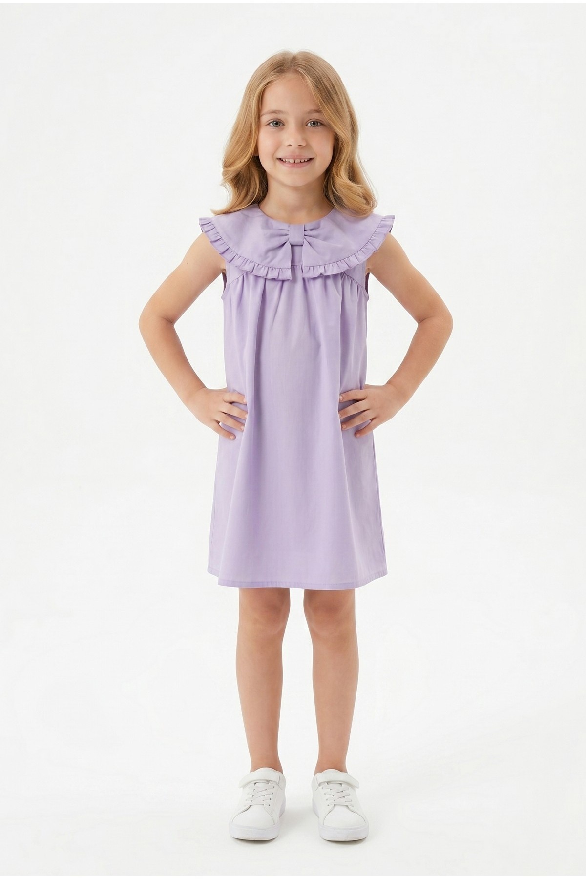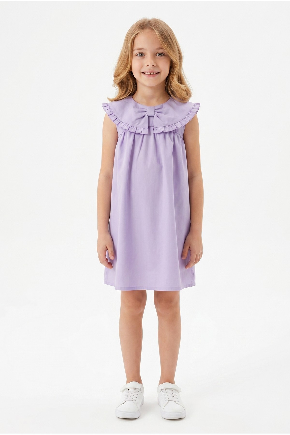 Kız Çocuk %100 Pamuk Poplin Kumaş Ön Fiyonklu Yaka Fırfırlı Astarlı Arkası Düğmeli Sıfır Kol Elbise