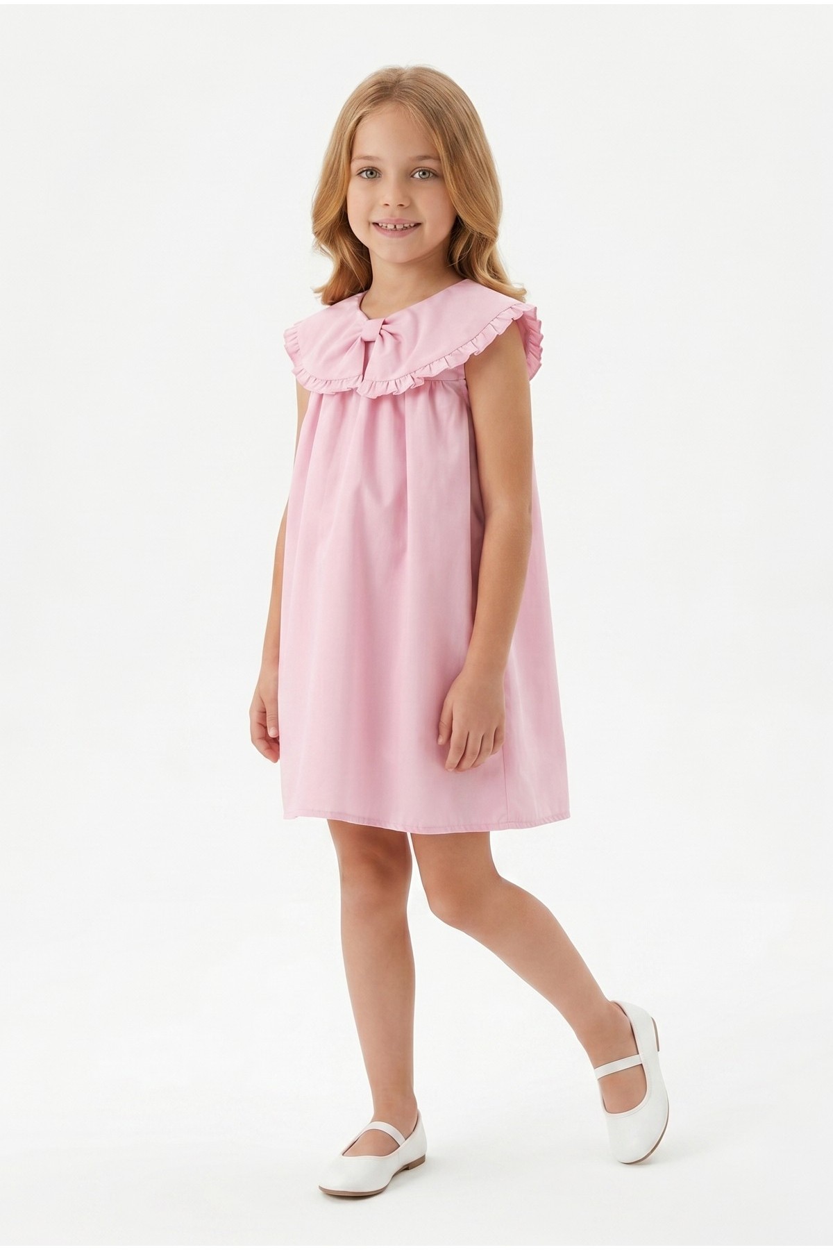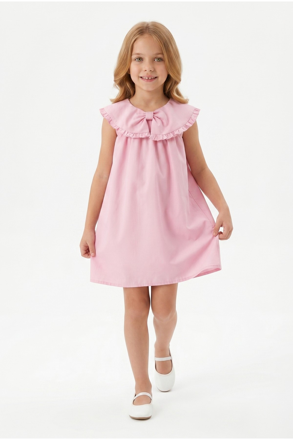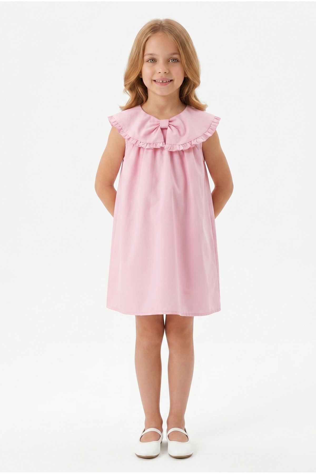 Kız Çocuk %100 Pamuk Poplin Kumaş Ön Fiyonklu Yaka Fırfırlı Astarlı Arkası Düğmeli Sıfır Kol Elbise
