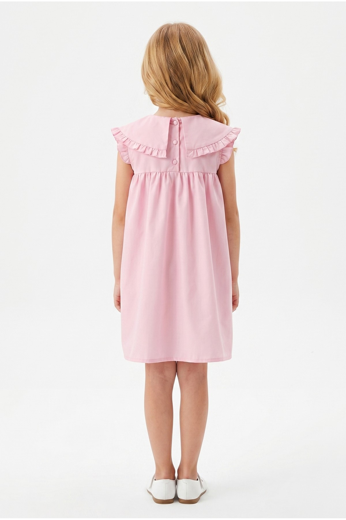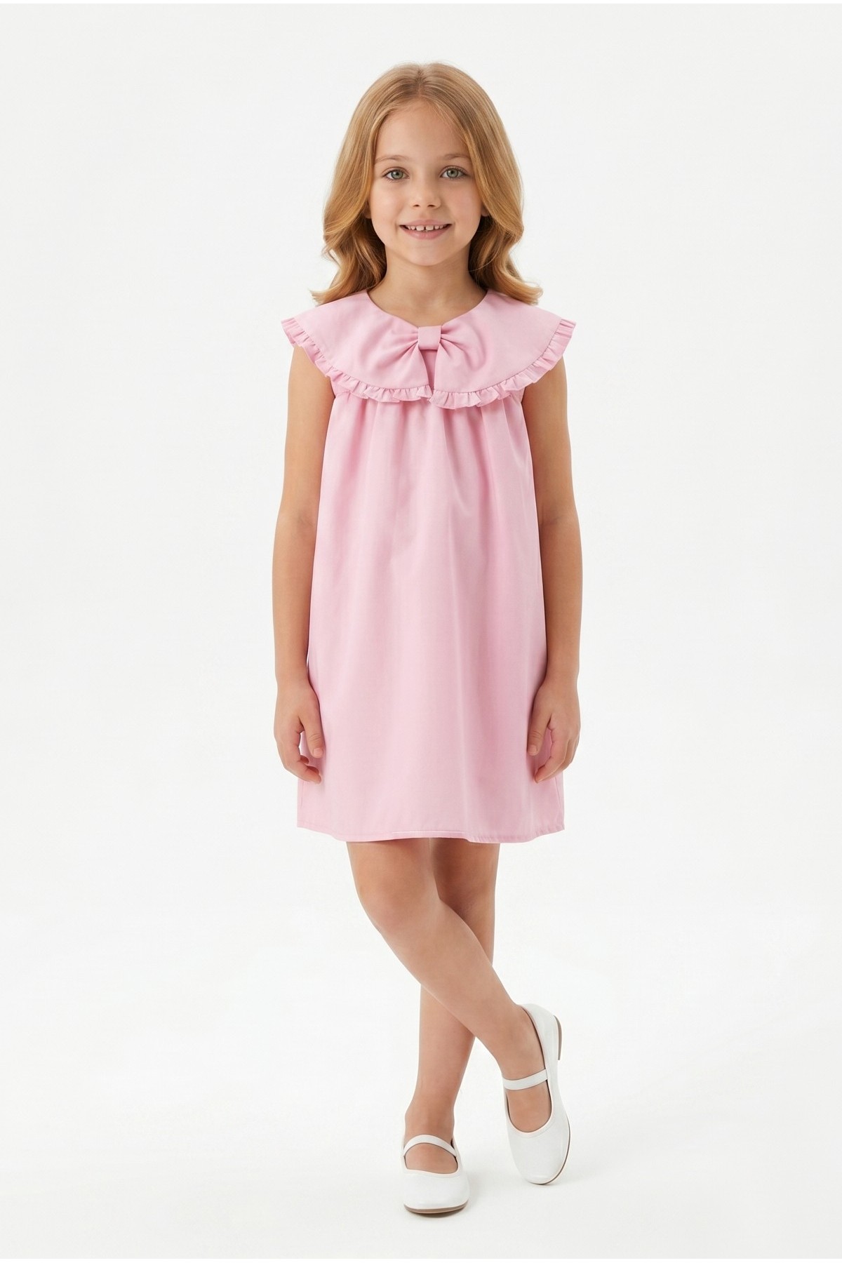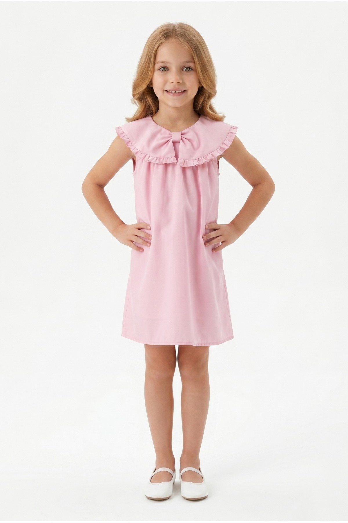 Kız Çocuk %100 Pamuk Poplin Kumaş Ön Fiyonklu Yaka Fırfırlı Astarlı Arkası Düğmeli Sıfır Kol Elbise