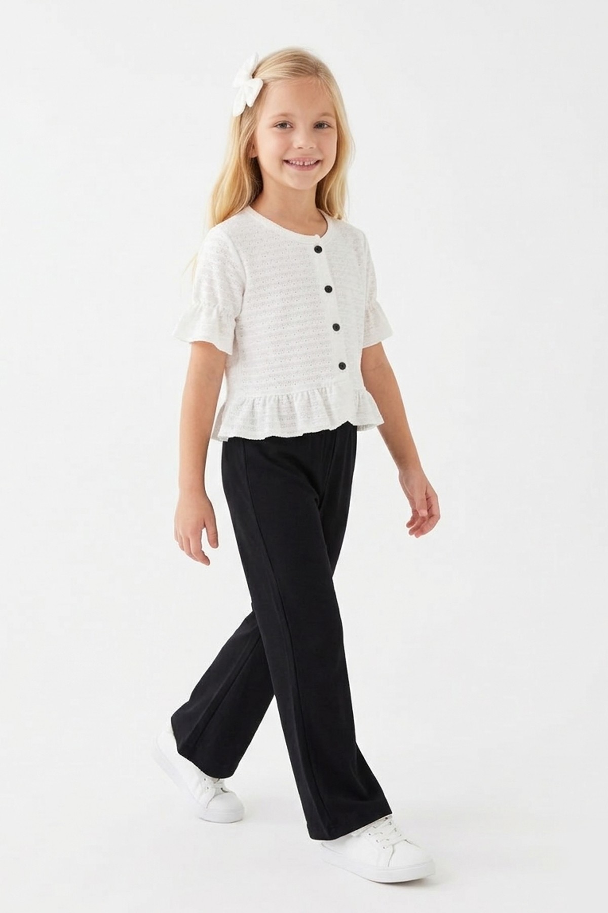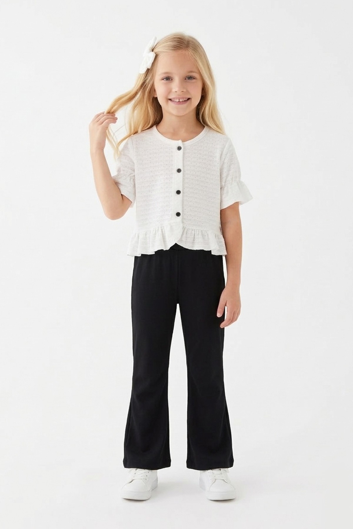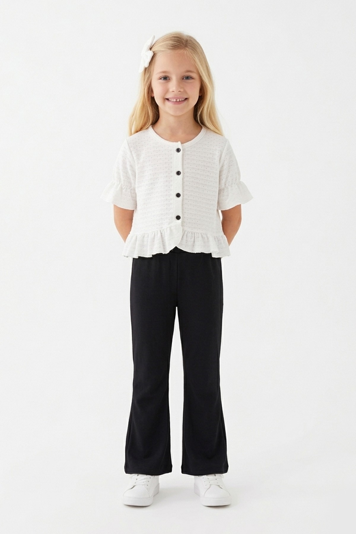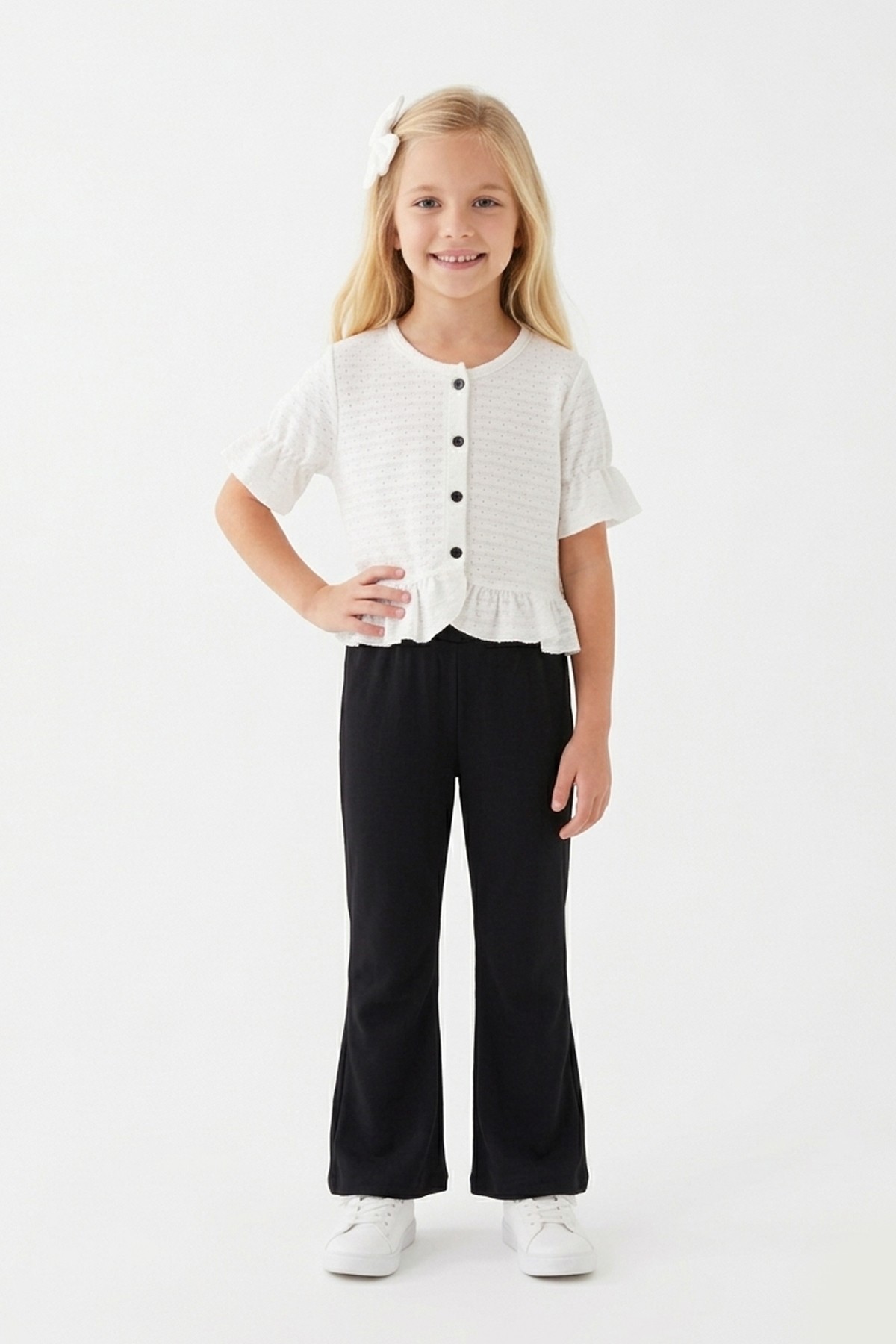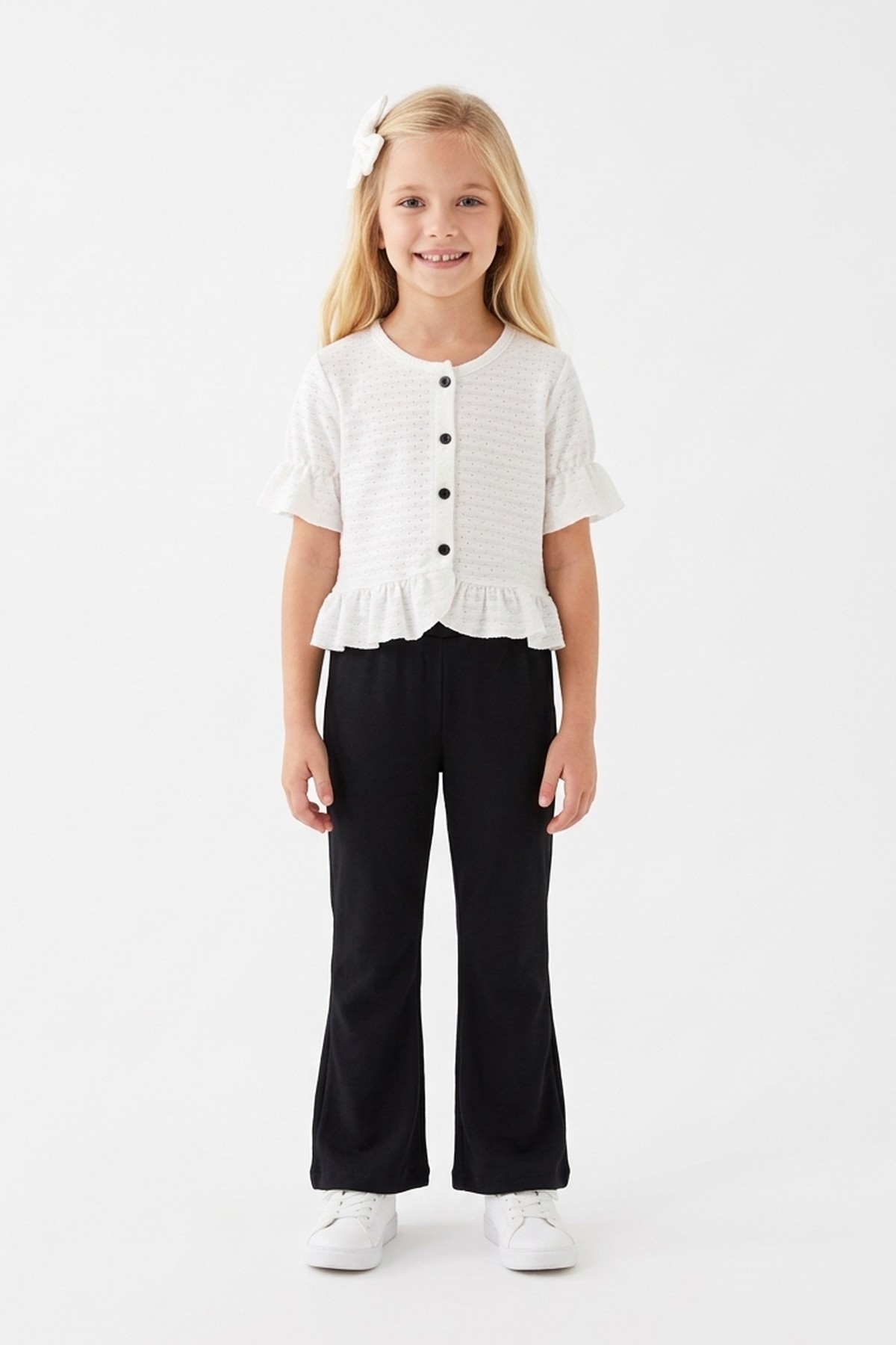 Kız Çocuk Delikli Düğmeli Kısa Kollu Bluz Ve İspanyol Paça Pantolon Takım
