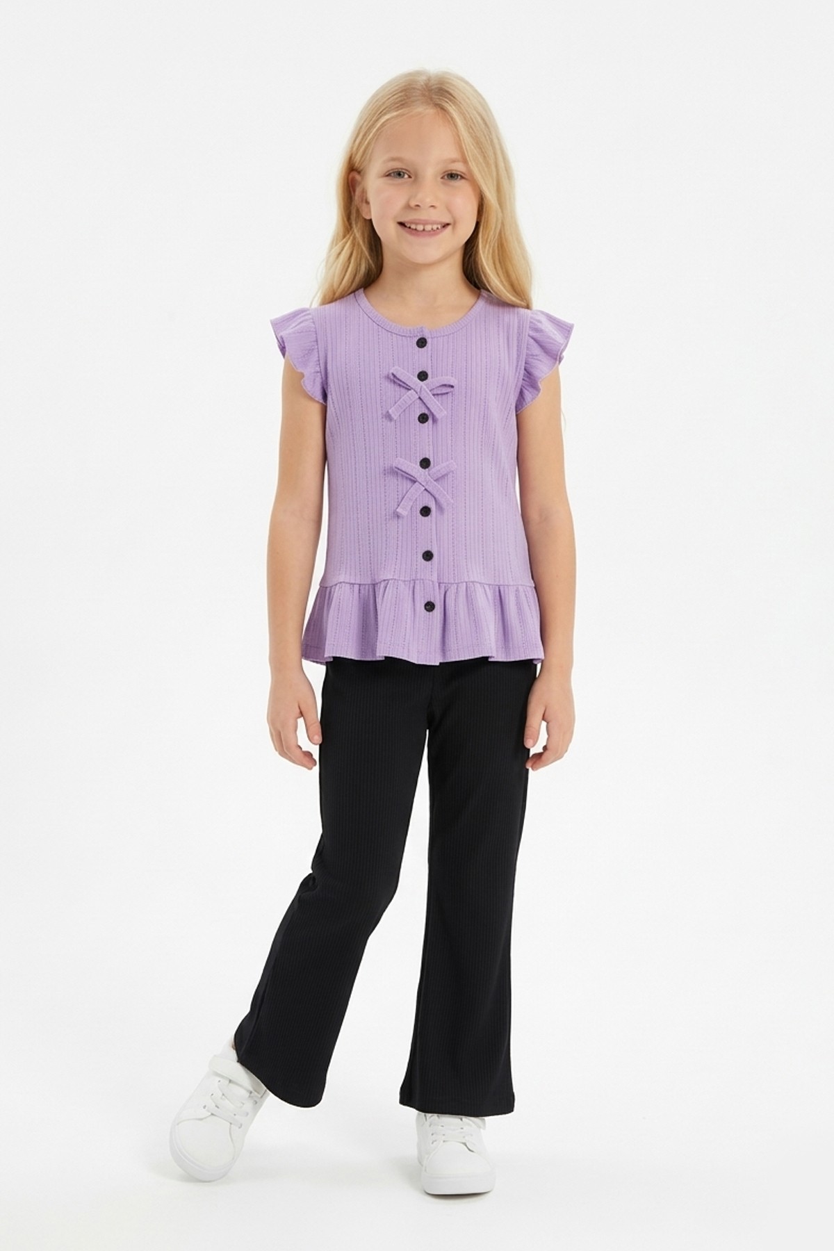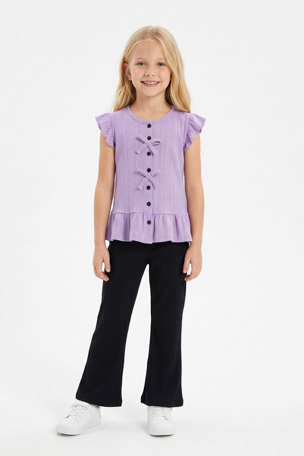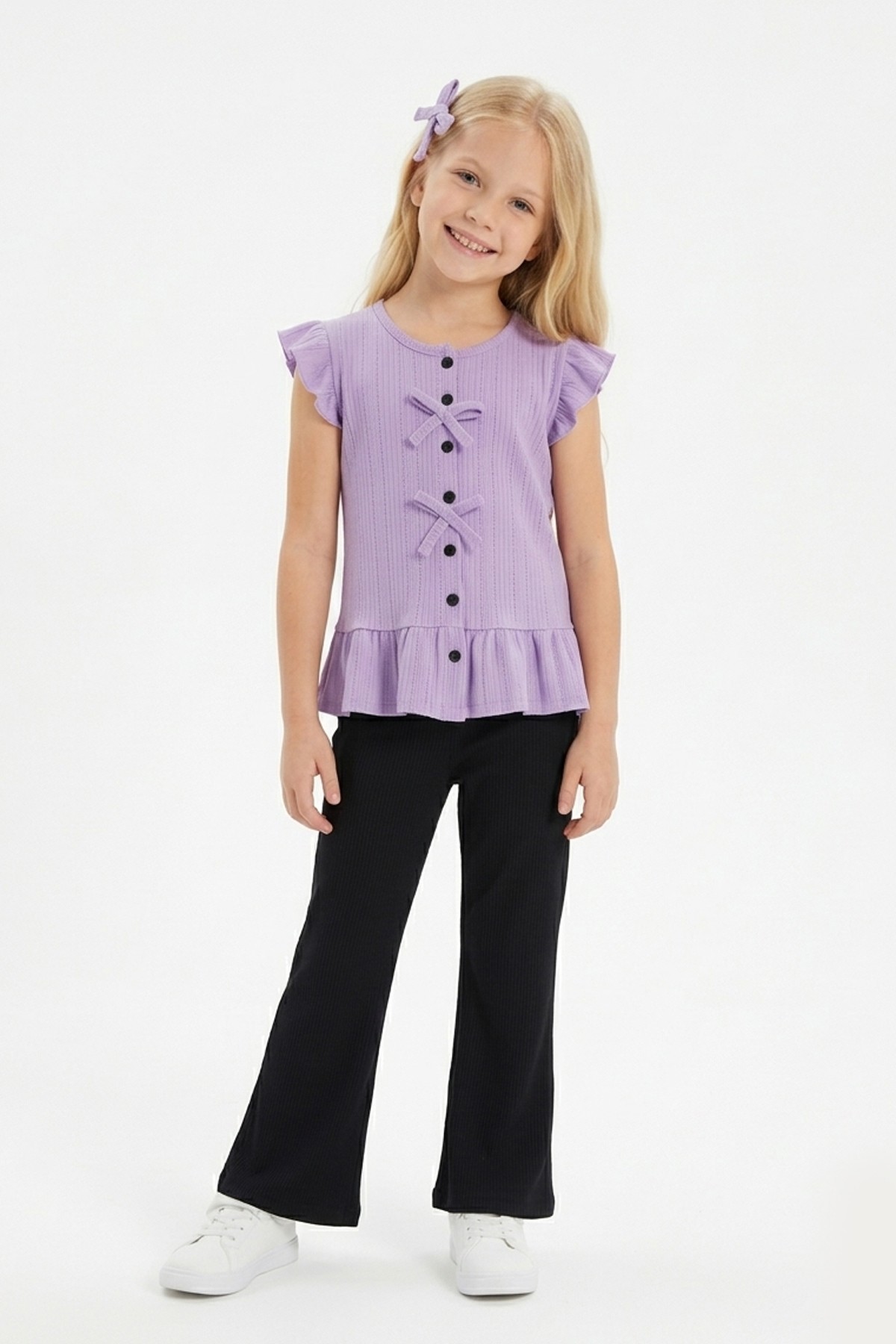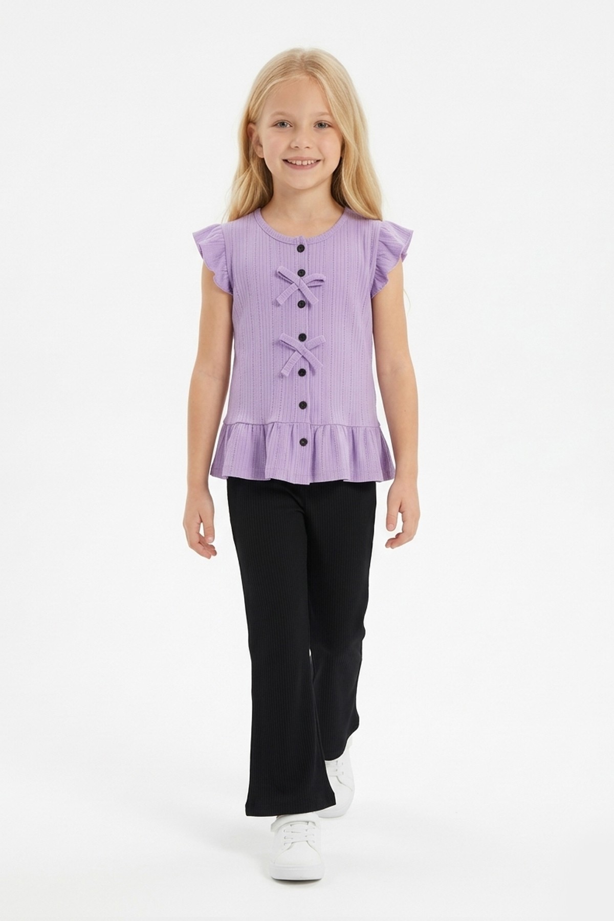 Kız Çocuk Kolsuz Fiyonk Detaylı Düğmeli Bluz Ve İspanyol Paça Pantolon Takım